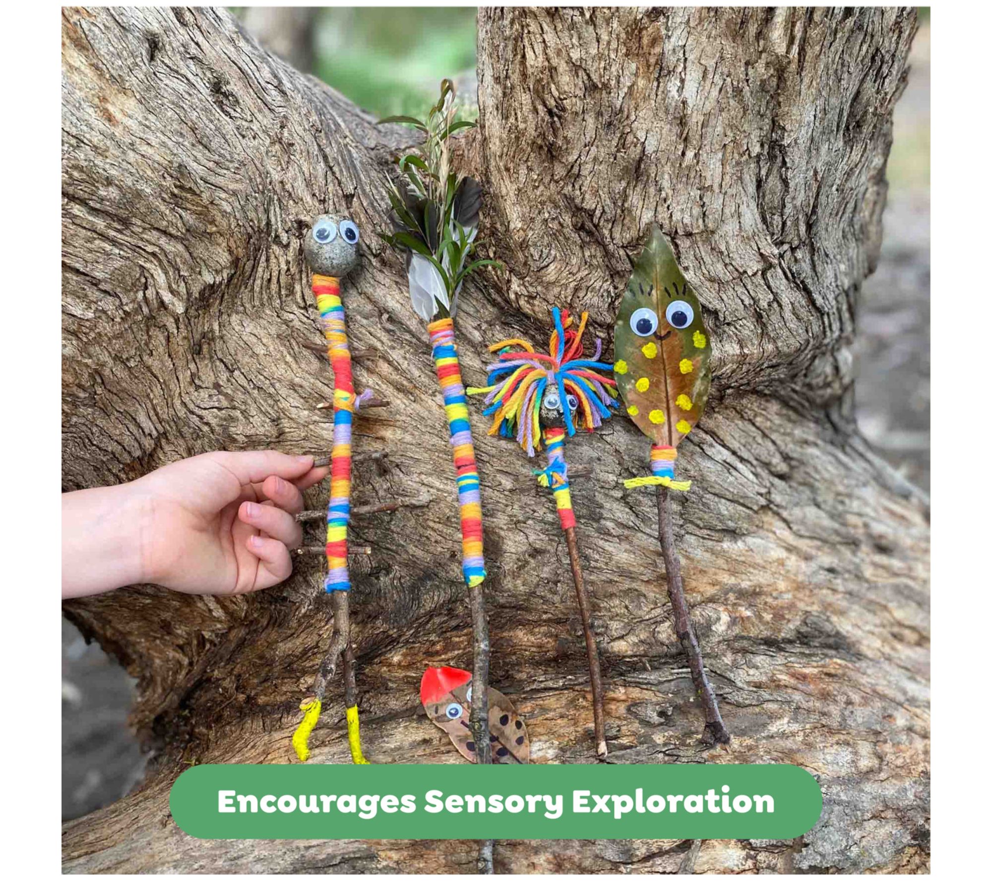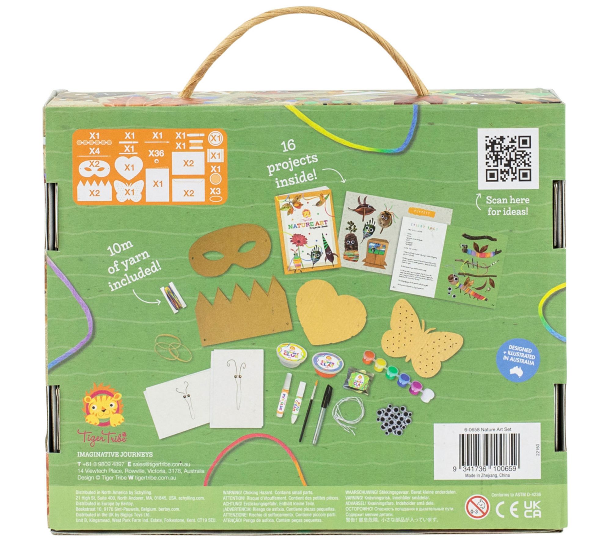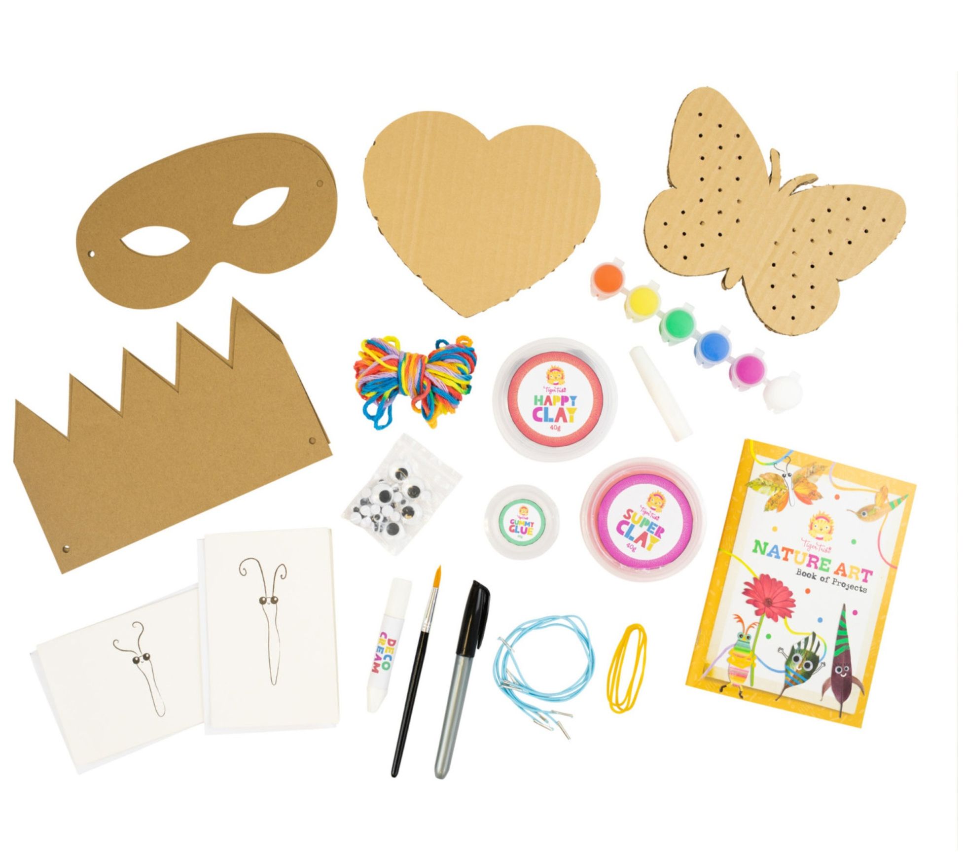 • Includes full-color 32-page Nature Art activities book, two clay pots, sticky base, googly eyes, six mini paint pots, paint brush, threading butterfly, two masks, two crowns, four elastic fasteners, envelope, rainbow yarn, PVA glue, black marker, deco cream