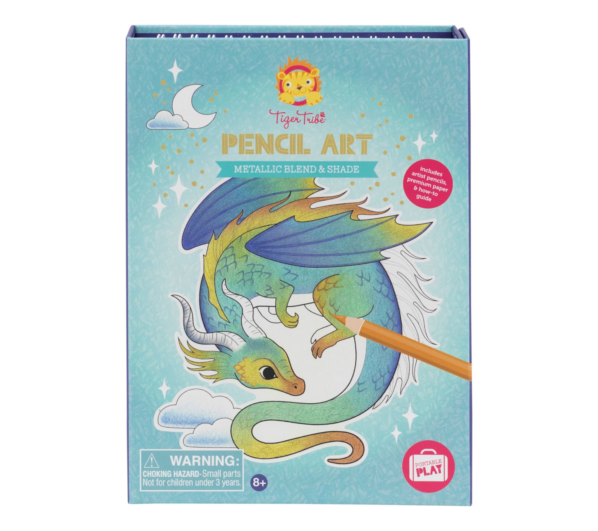 Elevate your child's artistic skills with the Tiger Tribe pencil art set. This shimmery collection teaches techniques like color blending and hatching, bringing magical illustrations to life. It's perfect for creative play on-the-go or at home. From Tiger Tribe.