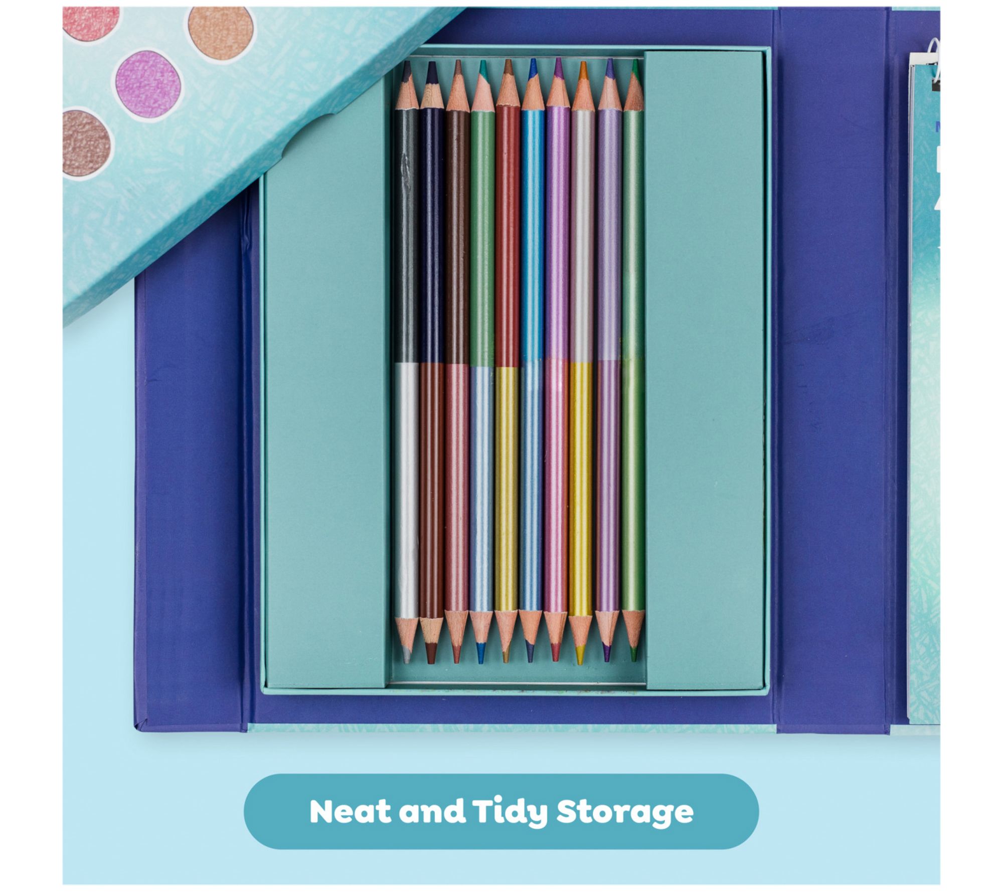 • Includes technique manual, 20 coloring pages on premium paper, nine double-sided metallic pencils (18 colors total), blend and shade pencil (2 colors), compact magnetic sealed storage box