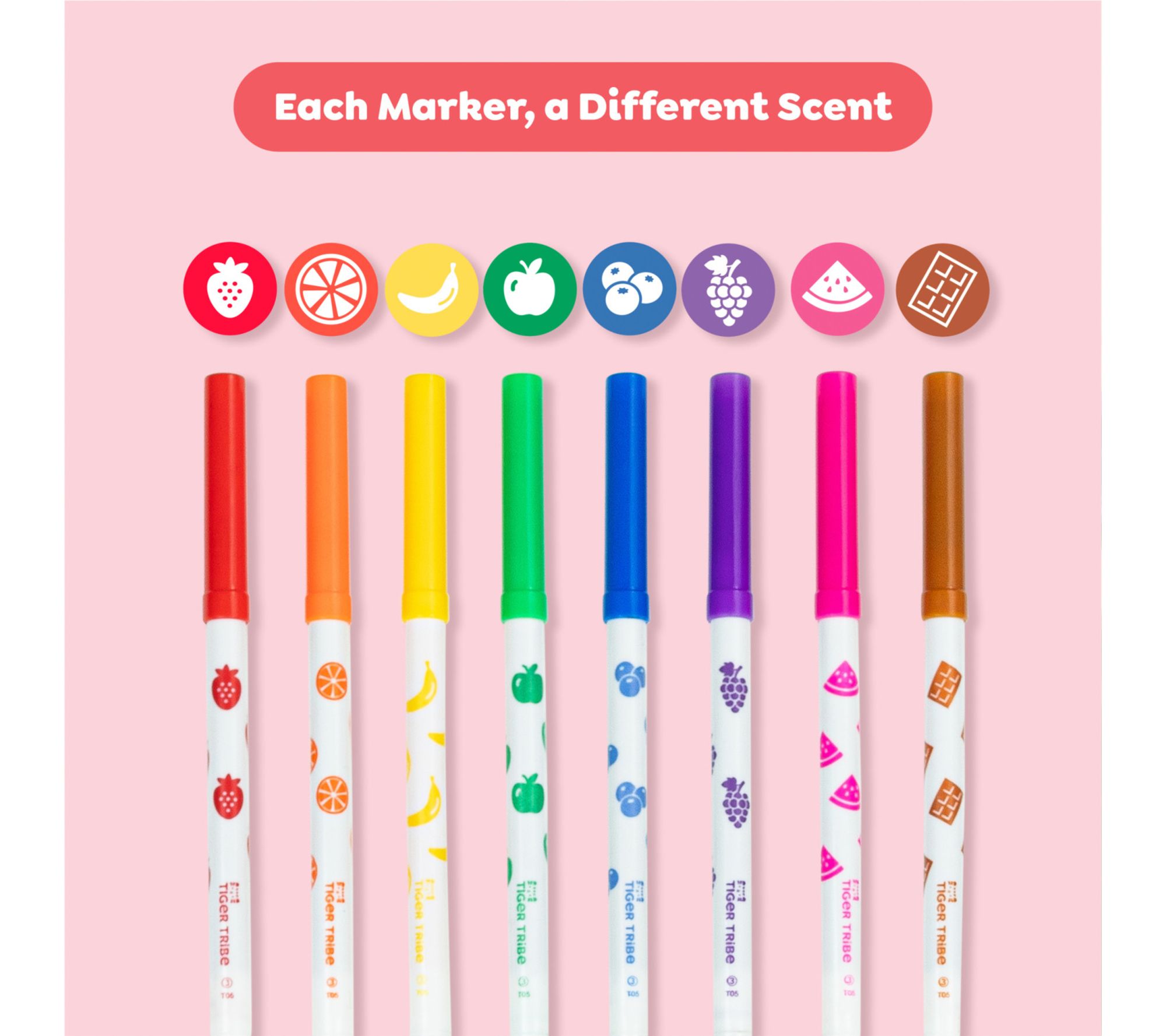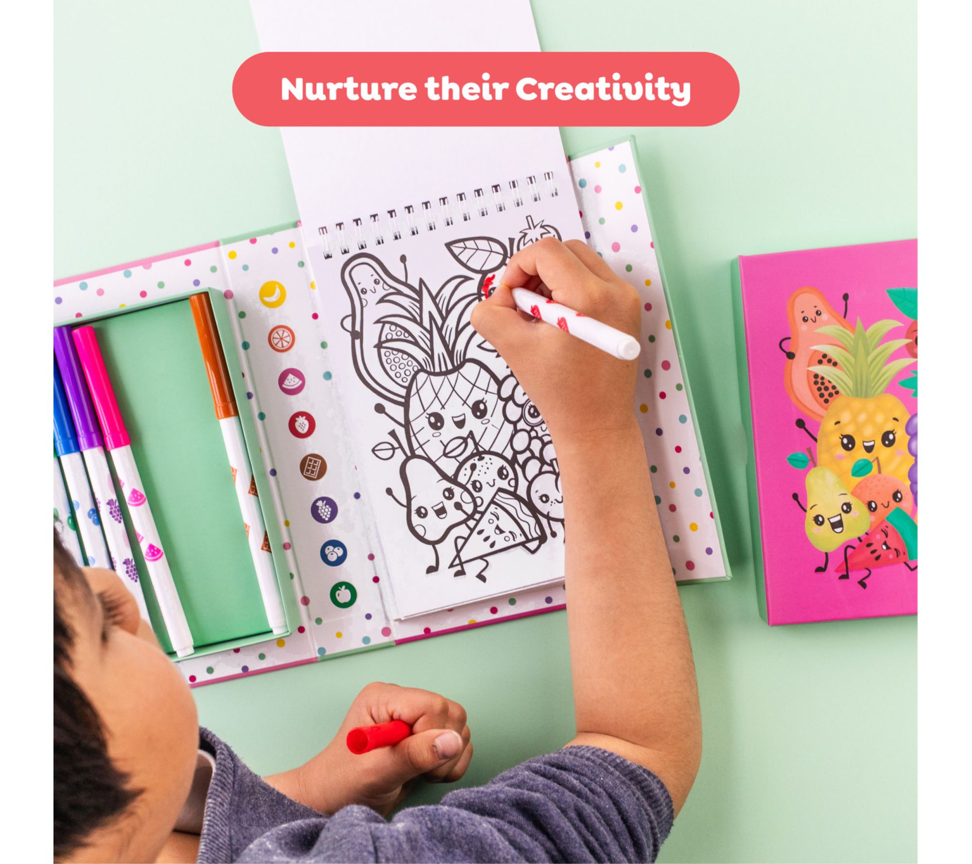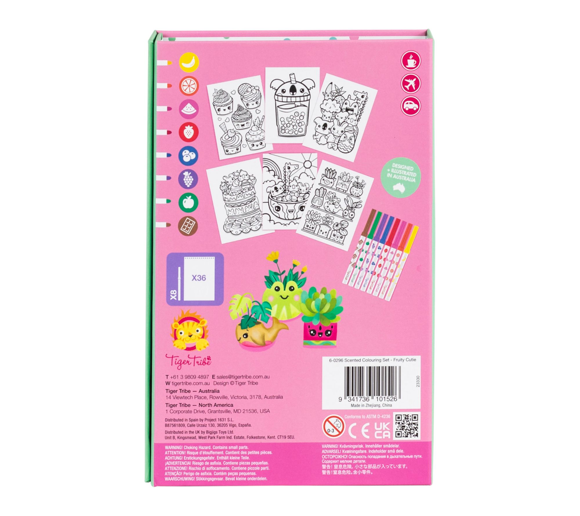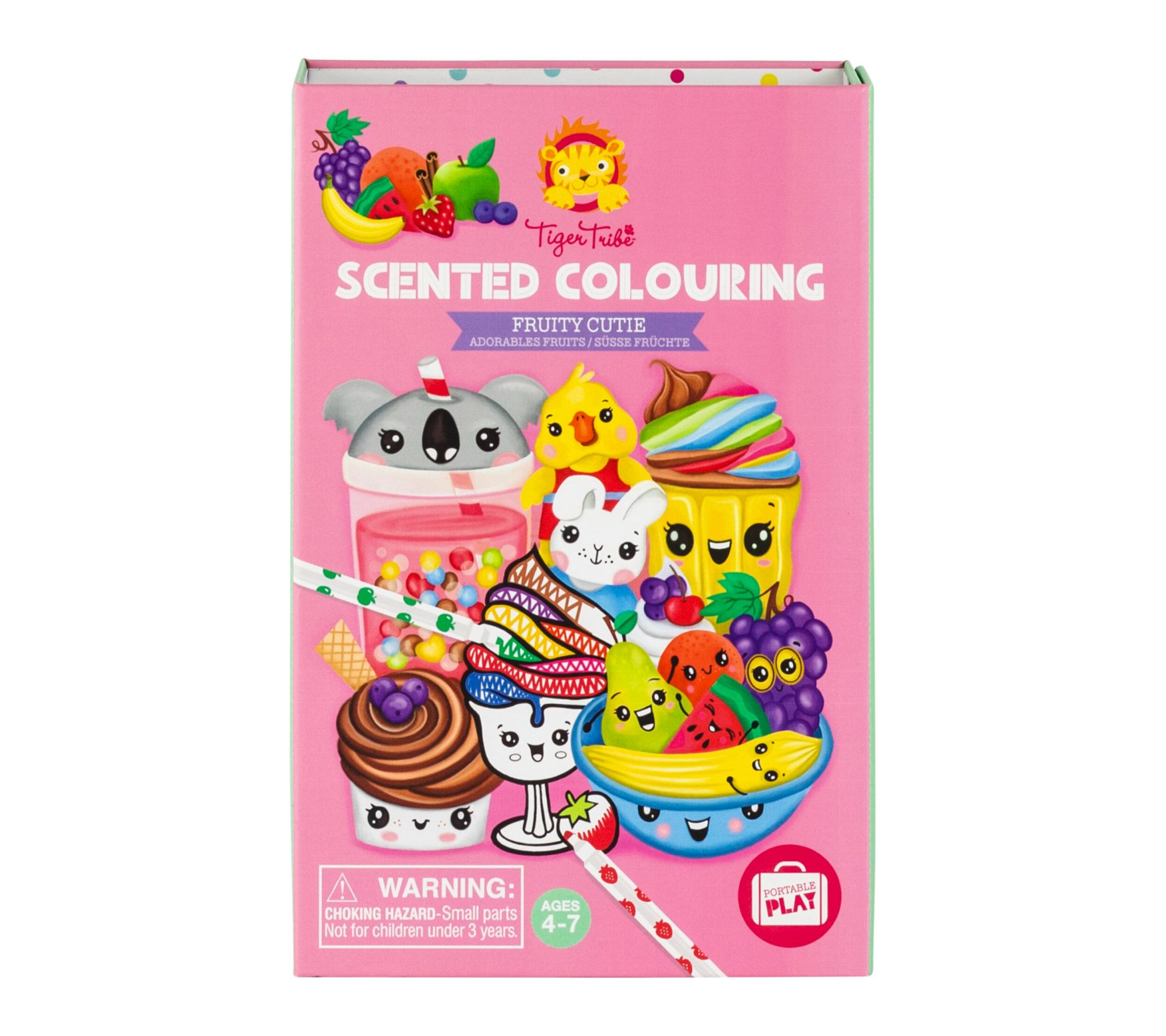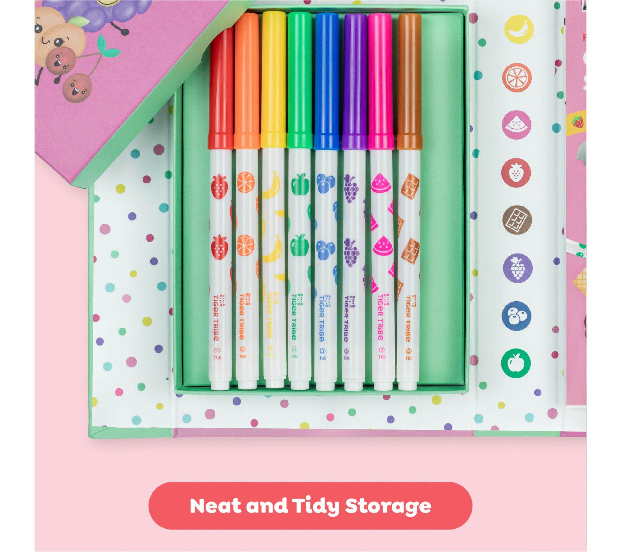 Kids can explore a world of fruity scents and vibrant colors, whether they're on the go or gathered around the kitchen table, with this arts and crafts coloring set. Markers bring playful aromas like lemon, strawberry, and chocolate as imaginations take off through 36 pages of adorable illustrations -- neatly stored in a handy magnetic-sealed box, ready for creativity anywhere life takes you. From Tiger Tribe.
