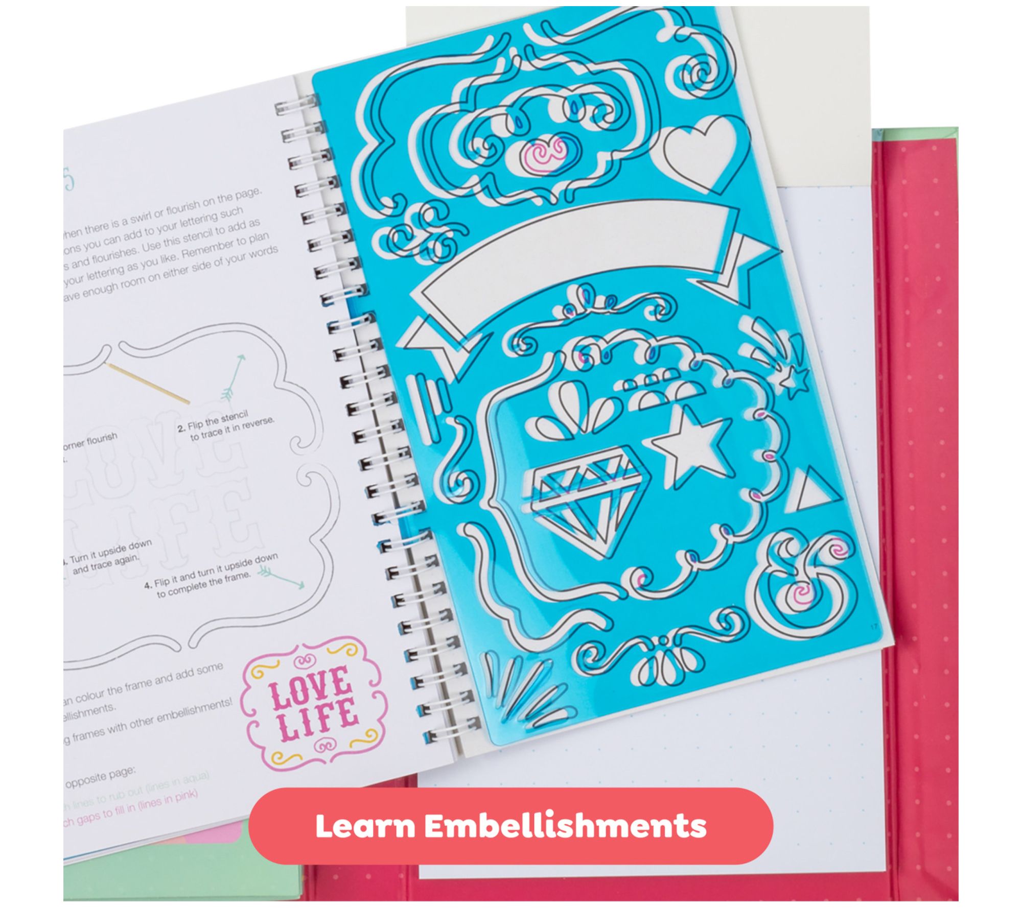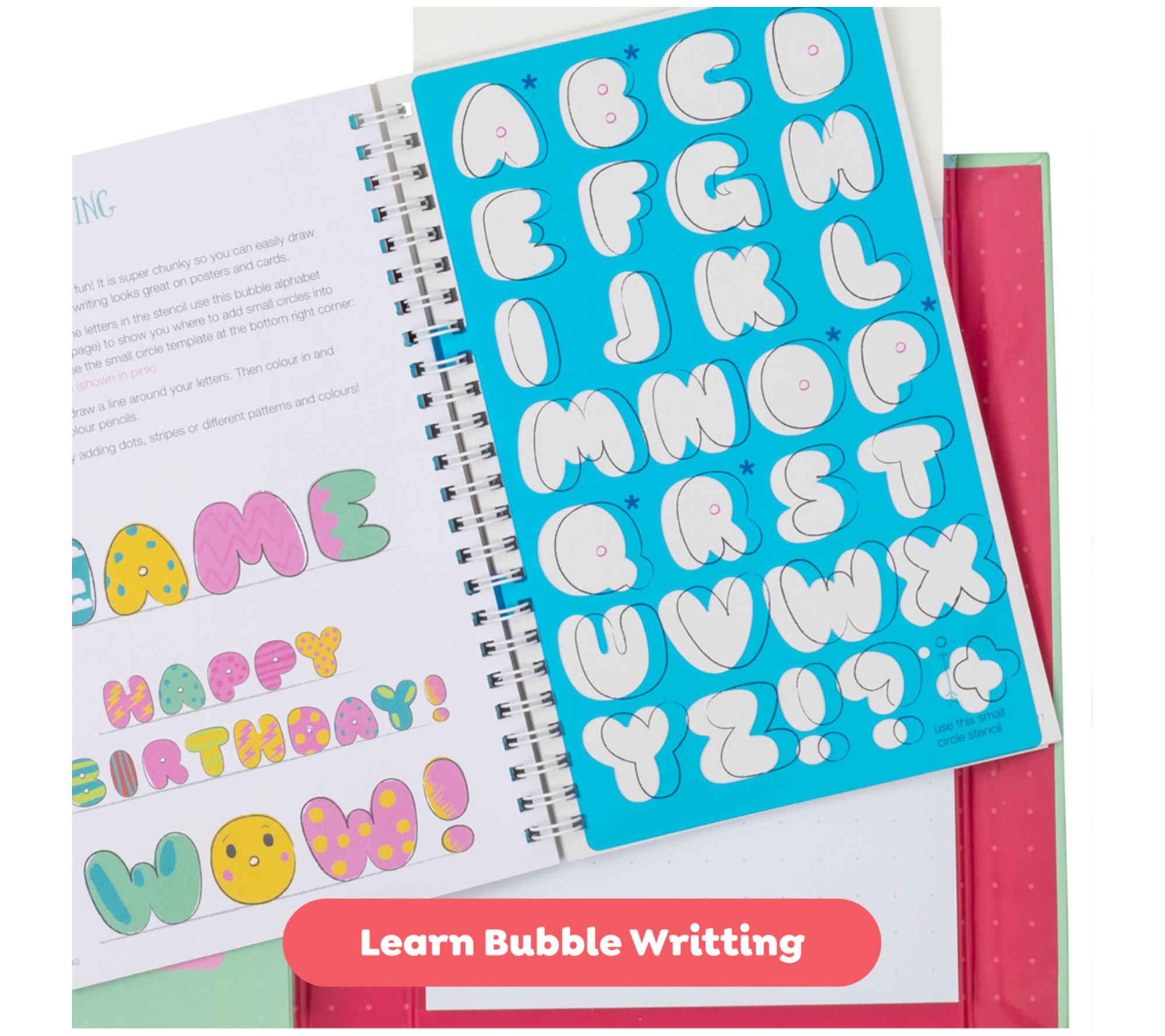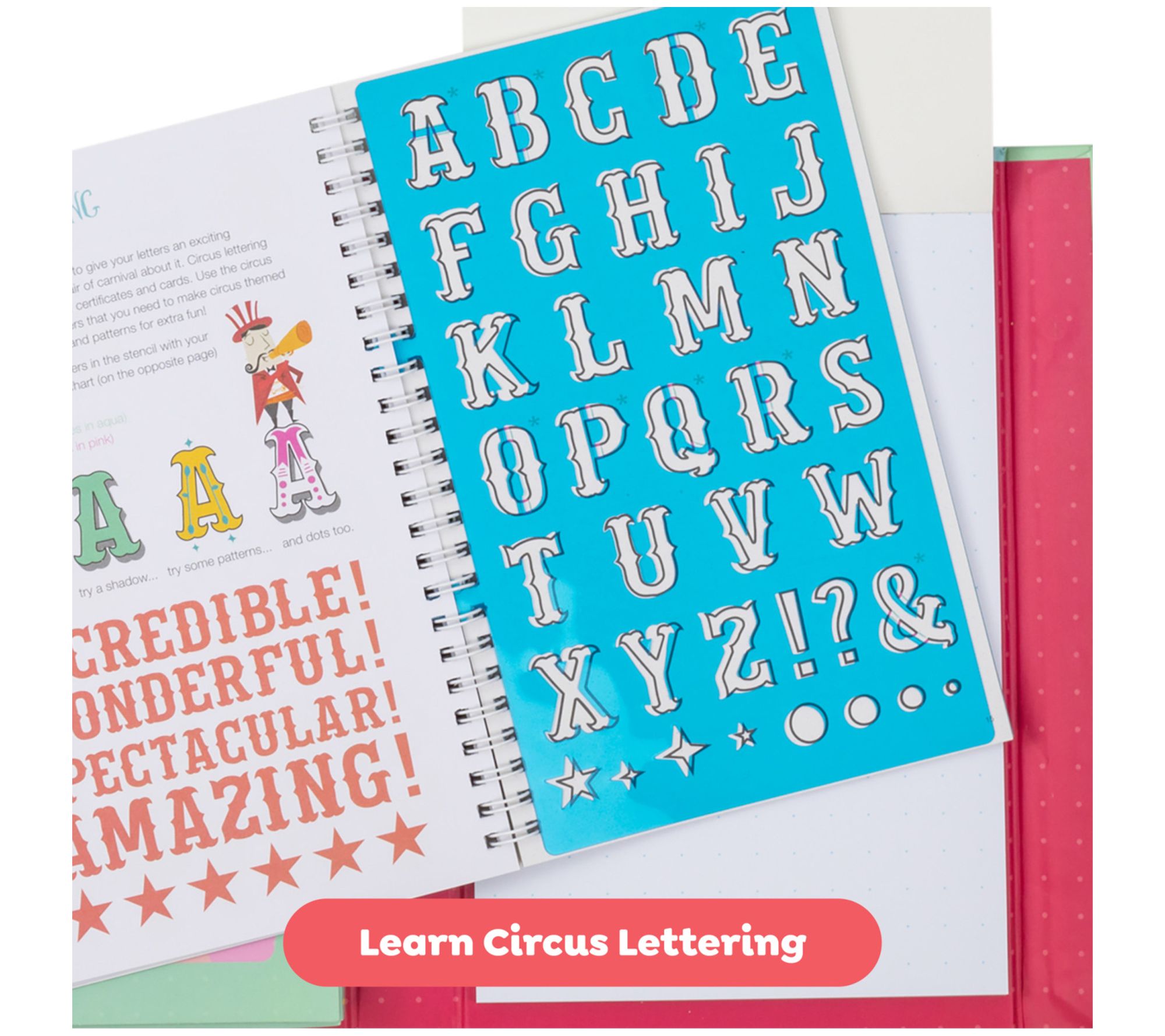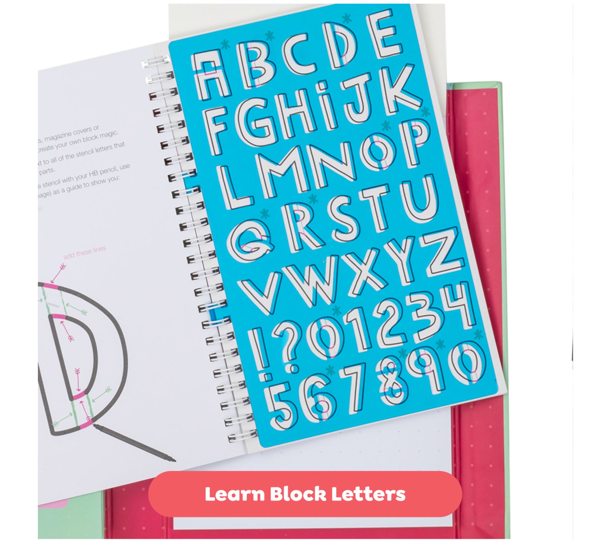 • Includes instructional lettering notebook, designer stencils, tracing paper, double-ended black pen, three double-ended color pencils, HB pencil, sharpener, eraser, and clear pencil case