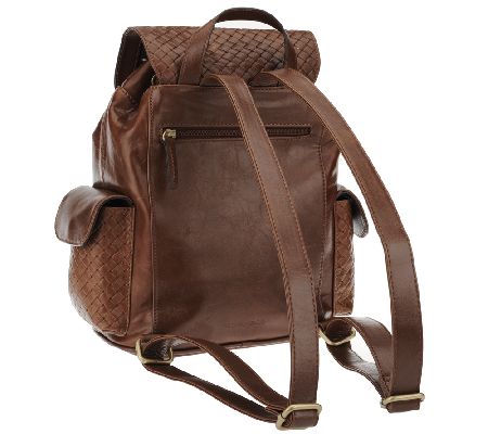 The backpack is back and better than ever. Embossed weave detail provides plenty of on-trend texture to this distressed leather backpack from Tignanello. Versatility is built in, with two slide adjustable shoulder straps, a double closure on the top, and plenty of pockets both inside and out. From Tignanello.