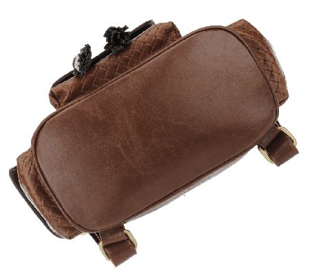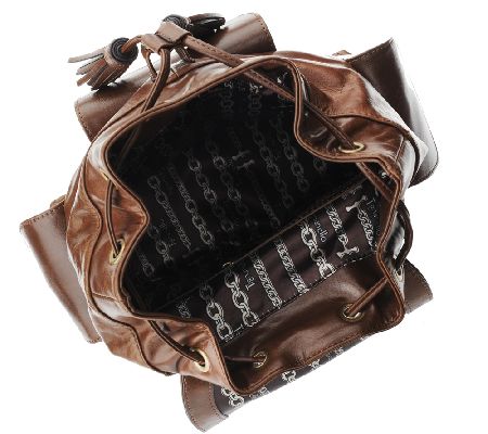 Distressed leather body, flap entry with magnetic snap closure and adjustable drawstring, two slide adjustable shoulder straps, finger loop, front flap pocket with magnetic snap closure, two side flap pockets with magnetic snap closure, back zip pocket, antiqued goldtone hardware
