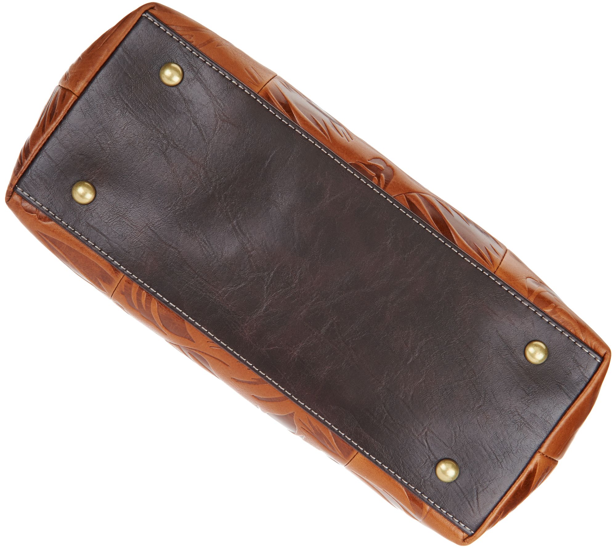 Palm-embossed glazed body, double handles, fully detachable shoulder strap, top zip entry, front slip pocket, back slip pocket, antiqued brasstone hardware, bottom feet
