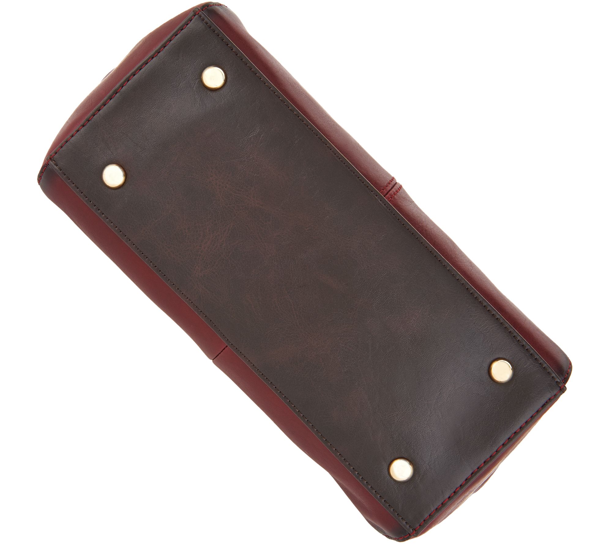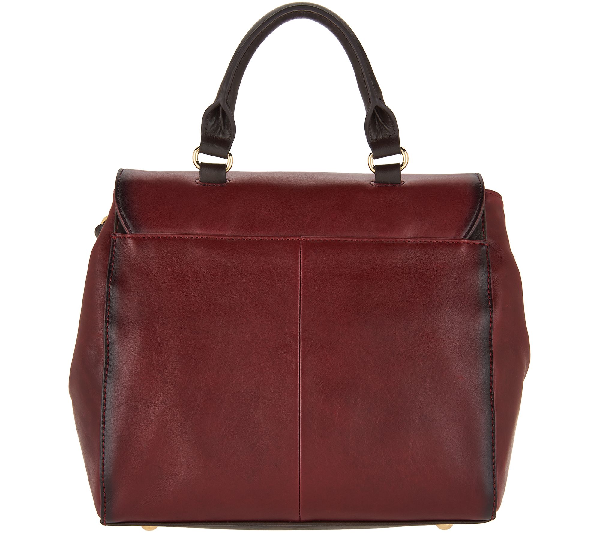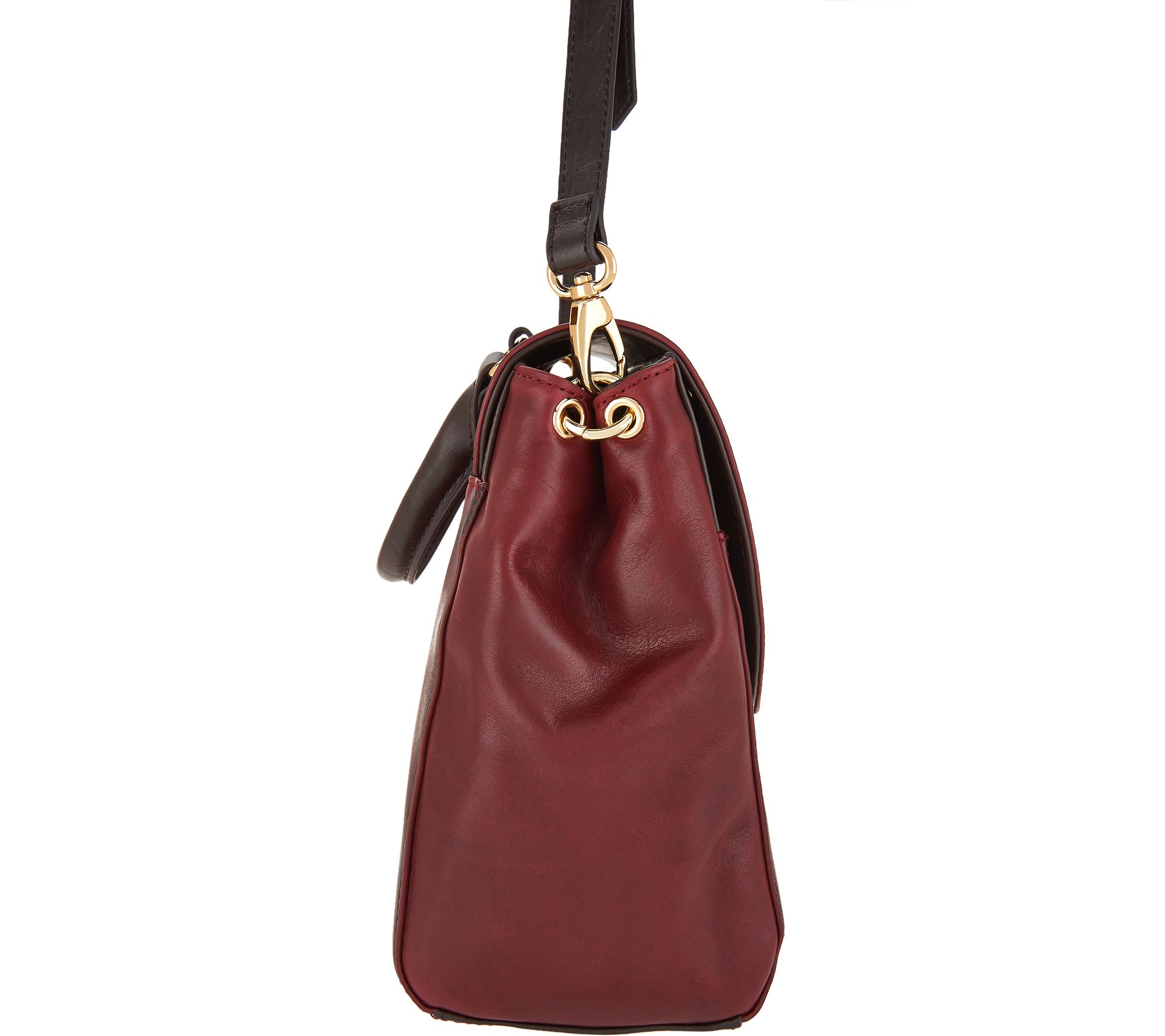 • Flap closure at top entry with magnetic snap, rolled handle, adjustable/removable crossbody strap with buckle detail, two slip pockets on front panel, bottom feet, goldtone hardware