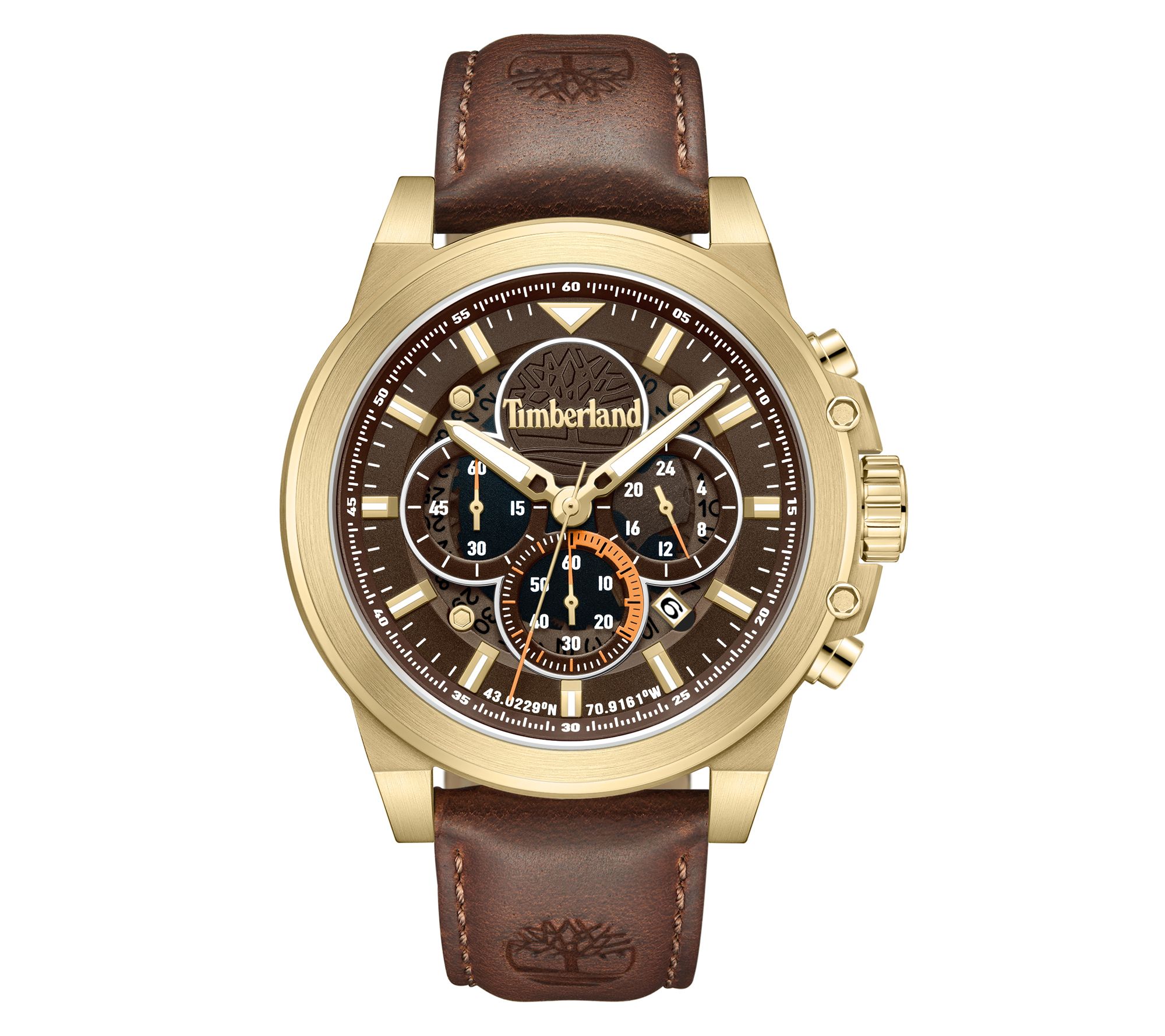 Ready for the challenge -- morning meetings to weekend hikes -- this bold timepiece keeps pace with your adventures. A matte brown dial pairs with goldtone stainless and a rugged leather strap for an eye-catching, comfortable fit. Multifunction movement, luminous markers, and Timberland's iconic logo bring sport and style together, wherever you go. From Timberland.