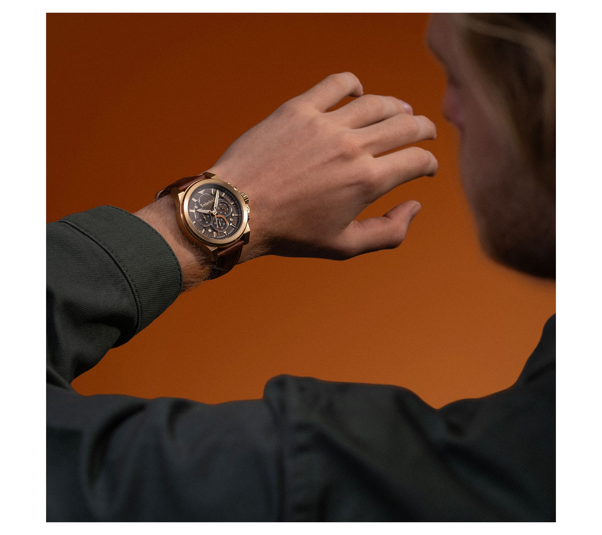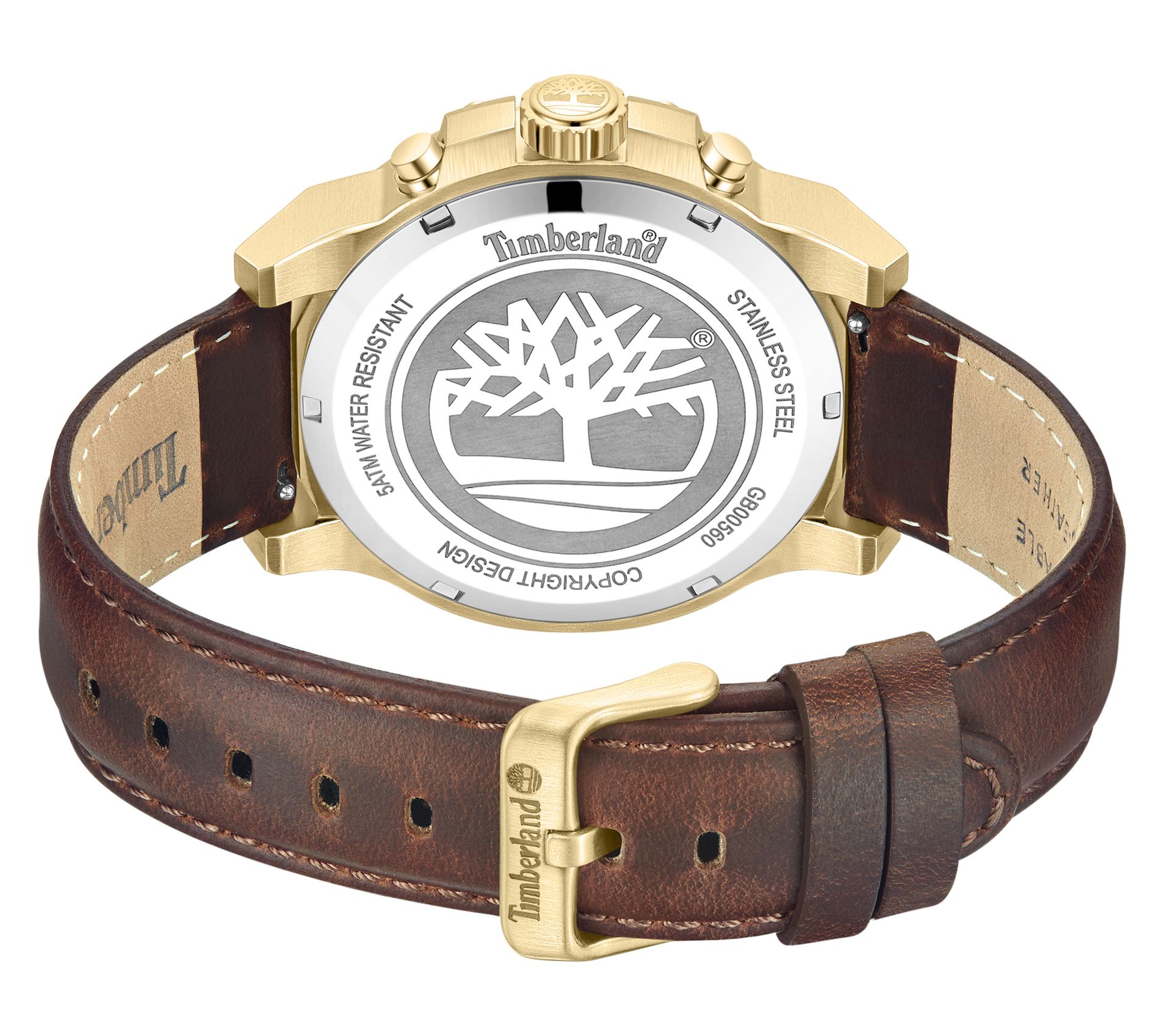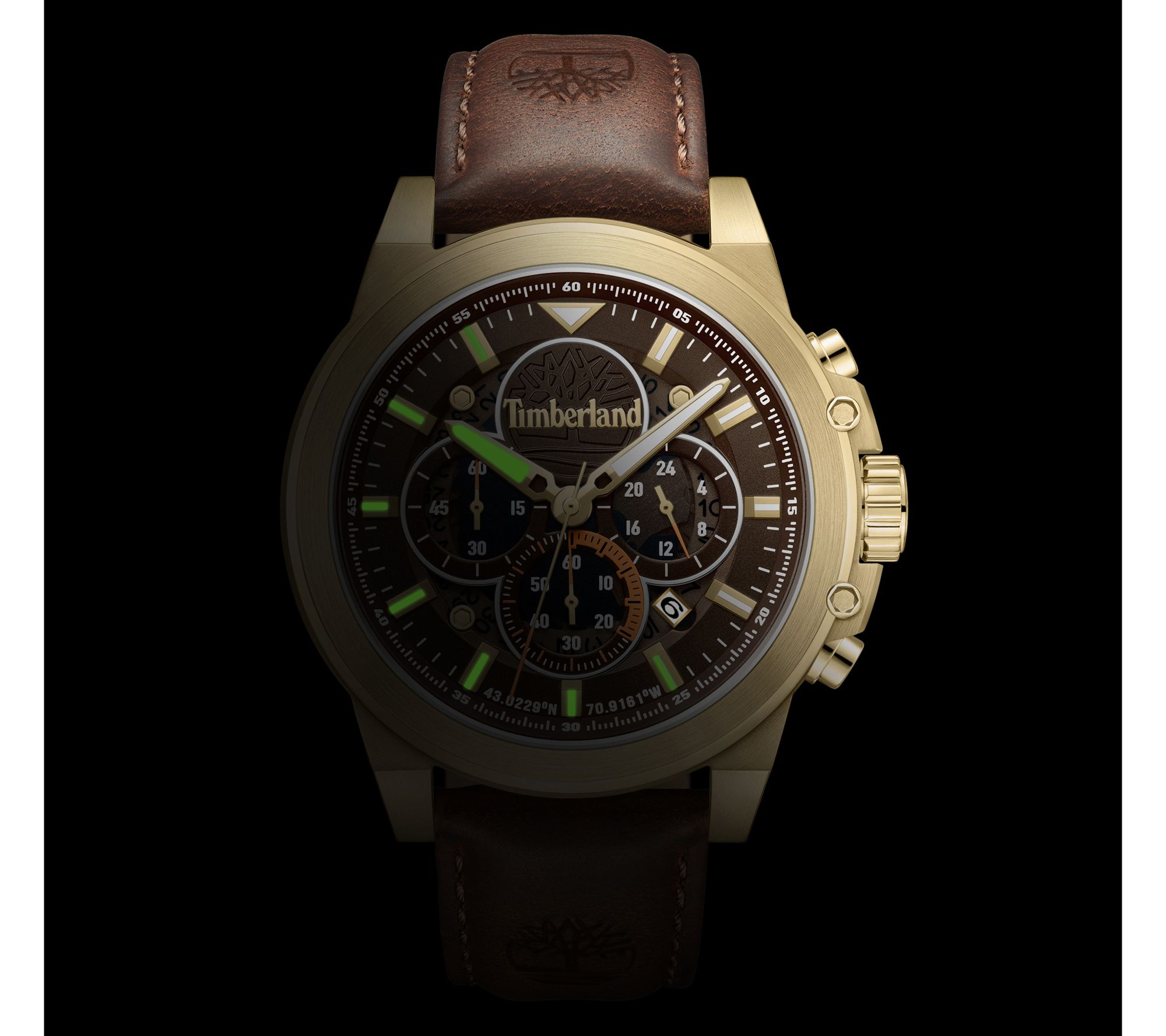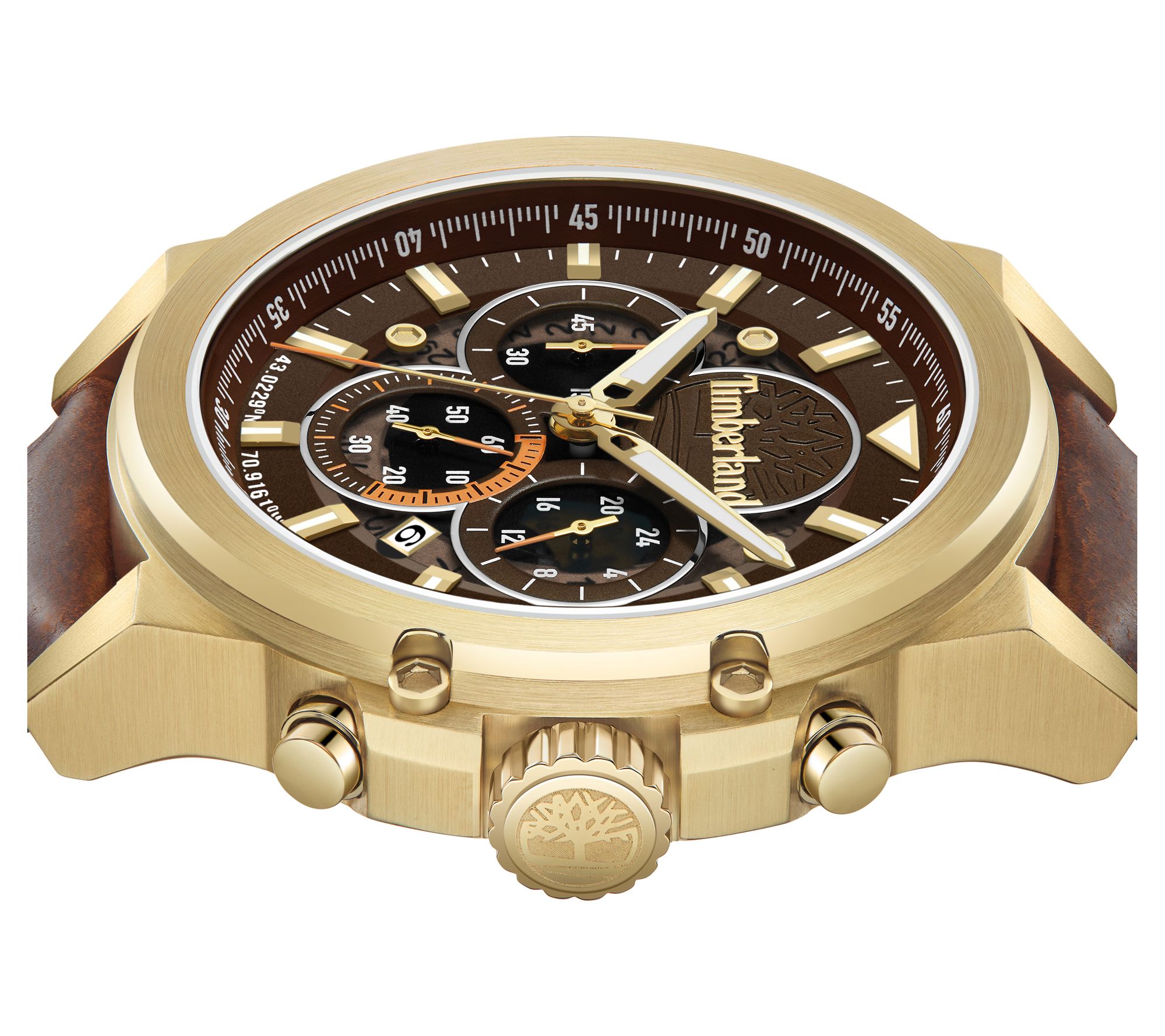 • Brown dial; luminous 3D hour markers with sub-dials; Timberland logo at 12; multifunction movement