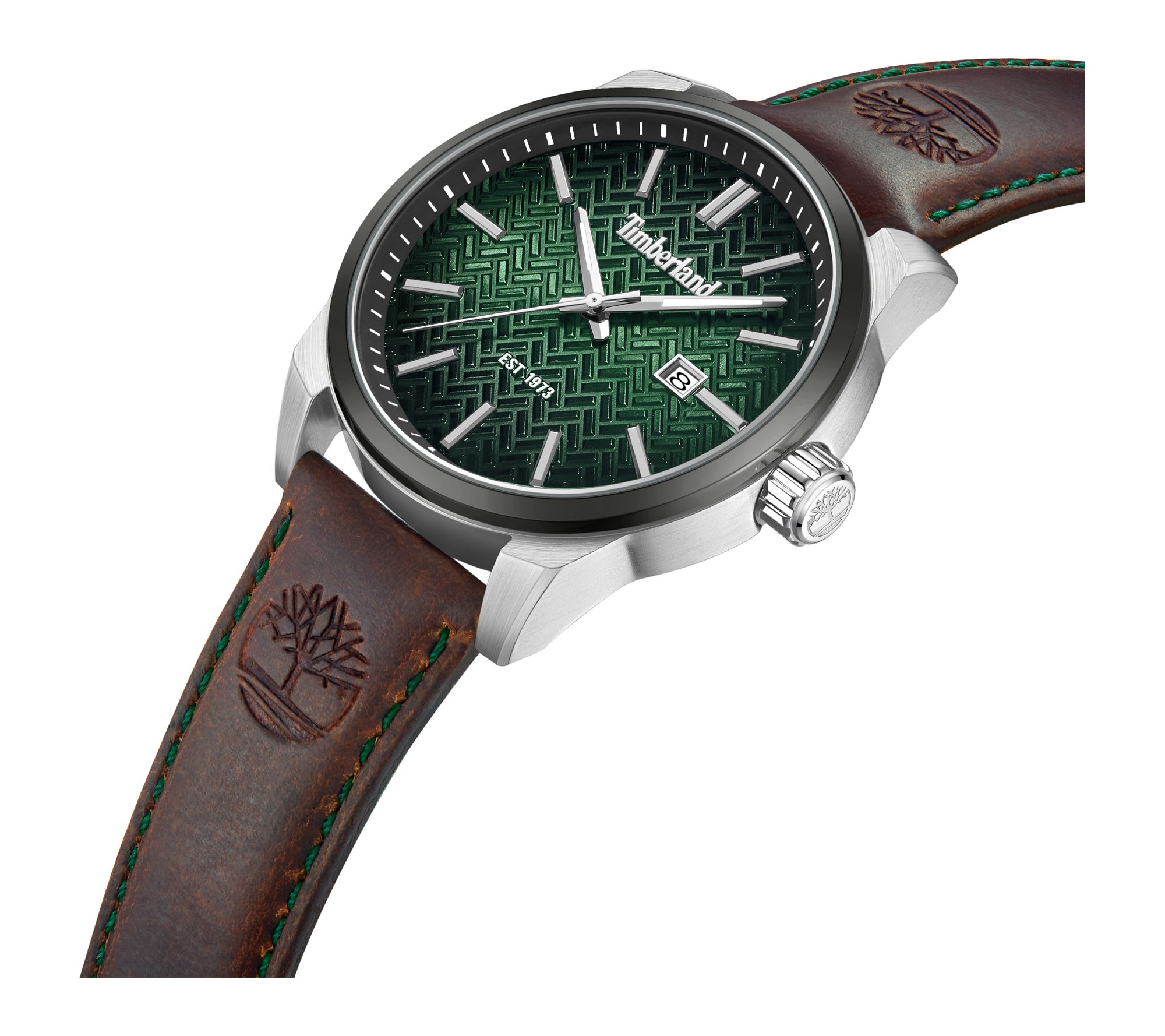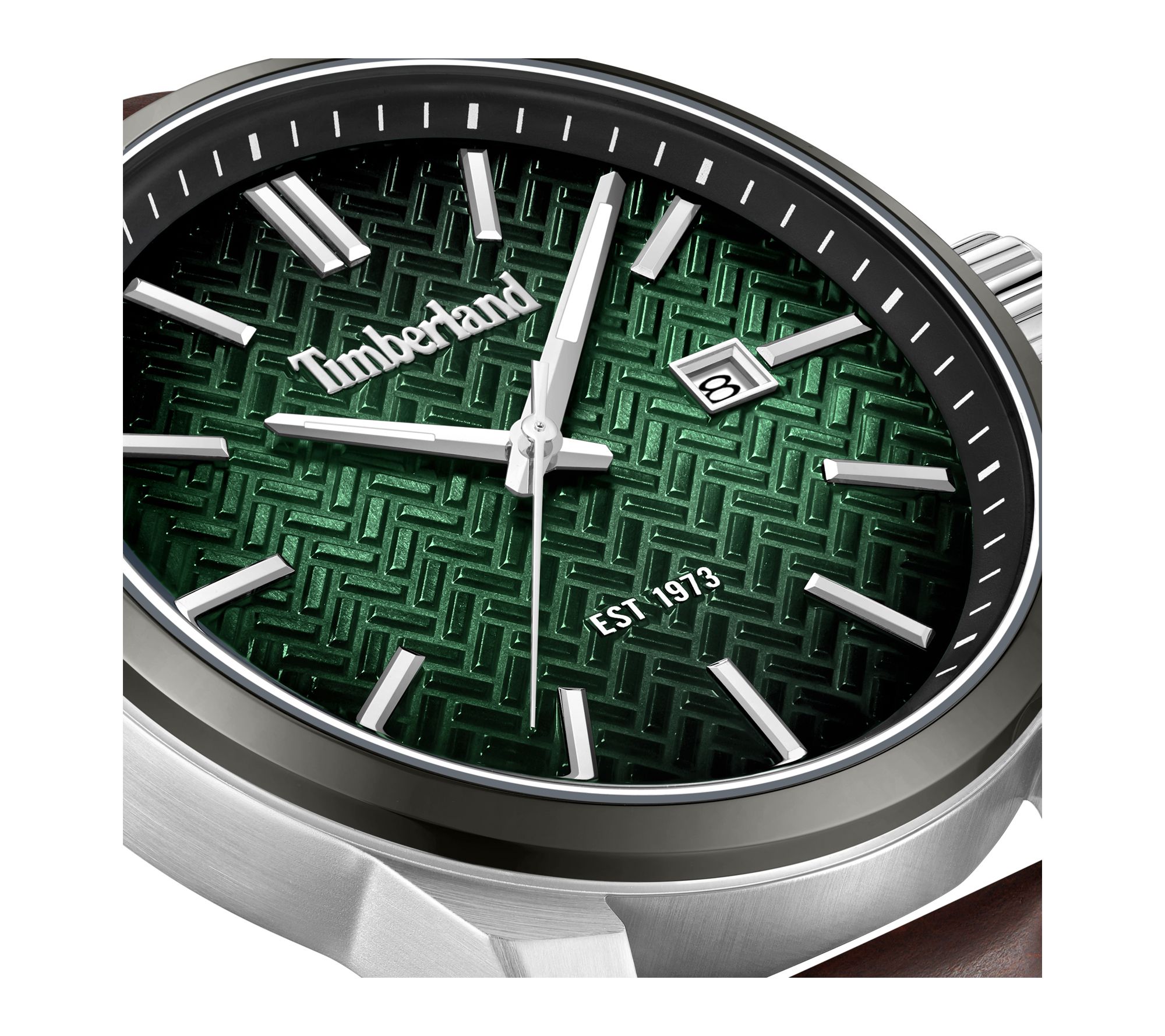 • Green dial with herringbone brickwork texture and black-to-green sunray base; applied metal hour markers; date window; faceted polished hands; analog display