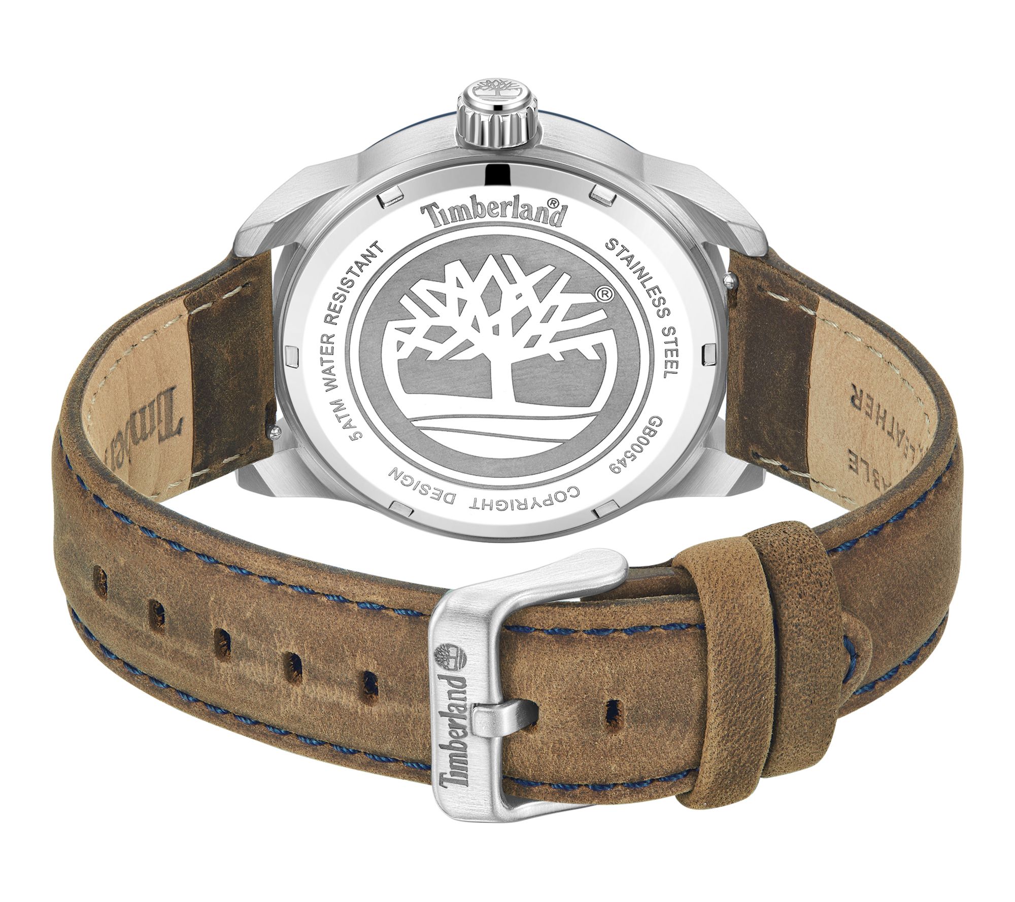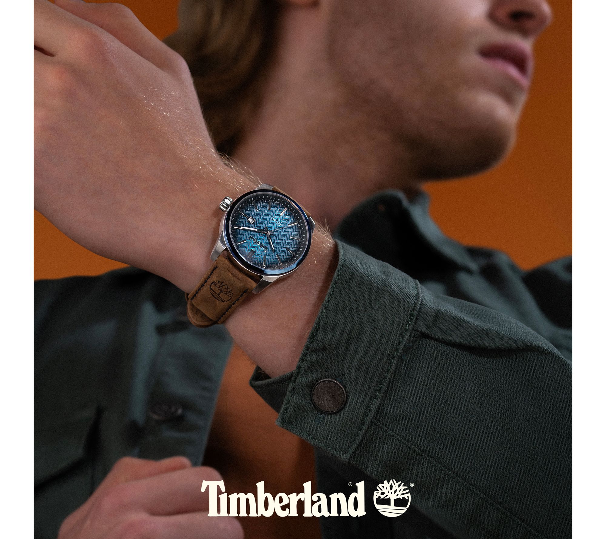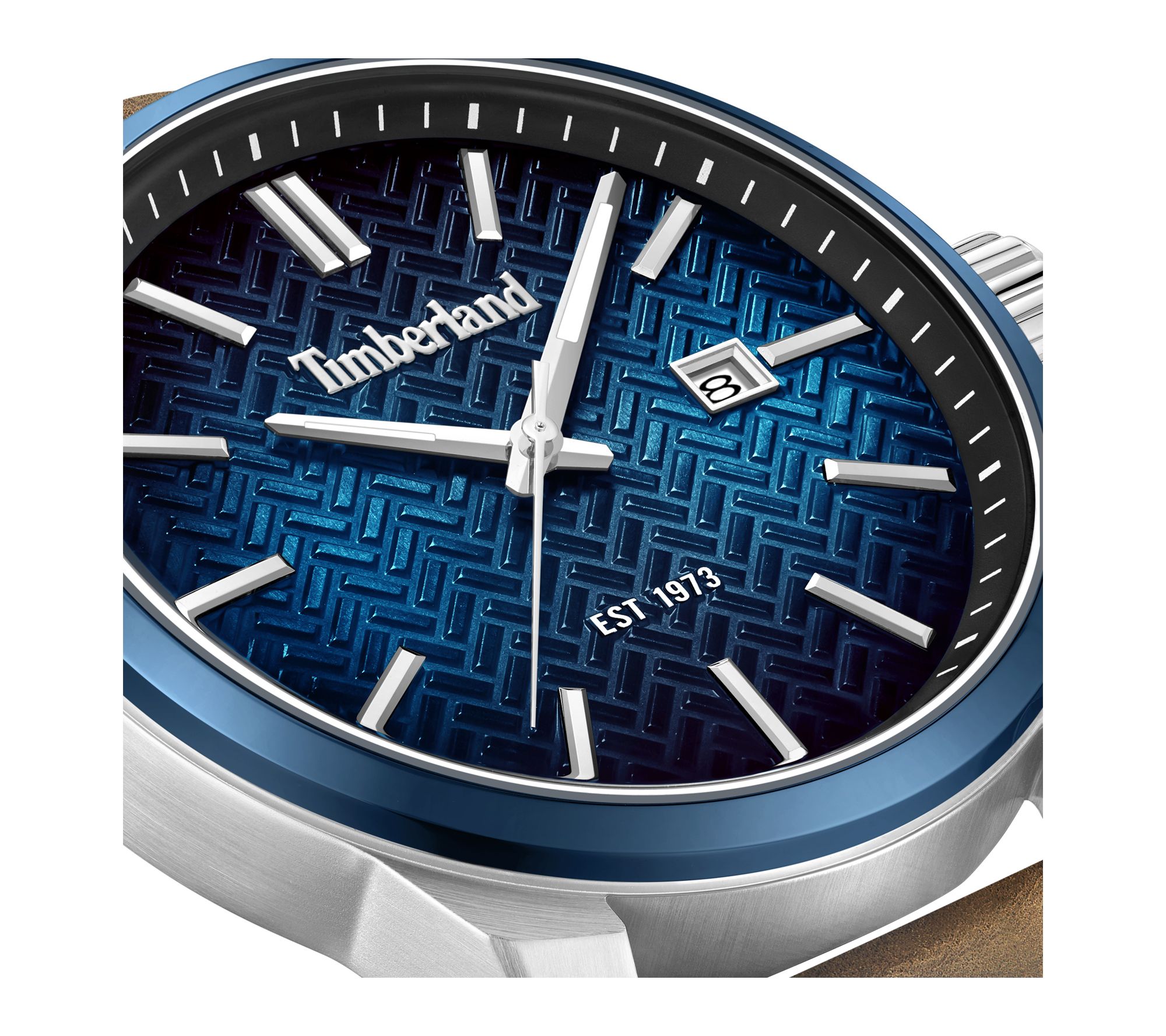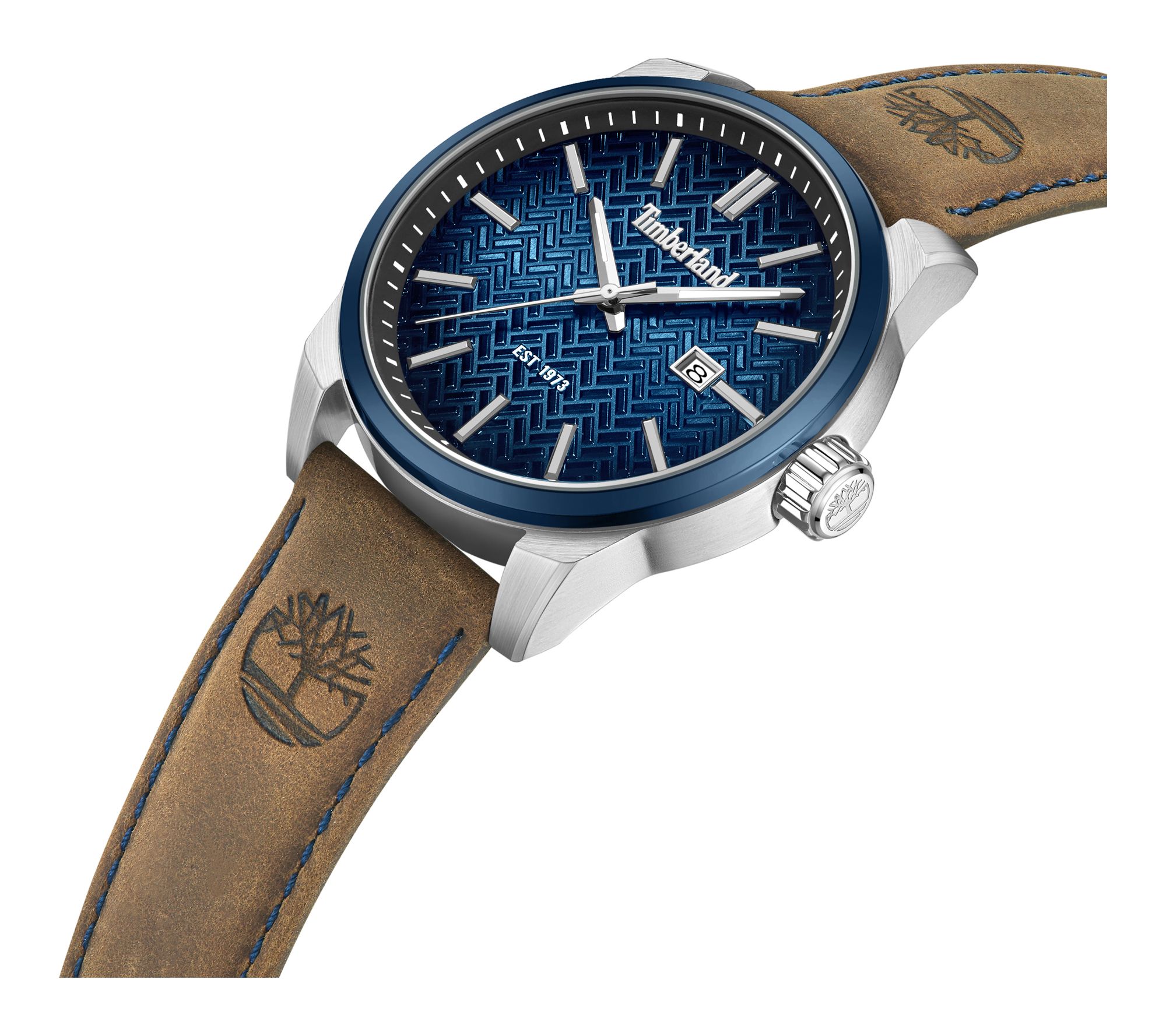 Whether you're exploring the city or heading out for a weekend adventure, this men's watch brings together rugged style and everyday versatility. The striking blue dial with herringbone brickwork texture pops against the stainless steel case and bold ion-plated bezel, while the dark brown leather strap adds comfort and a touch of Timberland heritage to your wrist. From Timberland.