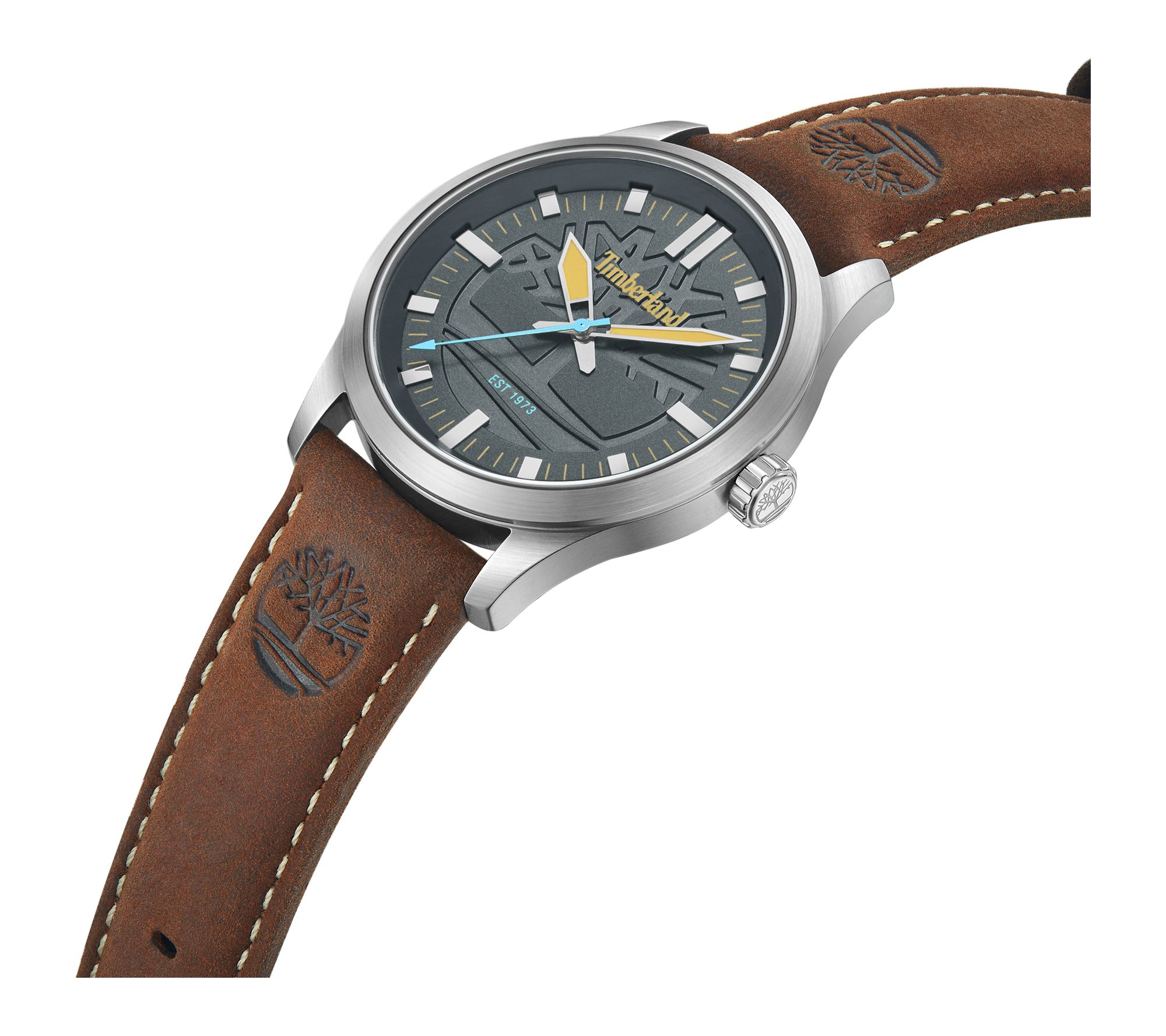 Whether heading out for weekend exploration or keeping it cool at the office, this men's watch brings casual confidence to your look. The bold round case and domed mineral lens showcase a matte gray dial accented with wheat and sky blue details, while the brown leather strap offers sophisticated comfort. From Timberland.