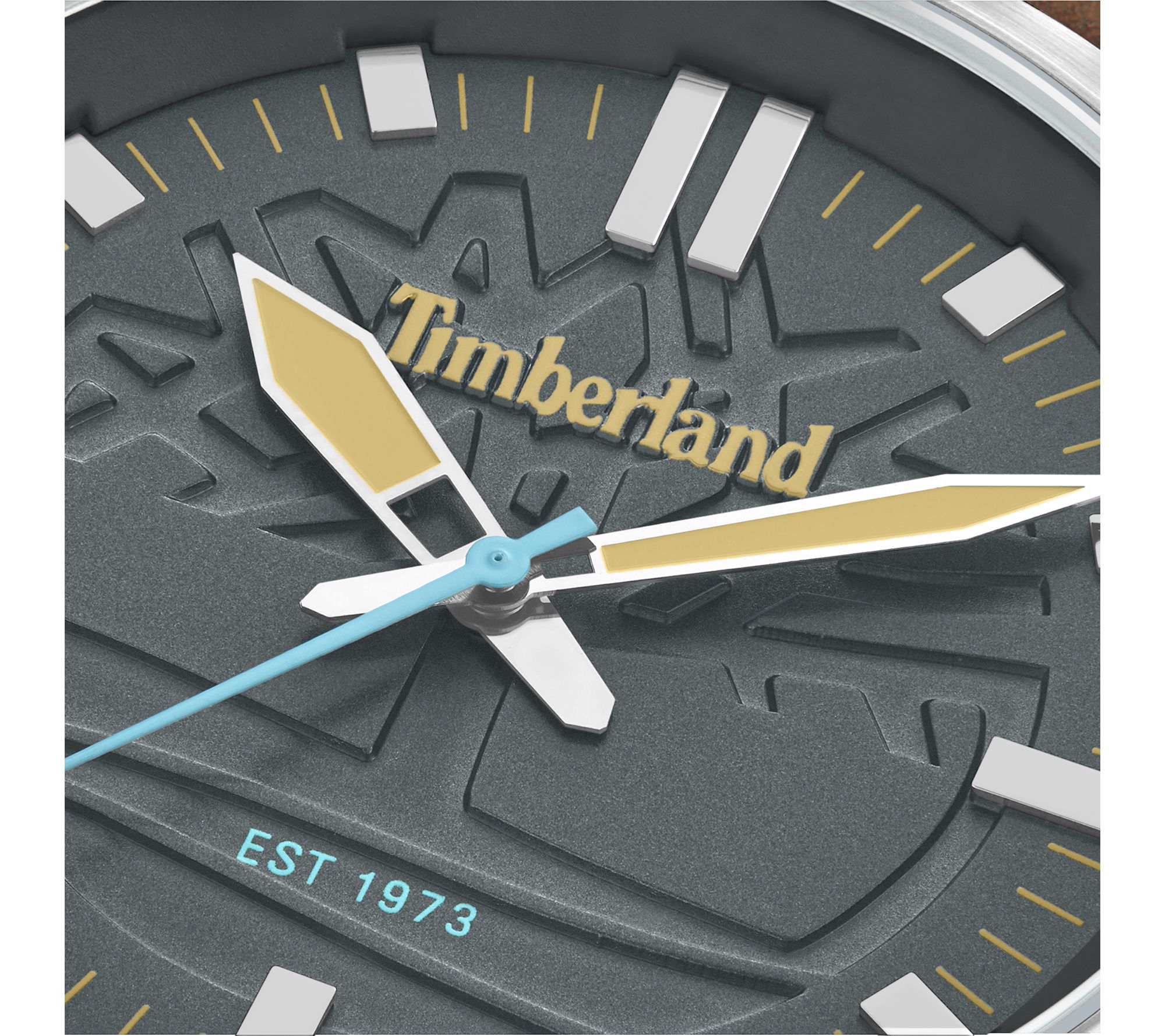 • Matte gray dial with wheat and sky blue accents; hour markers; hour, minute, and second hands