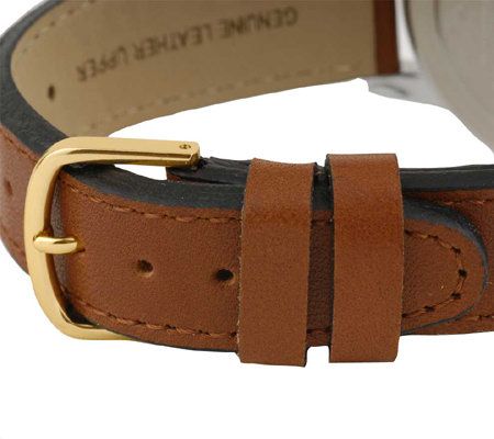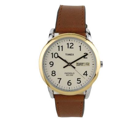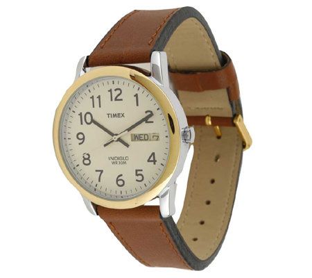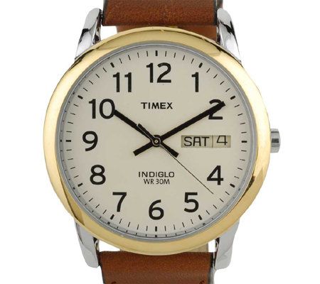 Be on time for important meetings and personal engagements. This handsome watch from Timex has a shiny goldtone bezel and a white dial with large, black, easy-to-read Arabic numerals. Convenient features include a Quick Date window at the 3 o'clock position and an Indiglo night-light. Black minute and hour hands. Silvertone second hand. Brown strap and goldtone buckle. Water resistant up to 30M. Silvertone pull-out crown. Stainless steel screw-on caseback. Philippines quartz movement.