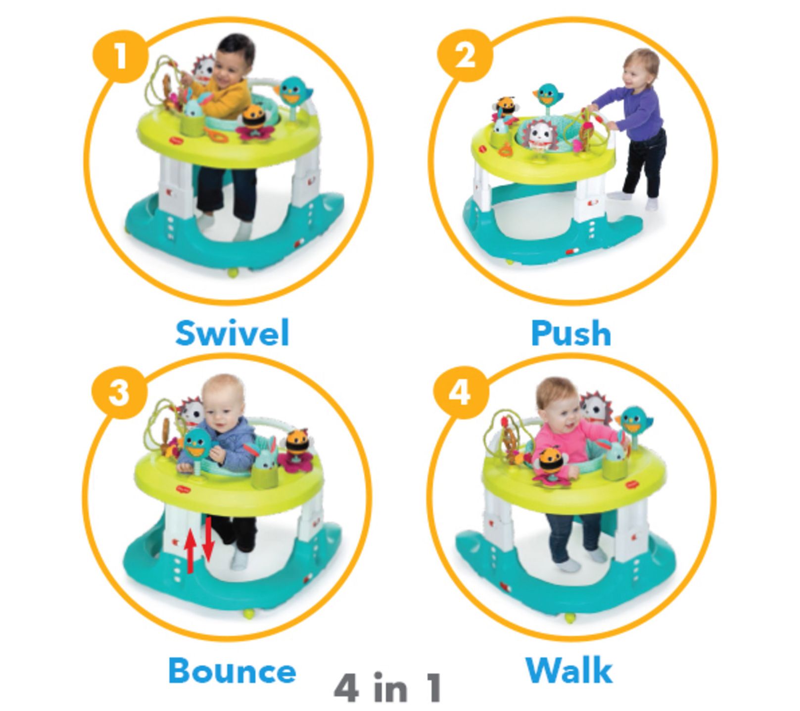 • Four-in-one design converts from a stationary activity center to a push-along toy, jumper, and walker