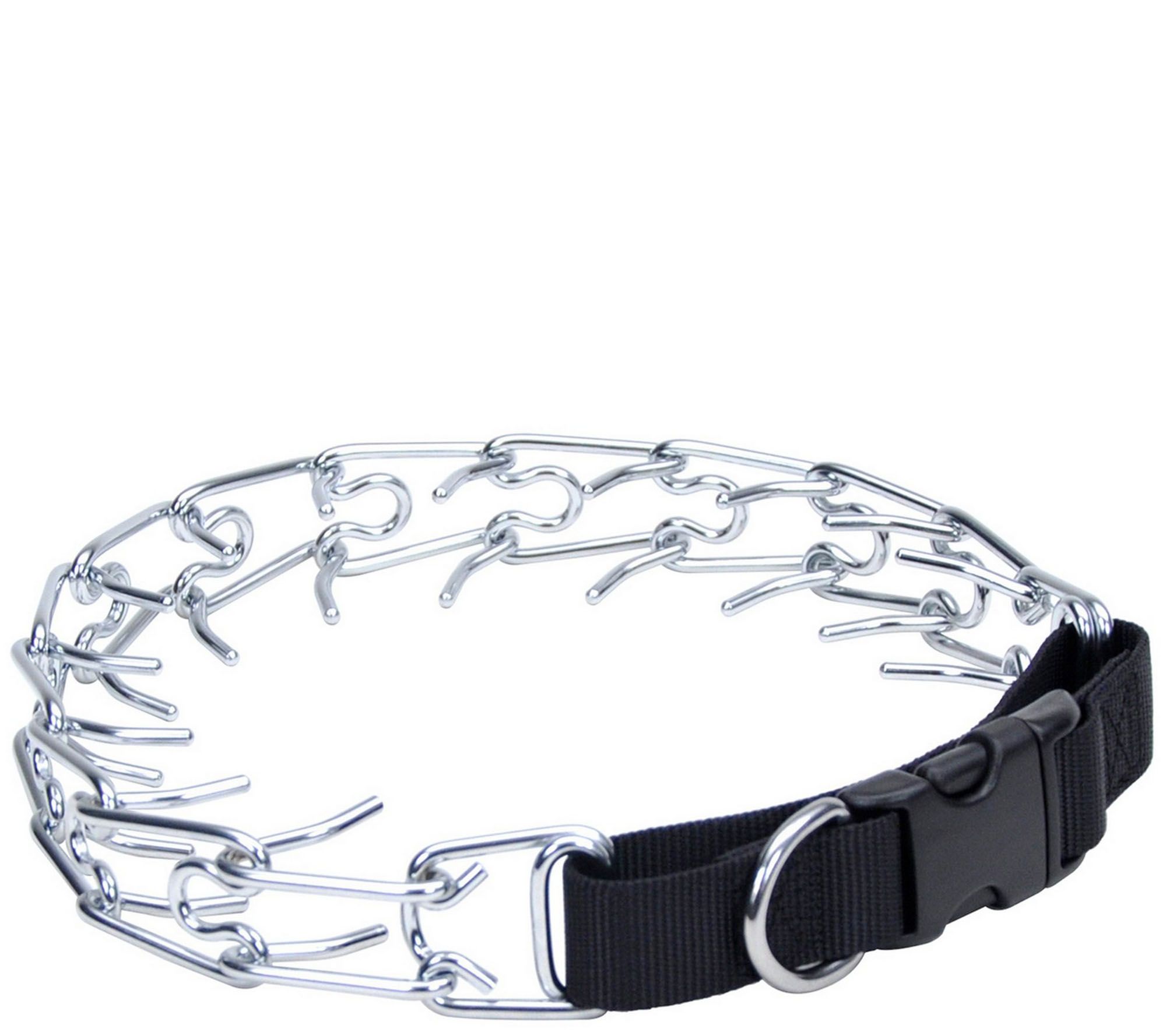 • Black and chrome-plated prong collar with buckle