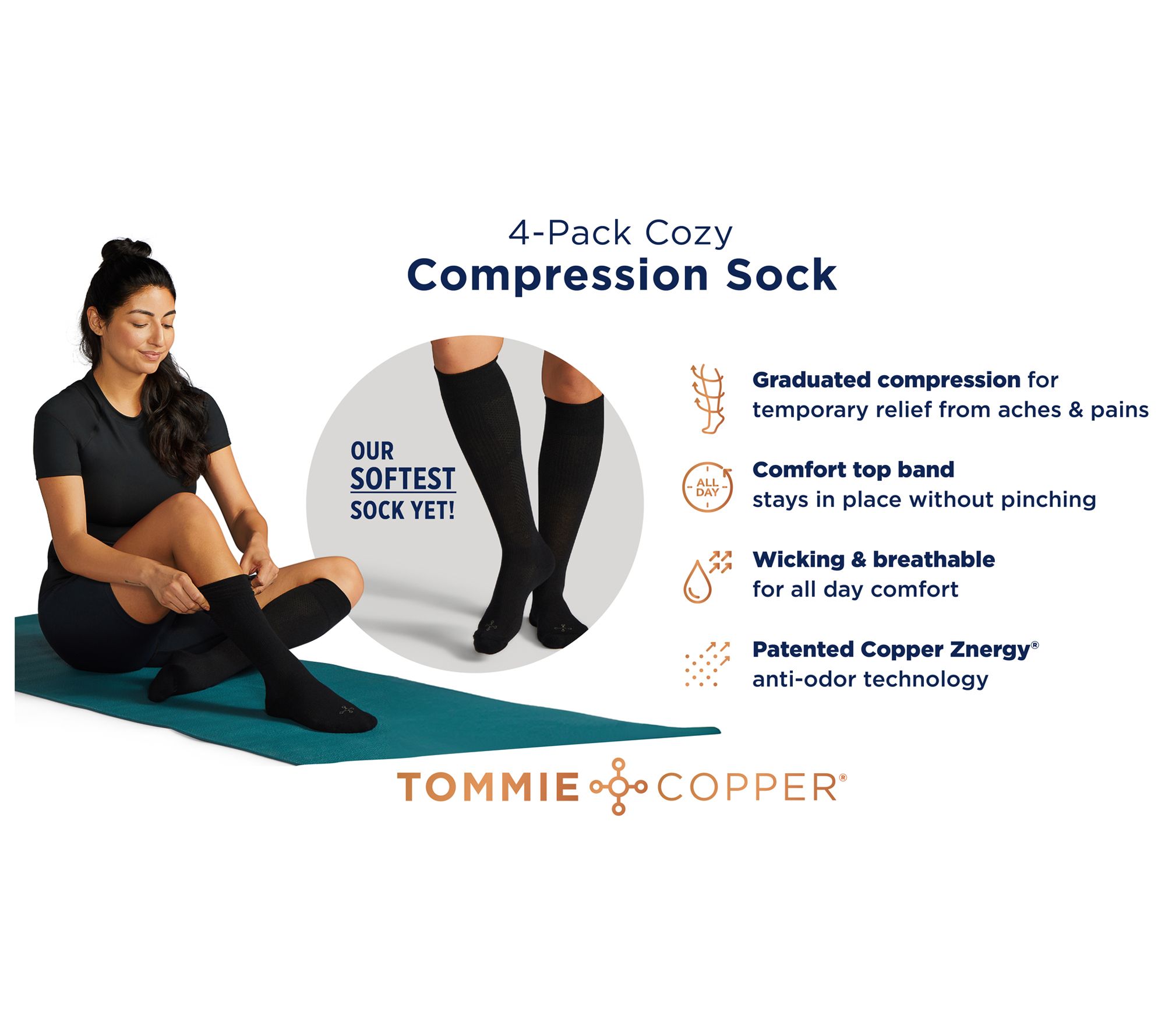 Tired feet need a feel-good treat? Tommie Copper's Cozy Fit wide over-the-calf socks provide the perfect blend of buttery softness and temporary relief. Infused with Copper Znergy technology, the moisture-wicking and well-cushioned design is crafted with graduated compression to help keep you comfortable for every soft and soothing step you take. From Tommie Copper.
