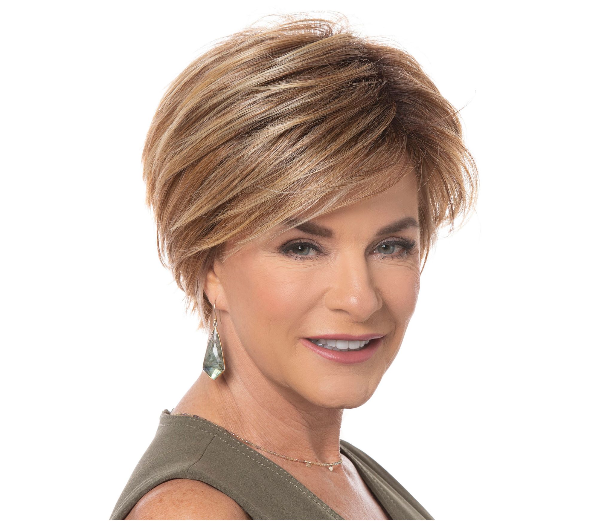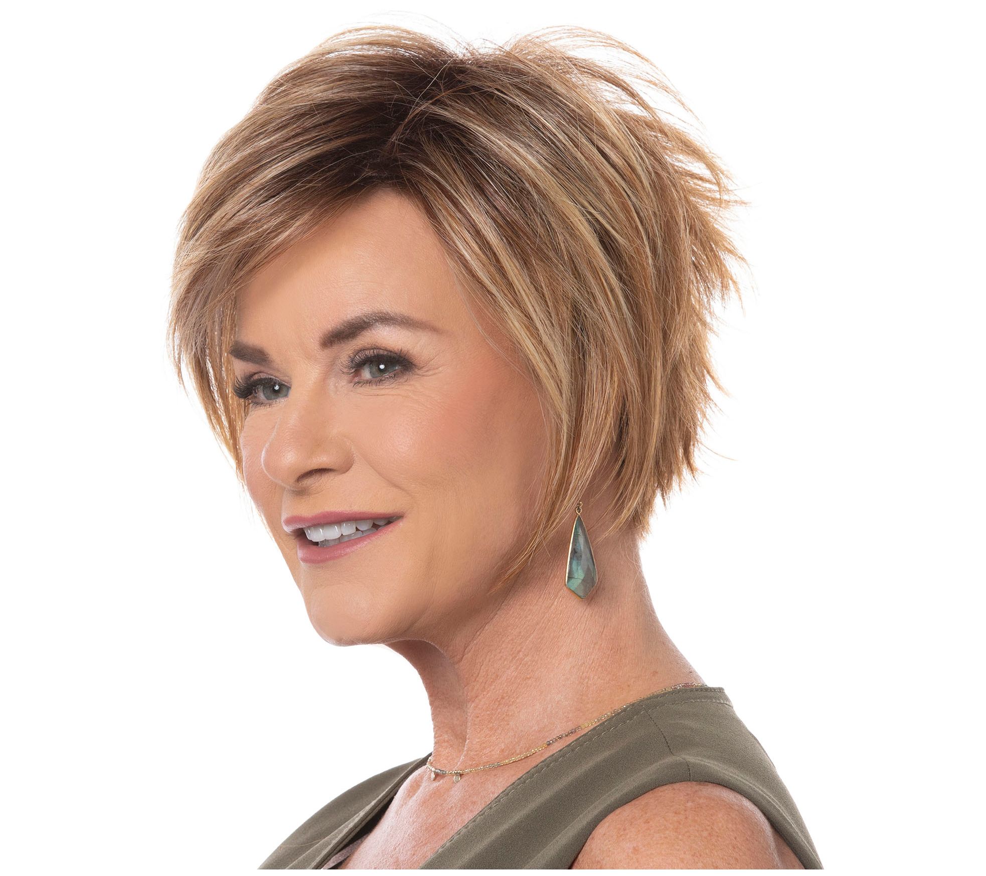 The Toni Brattin Fascination Bog-Length Wig features chin-length layers that frame the face, side-swooping bangs, and a razor-cut form-fitting nape. A balance between edgy and classic, the allover texturing creates care-free styling.