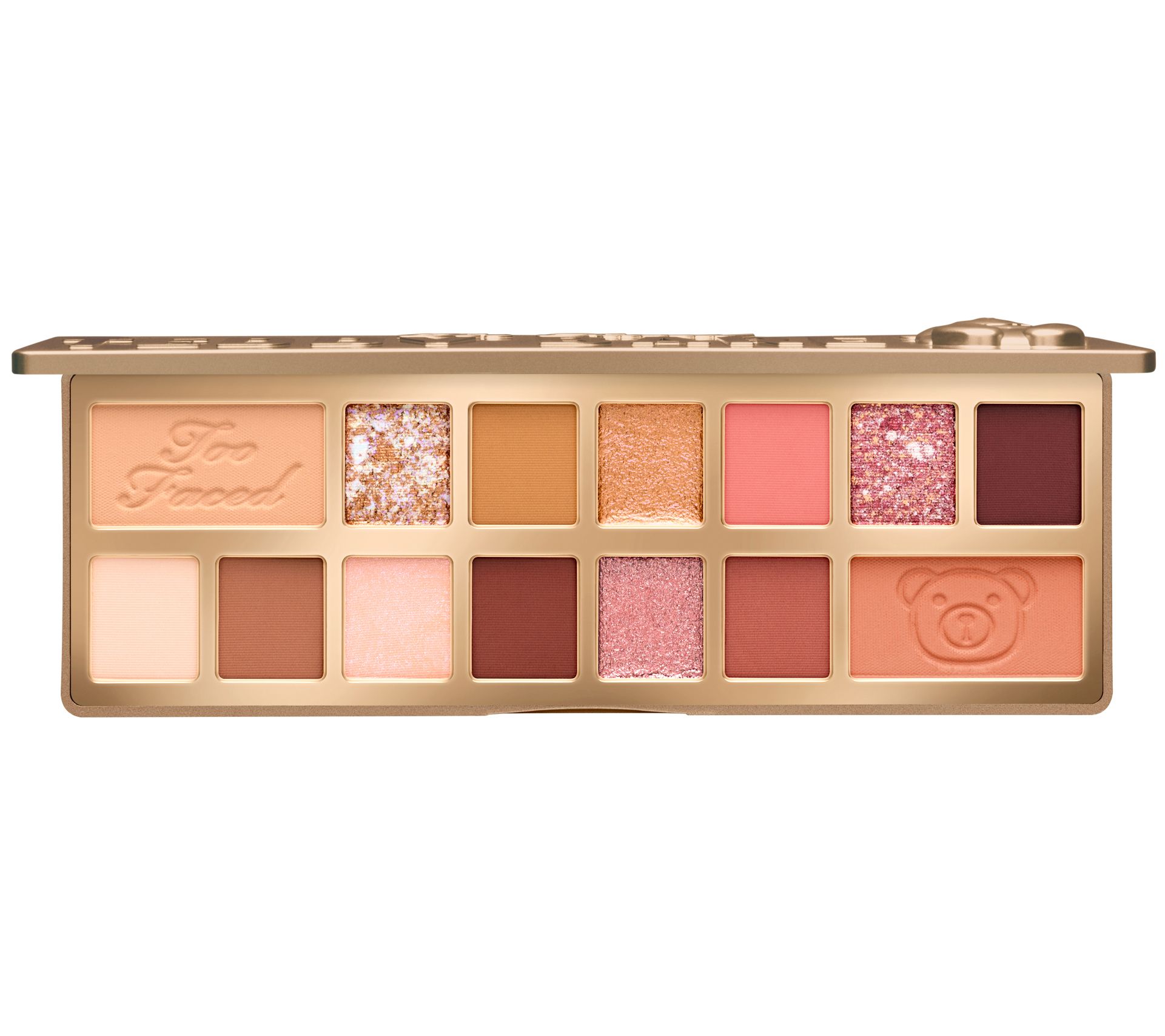 With this Teddy Bare Bare It All Eye Shadow Palette from Too Faced, cuddle up with warm, luxurious colors and slip into the sexiest version of yourself with shadows inspired by cuddles from your softest teddy bear. These sensual shades were formulated to feel smooth and buttery against your skin while they deliver high-impact seductive color for looks that range from bare-ly there to paws-itively sexy. With the scent of honey graham crackers, 10 matte eye shadows create endless sexy natural looks, two speckled metallics provide a multi-dimensional shimmer effect, two shimmer metallic shades can be worn alone or layered with speckled metallics, and two universal shades are for highlight and crease.