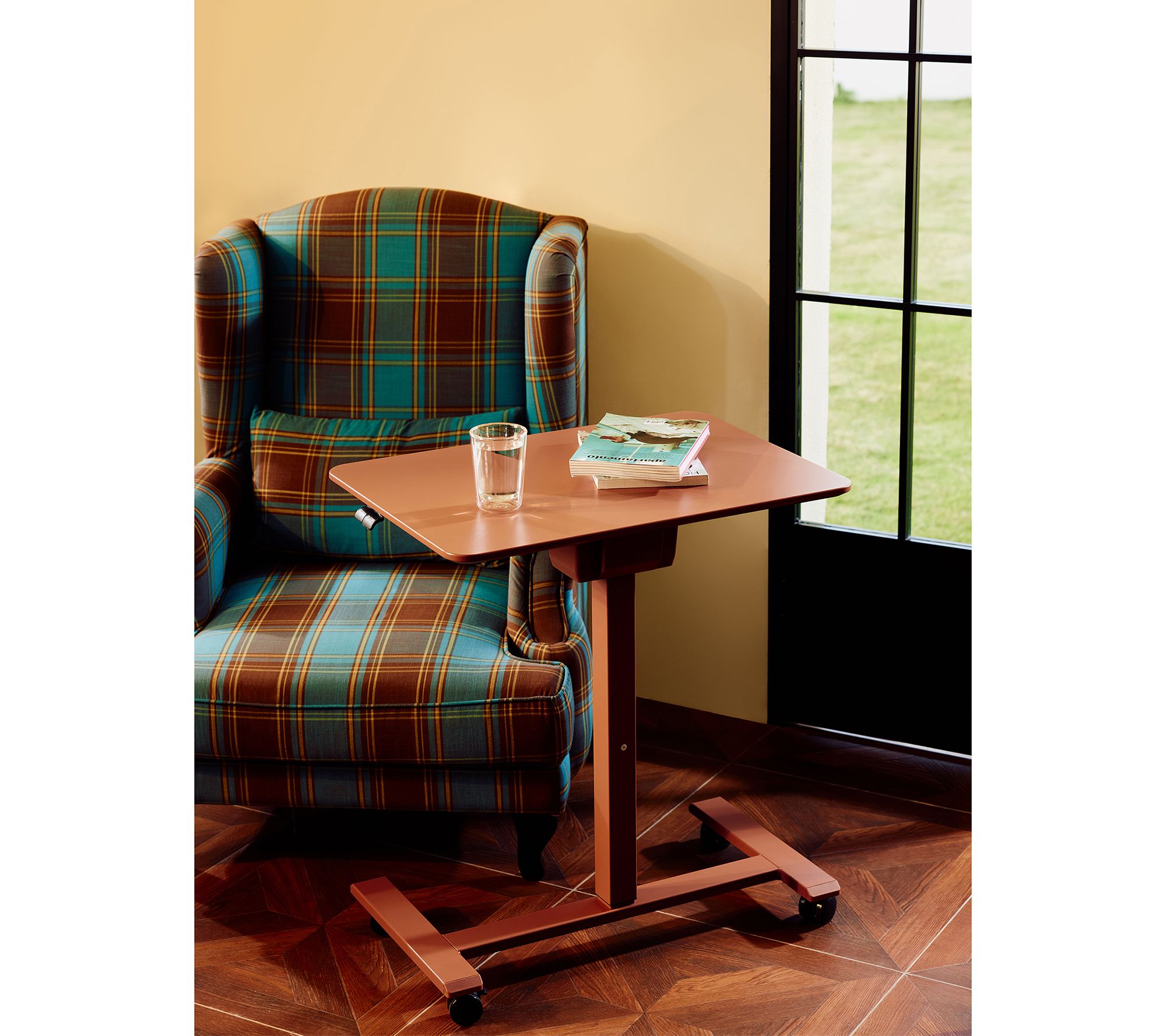 • Mobile sit-to-stand desk with smooth-rolling casters