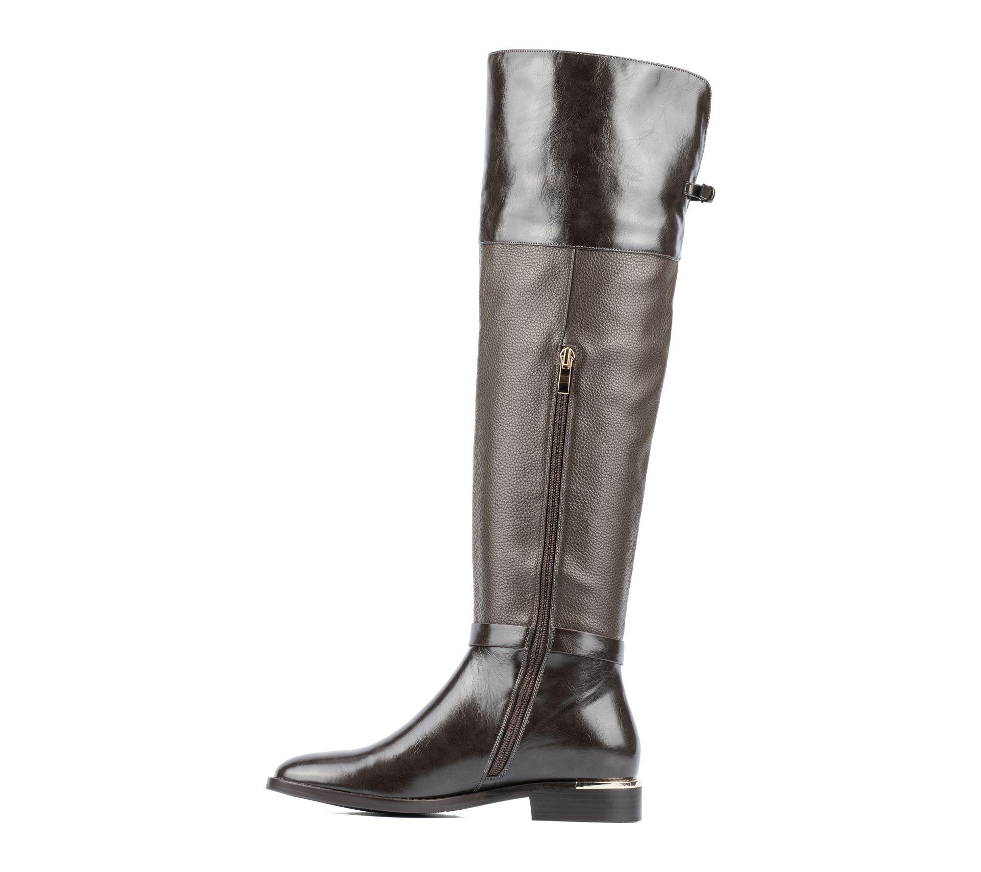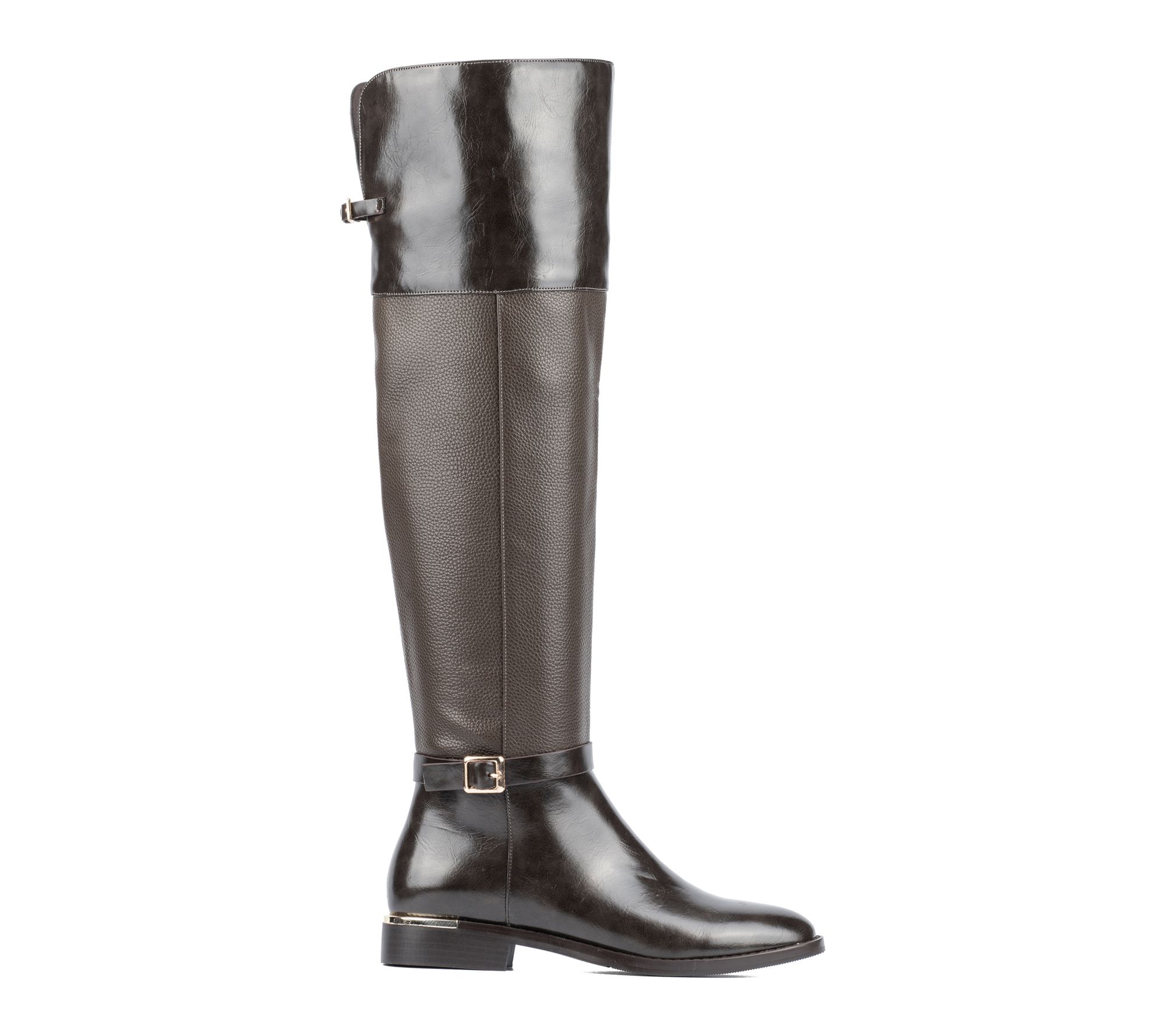 Side zip closure; rounded toe; over-the-knee silhouette; wide shaft; mixed material upper; bold buckle straps