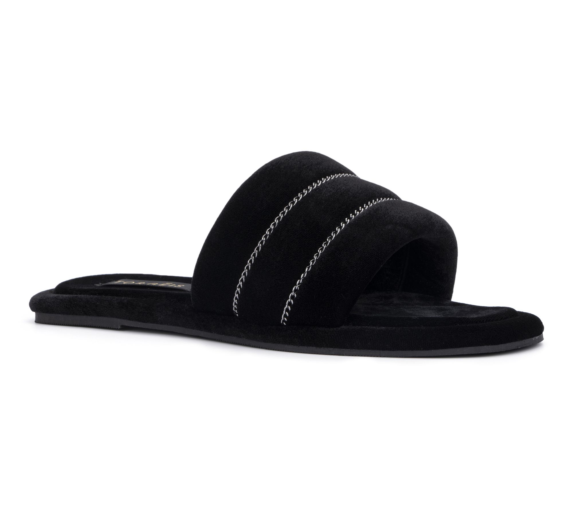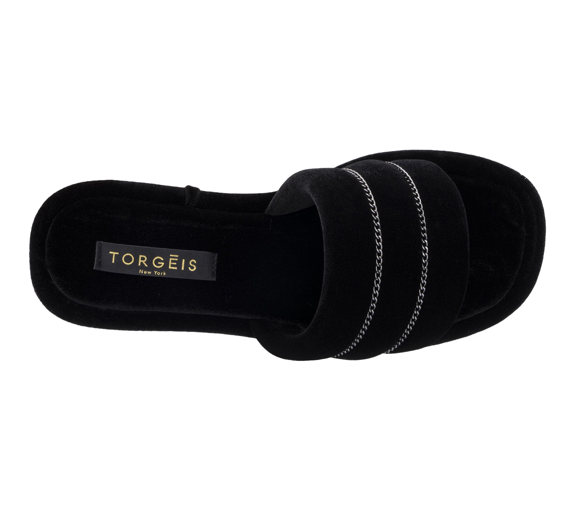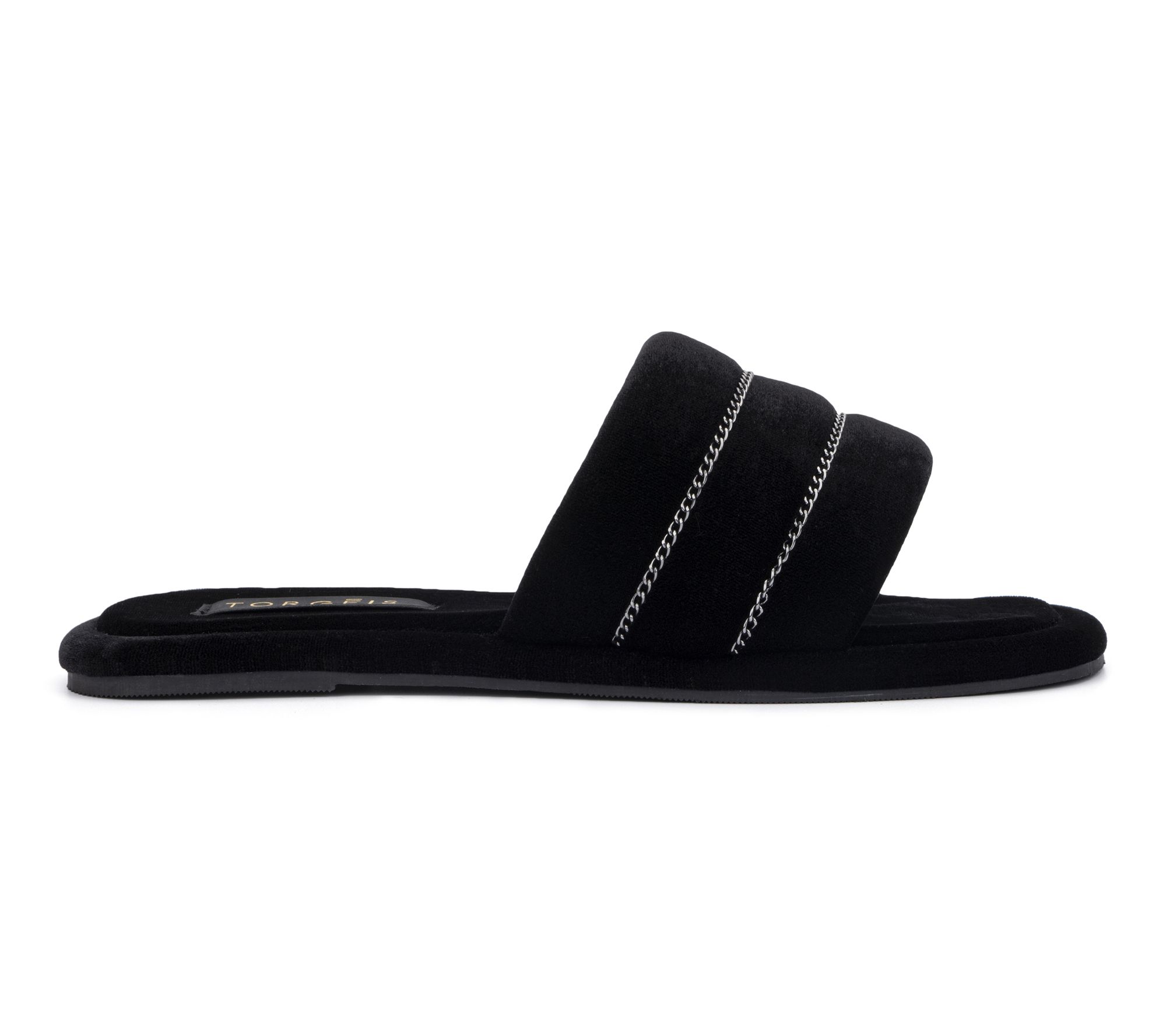 Whether you're lounging at home or stepping out to grab the mail, these Georgina slippers bring a touch of chic comfort to every moment. Plush velvet and a wide toe strap with striped chain detailing surround your feet in softness, while the durable rubber sole takes you from room to room in cozy style. From Torgeis.