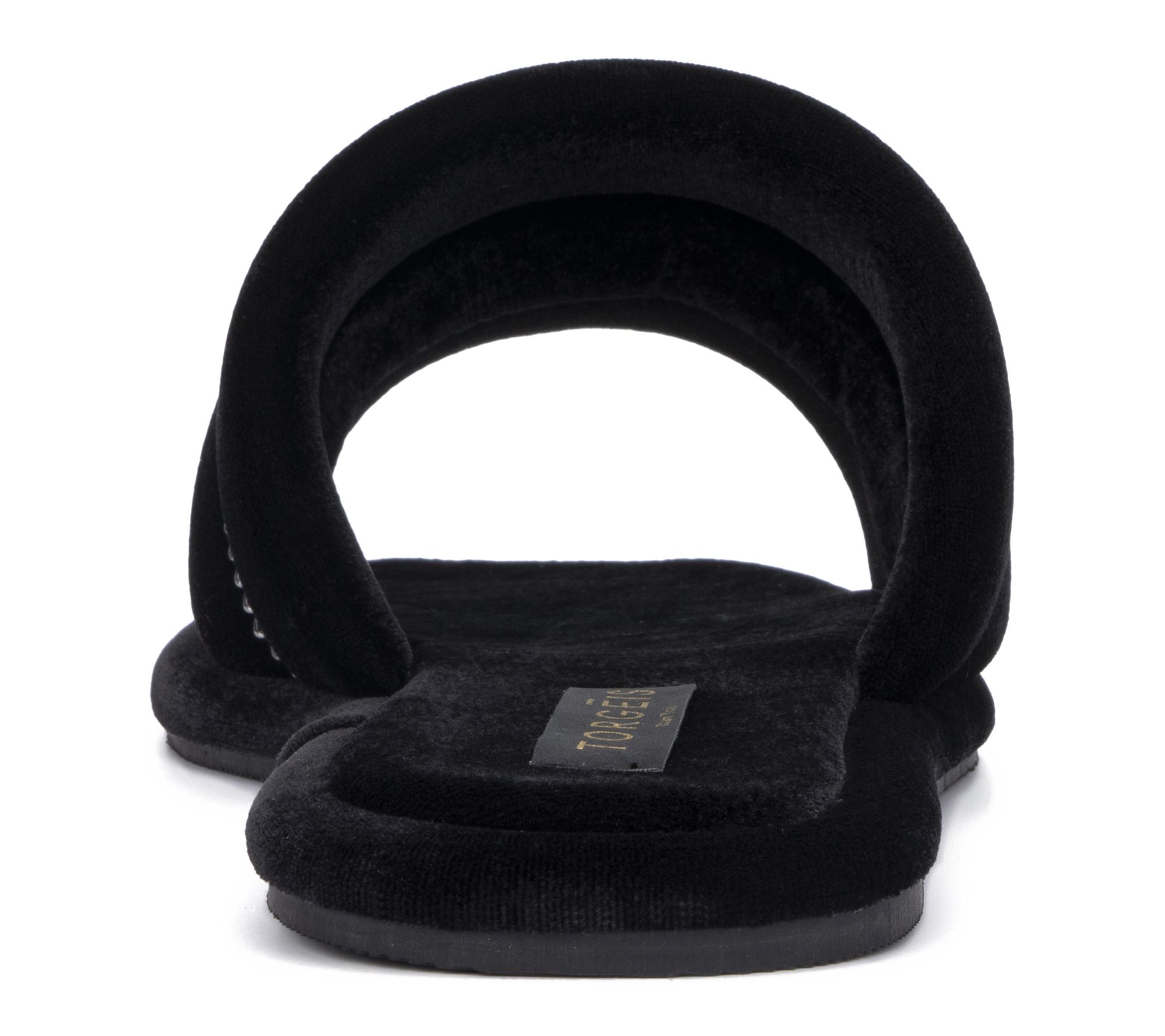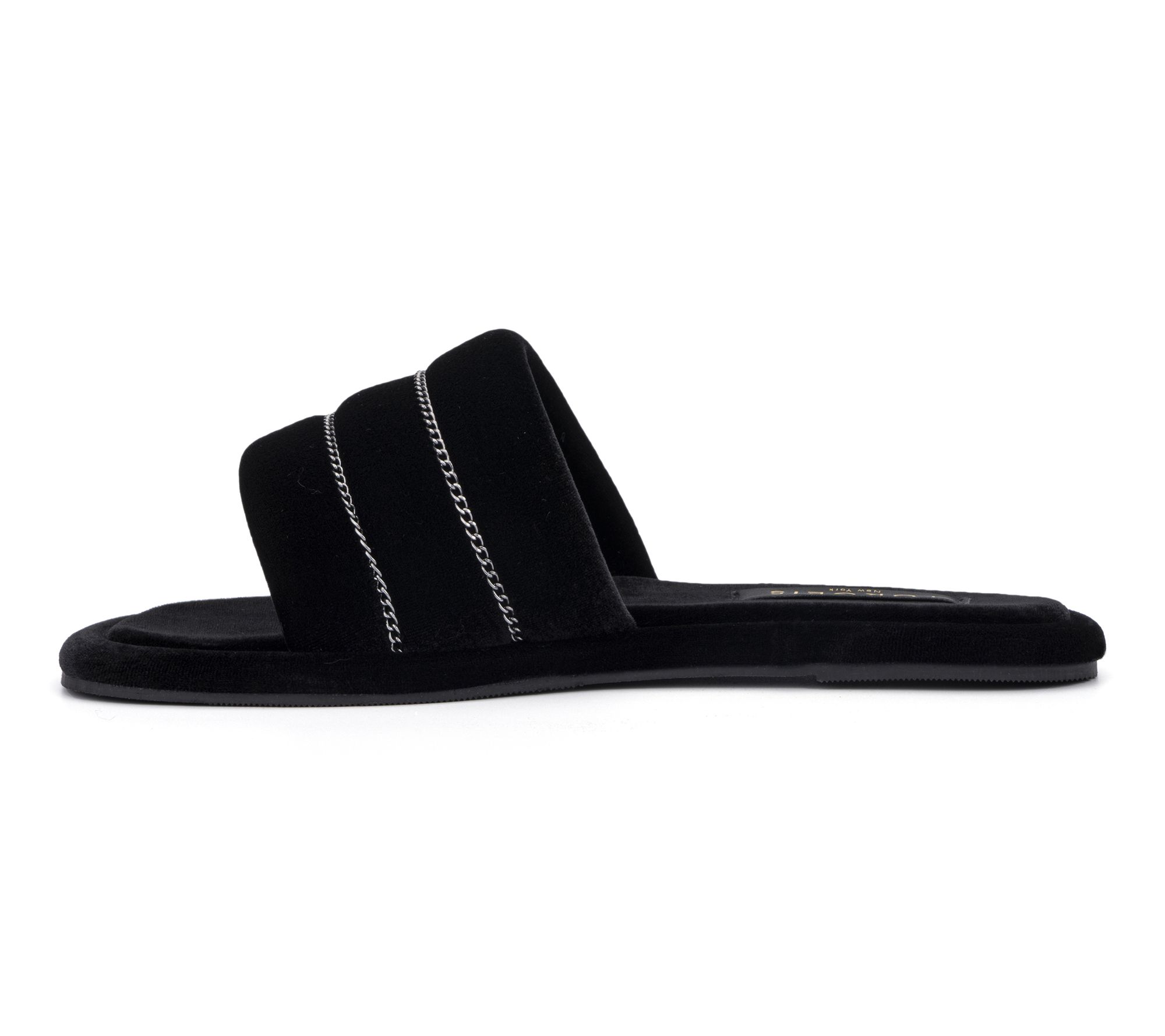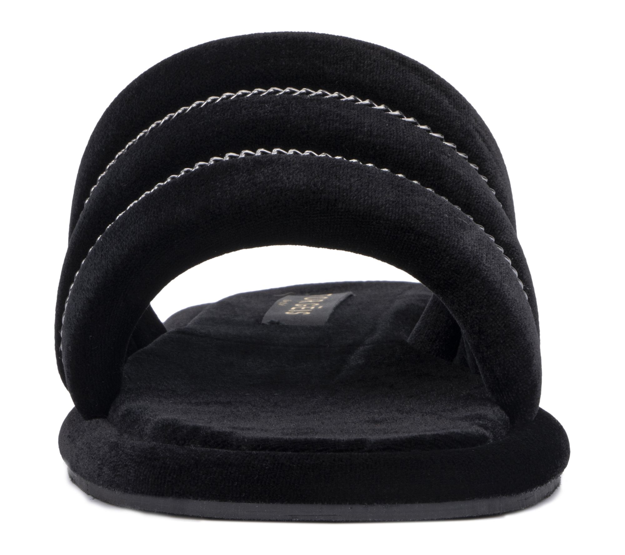 Whether you're lounging at home or stepping out to grab the mail, these Georgina slippers bring a touch of chic comfort to every moment. Plush velvet and a wide toe strap with striped chain detailing surround your feet in softness, while the durable rubber sole takes you from room to room in cozy style. From Torgeis.