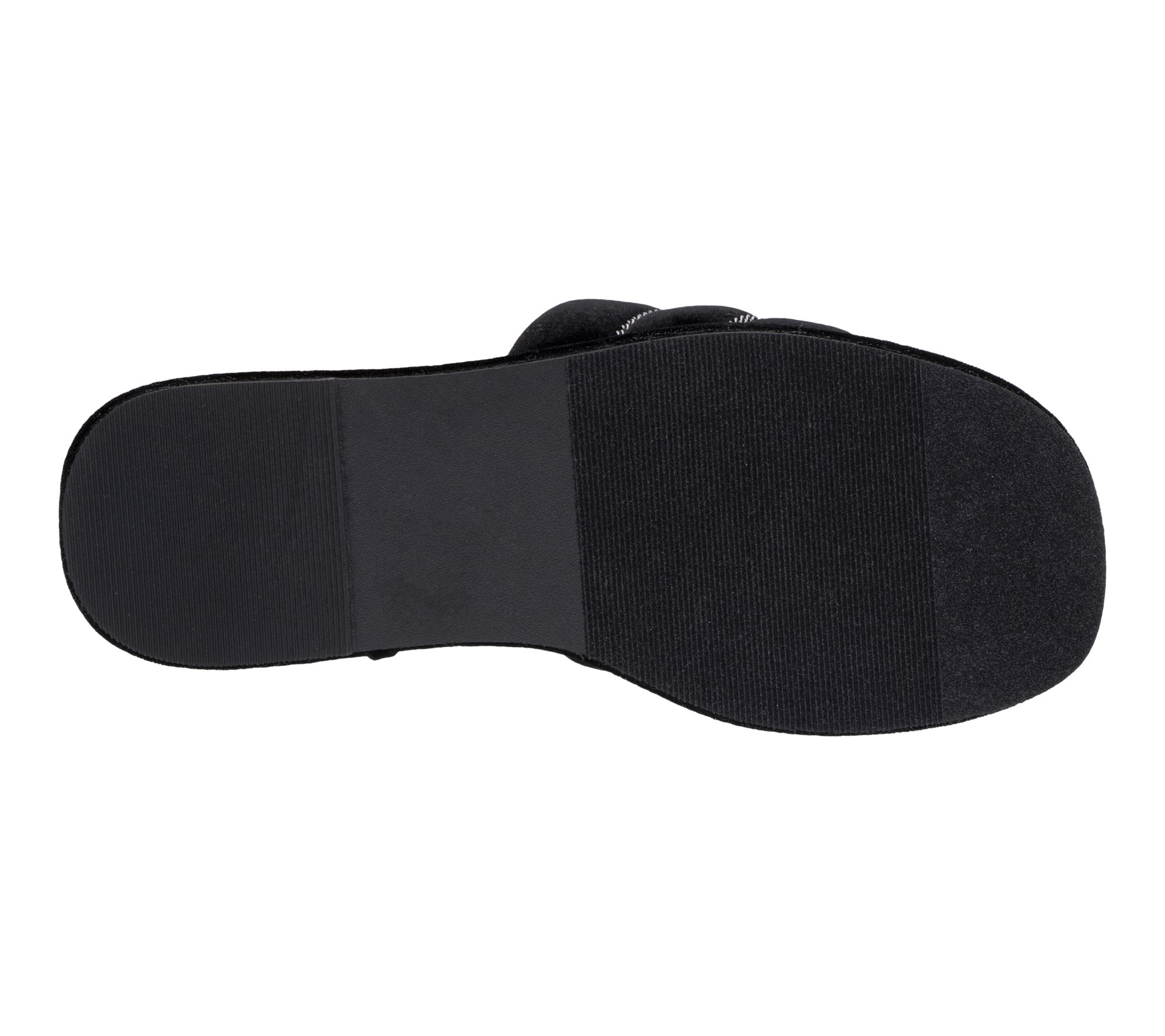 Slip-on design with wide toe strap and striped chain detailing; rounded toe