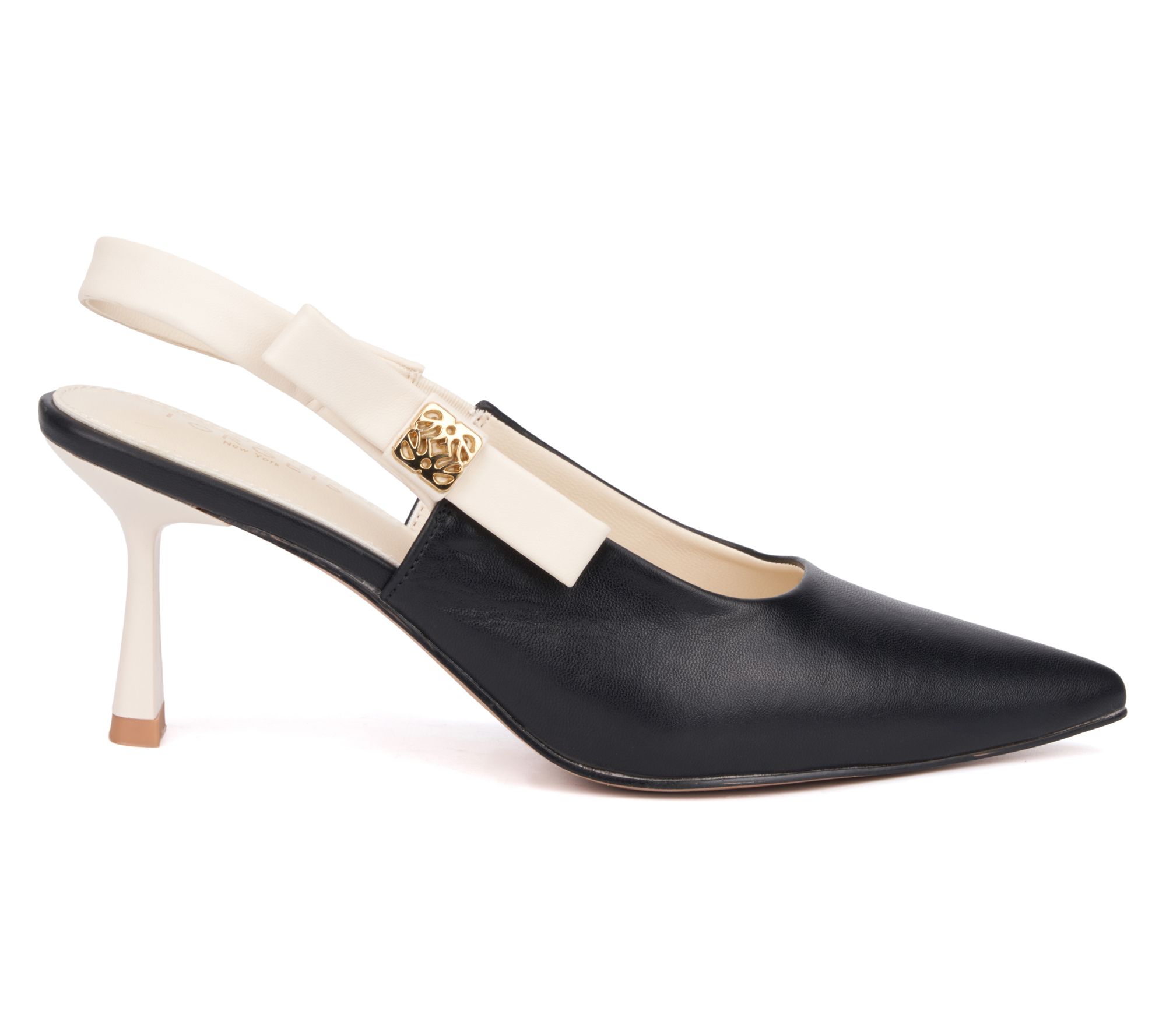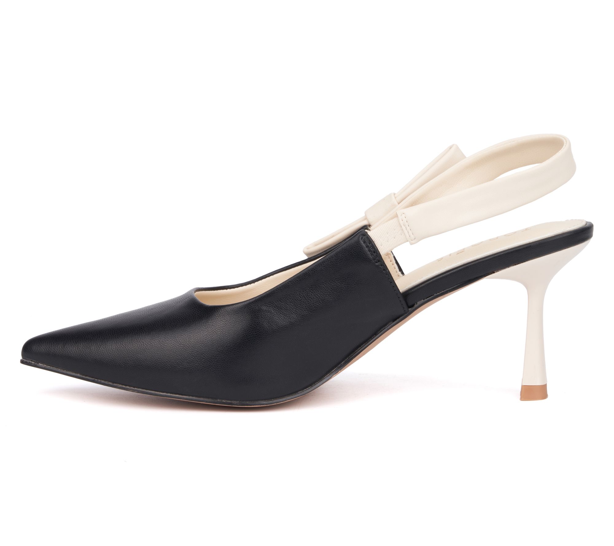 • Pointed toe, slingback design, bow and metallic hardware embellishment