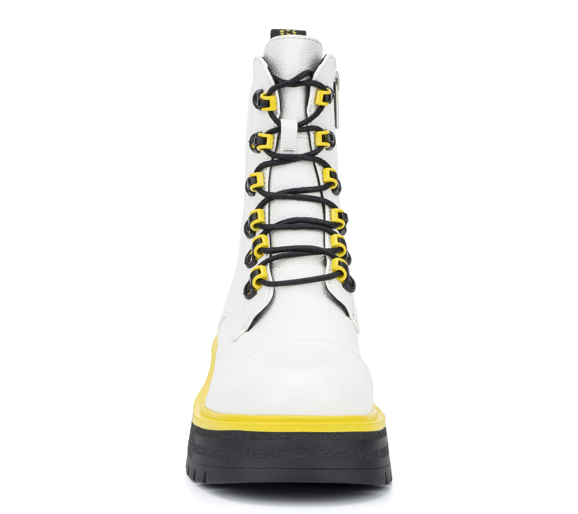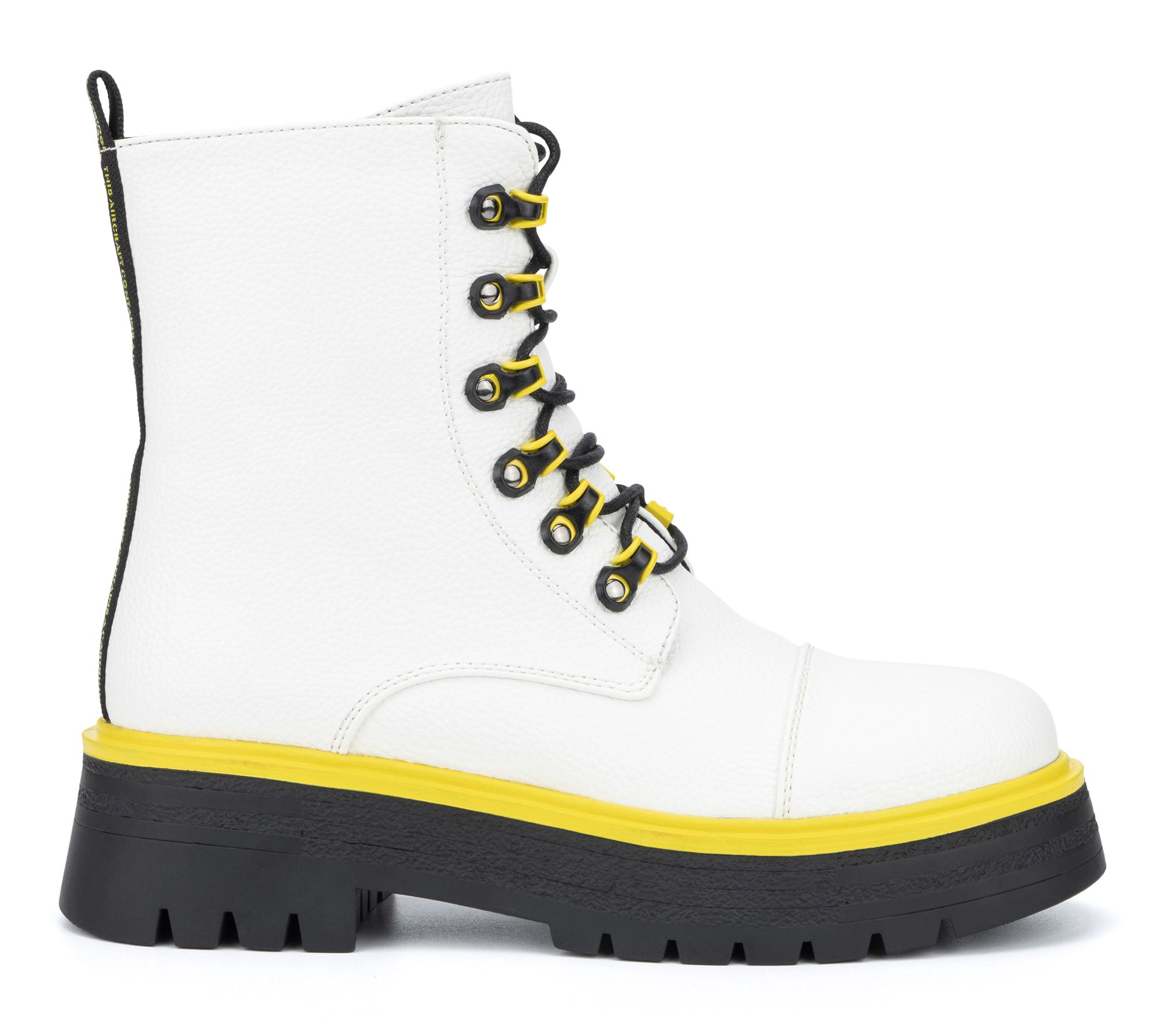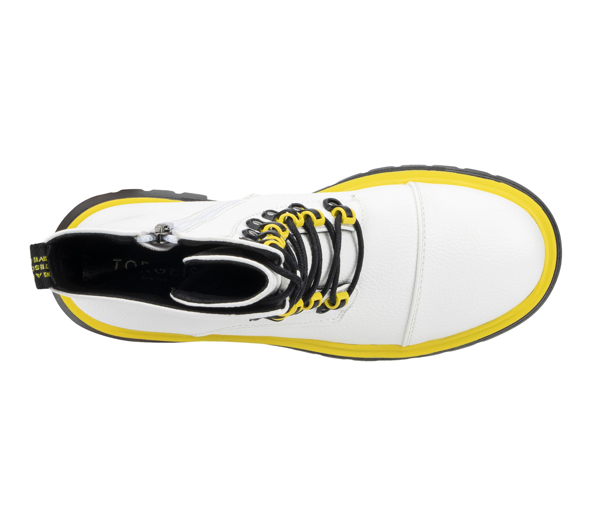 • Lace-up design; rounded toe; bright color trim at hook grommets, sole, and back pull-on loop