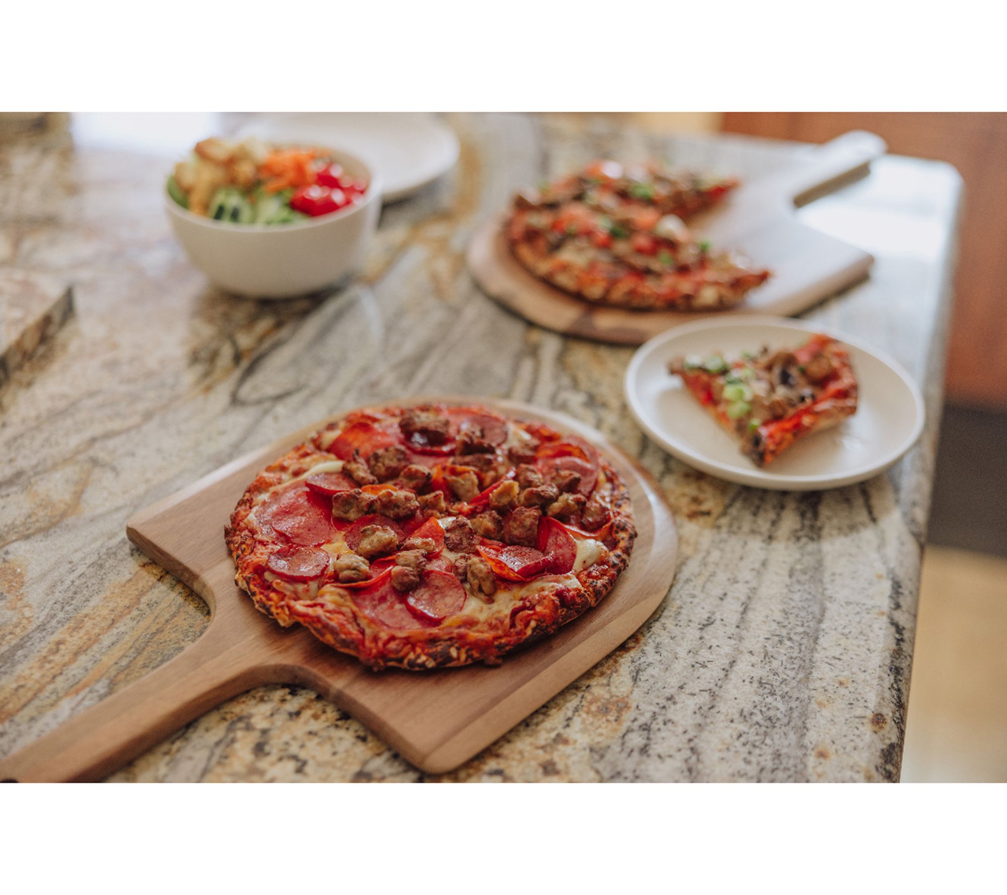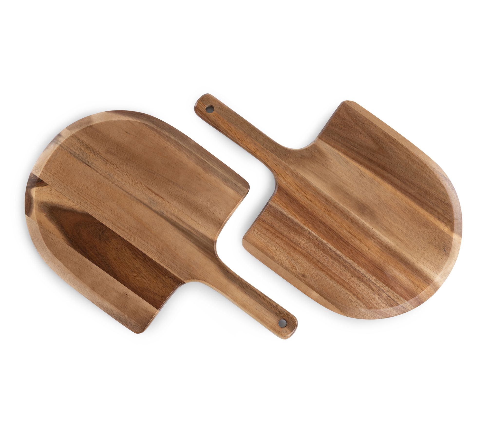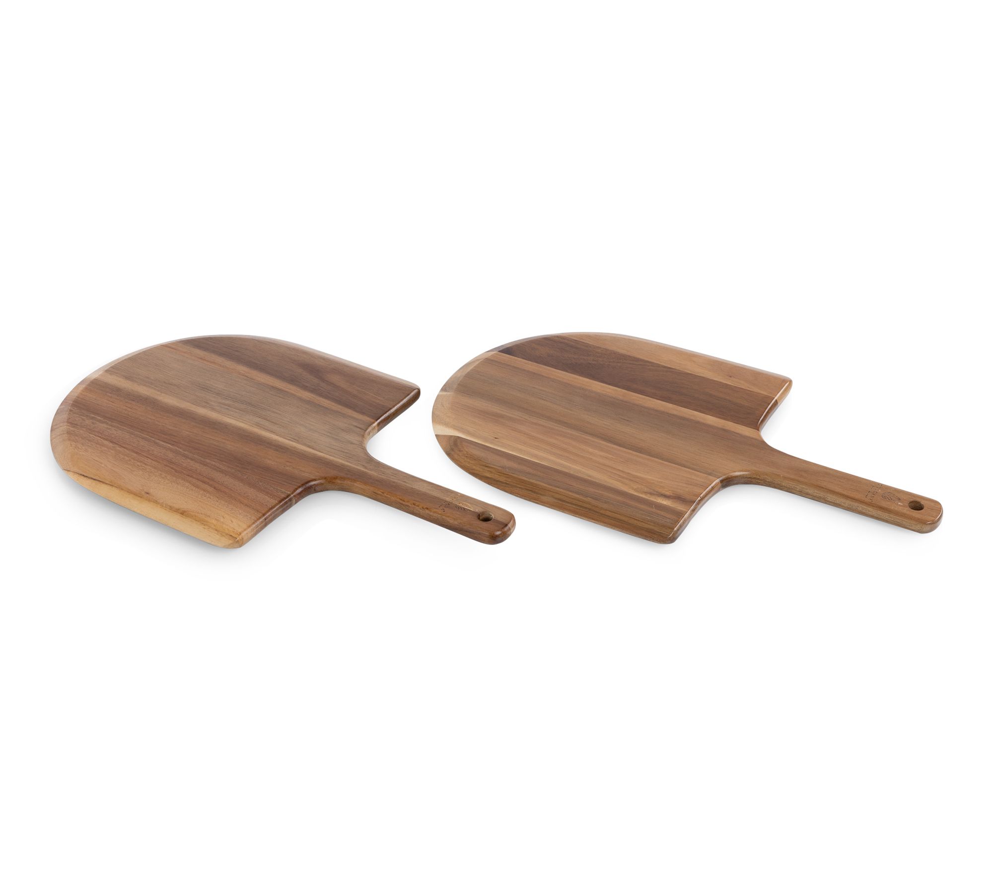 Create shareable moments with this set of two personal sized pizza peel paddle serving boards, designed for effortless homemade pizza nights. The flat paddle with a beveled edge glides smoothly under your pizza, while the tapered handle offers a secure grip for easy oven transfers. Perfect for serving individual pizzas, these acacia wood boards add warmth and style to any kitchen gathering. From Toscana.