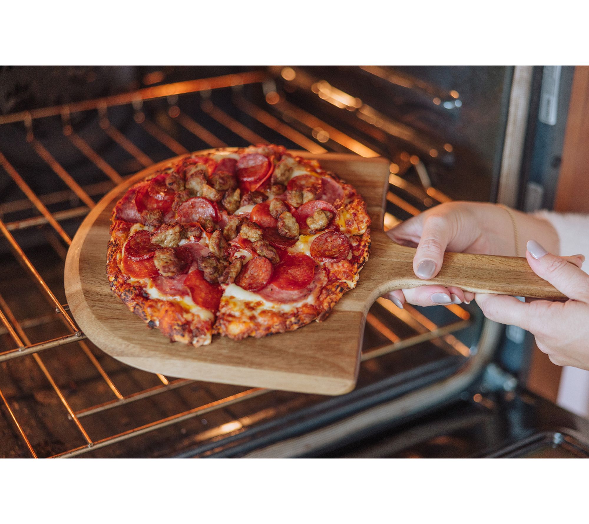 • Flat paddle with beveled edge smoothly slides under pizzas