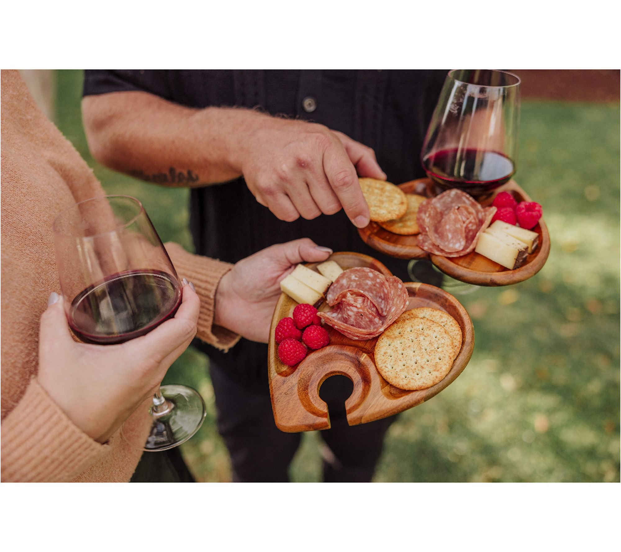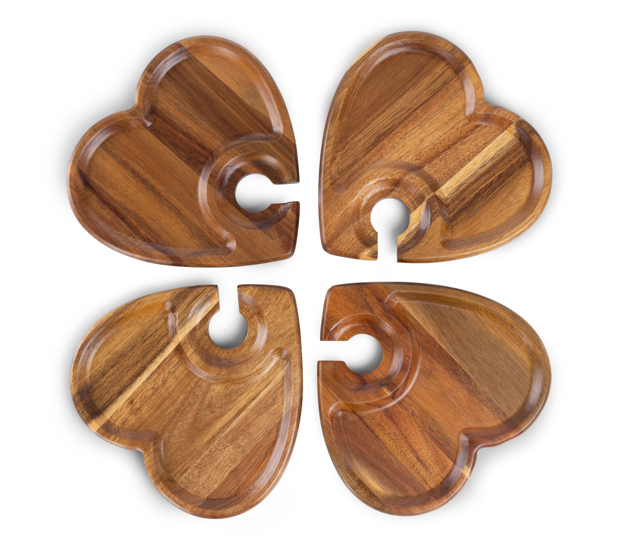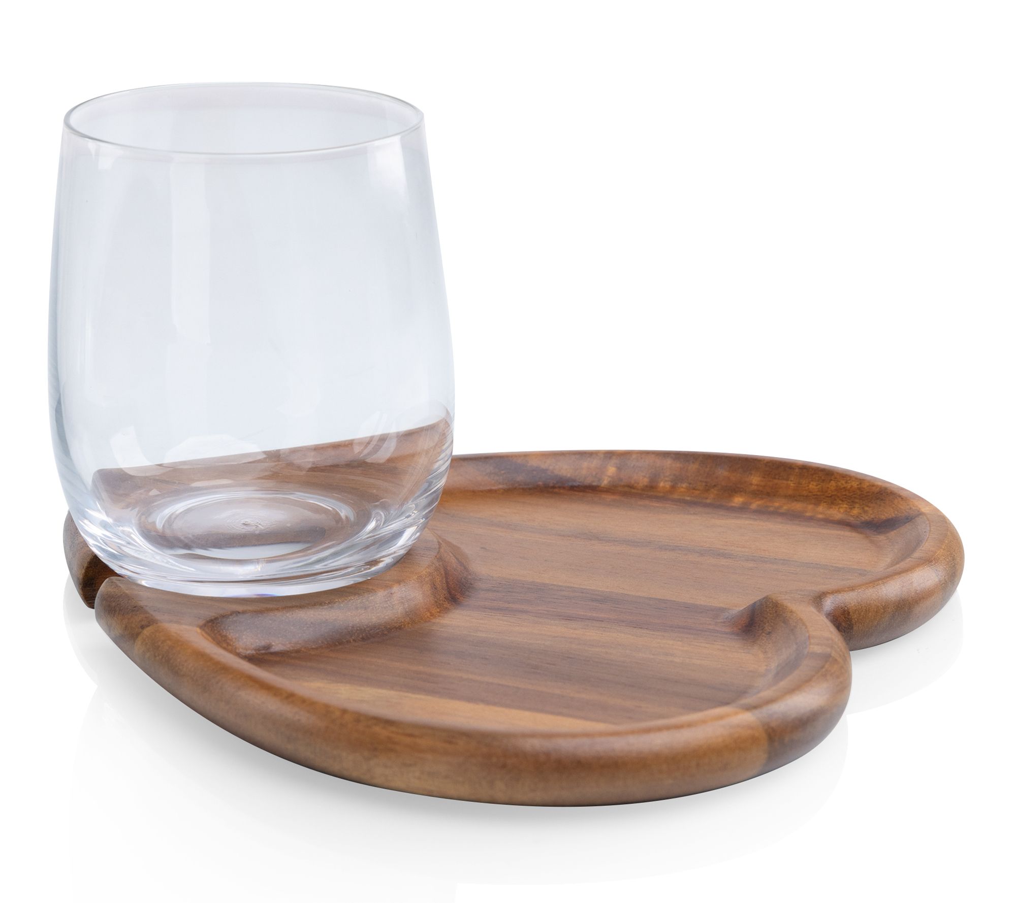Raise your next gathering with this heart-shaped wine appetizer plate set, thoughtfully crafted for easy mingling. Let guests enjoy their favorite bites and keep their wine glass close at hand thanks to a clever built-in stem holder. Each acacia wood tray turns cocktail hour or wine tasting into a special, hands-free experience. From Toscana.