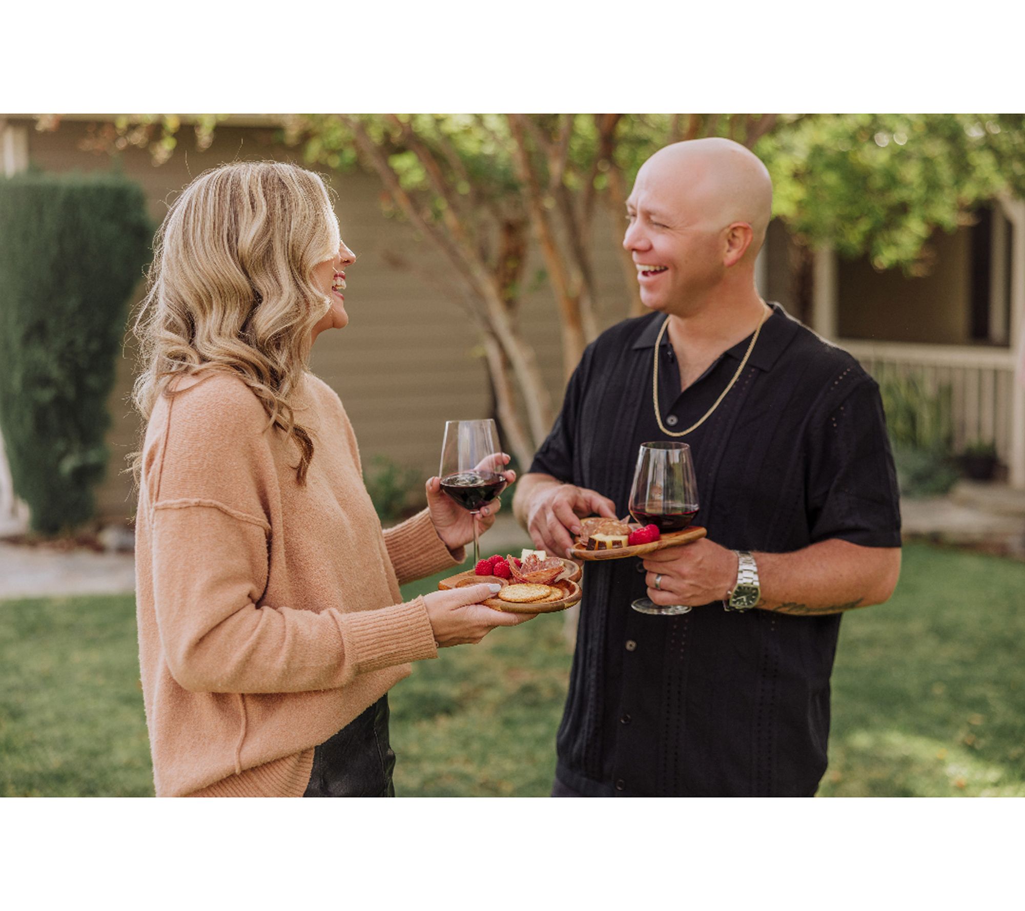 • Each tray features a built-in wine glass holder and perimeter ridge to help stabilize snacks