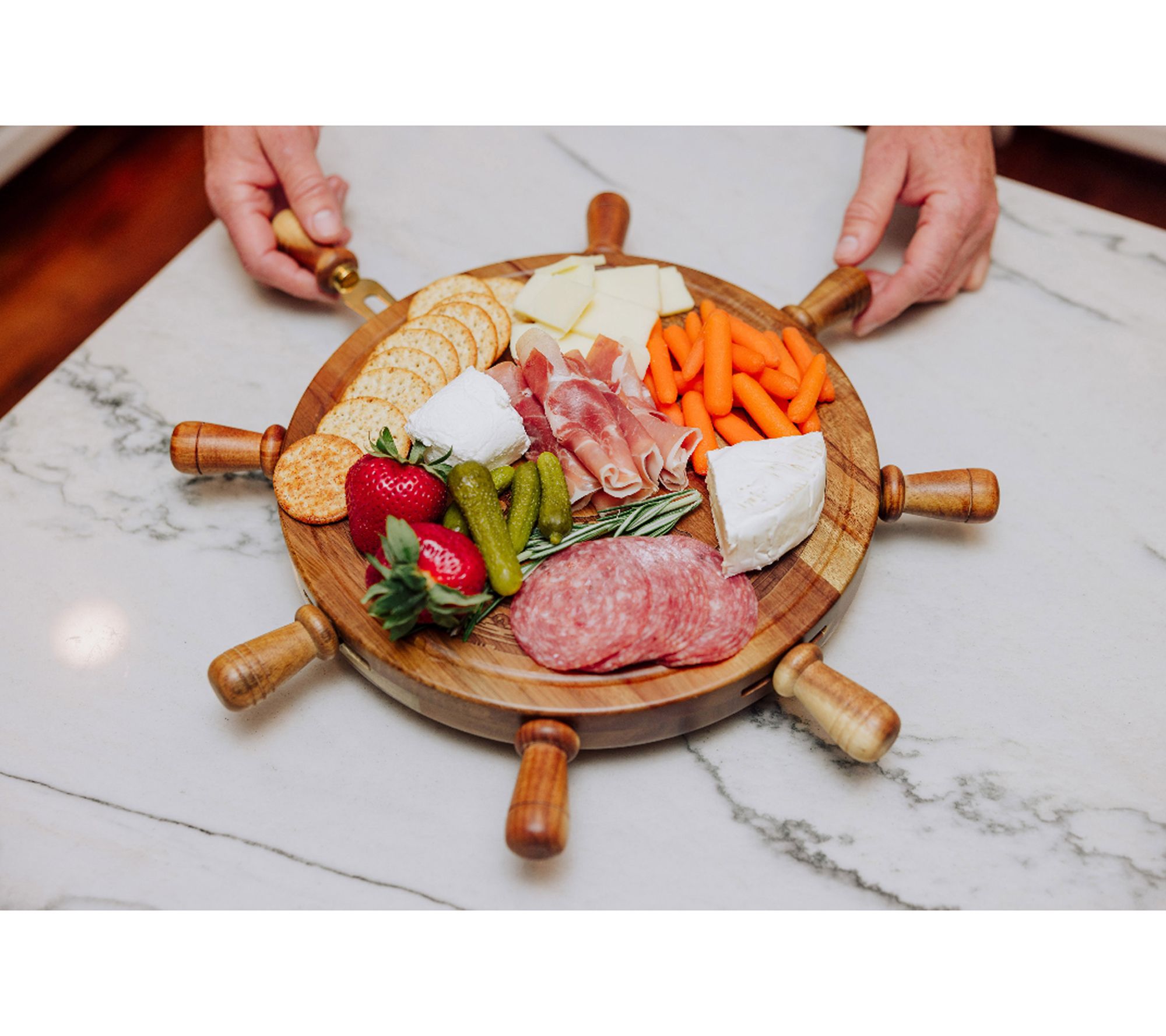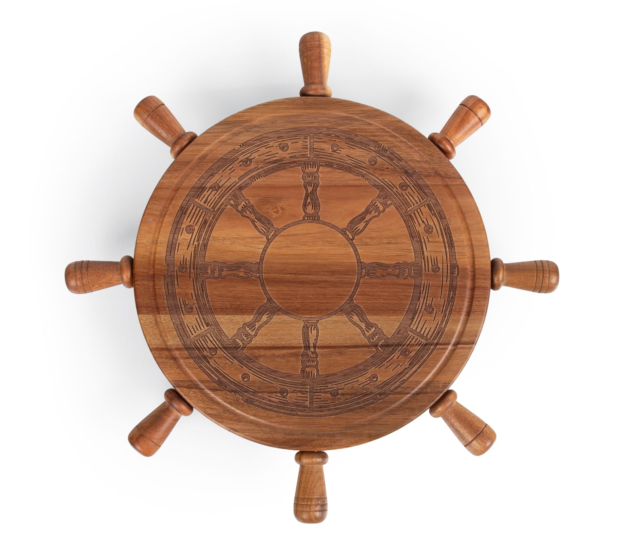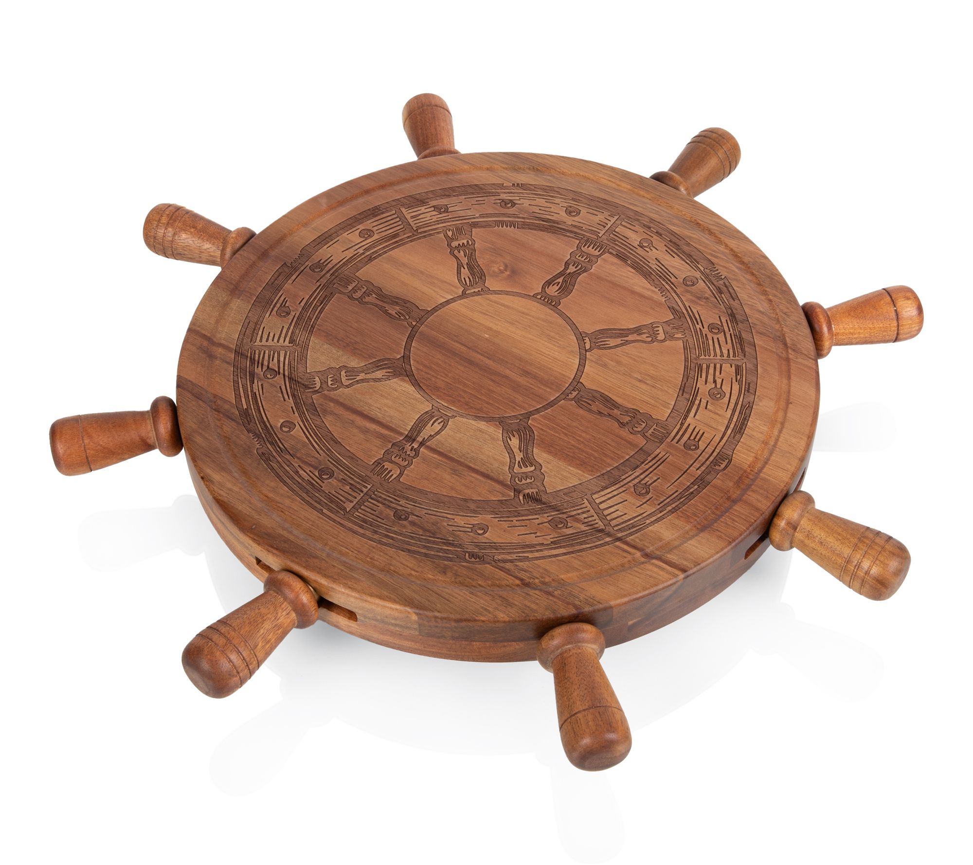 Serve up a spread your guests will remember with this Lazy Susan charcuterie cheese board and tool set. Its rotating design lets everyone reach their favorite treats, while the nautical steering wheel pattern adds a fun touch to gatherings by the ocean or cozy nights in. A recessed groove catches juices for easier cleanup. From Toscana.