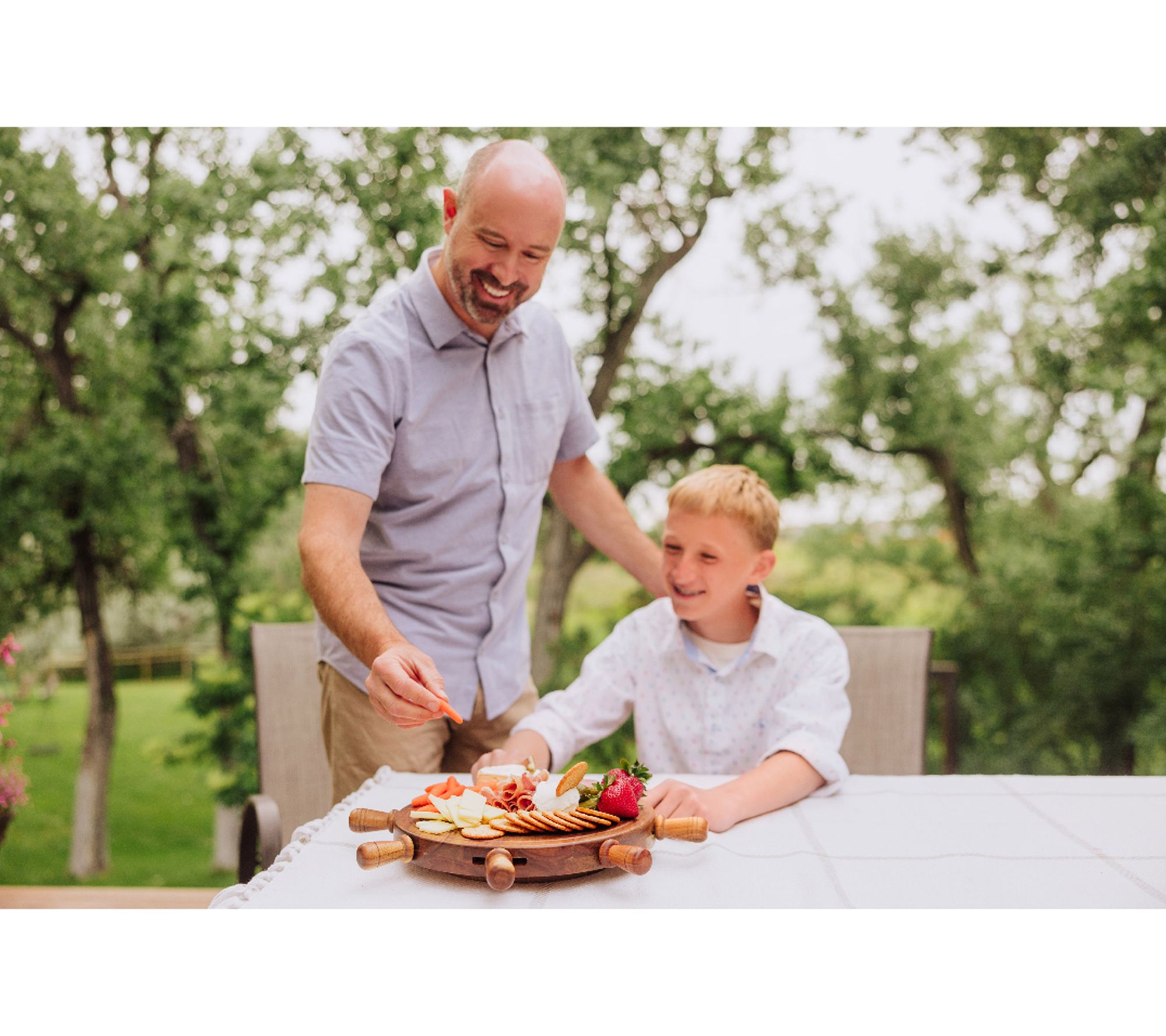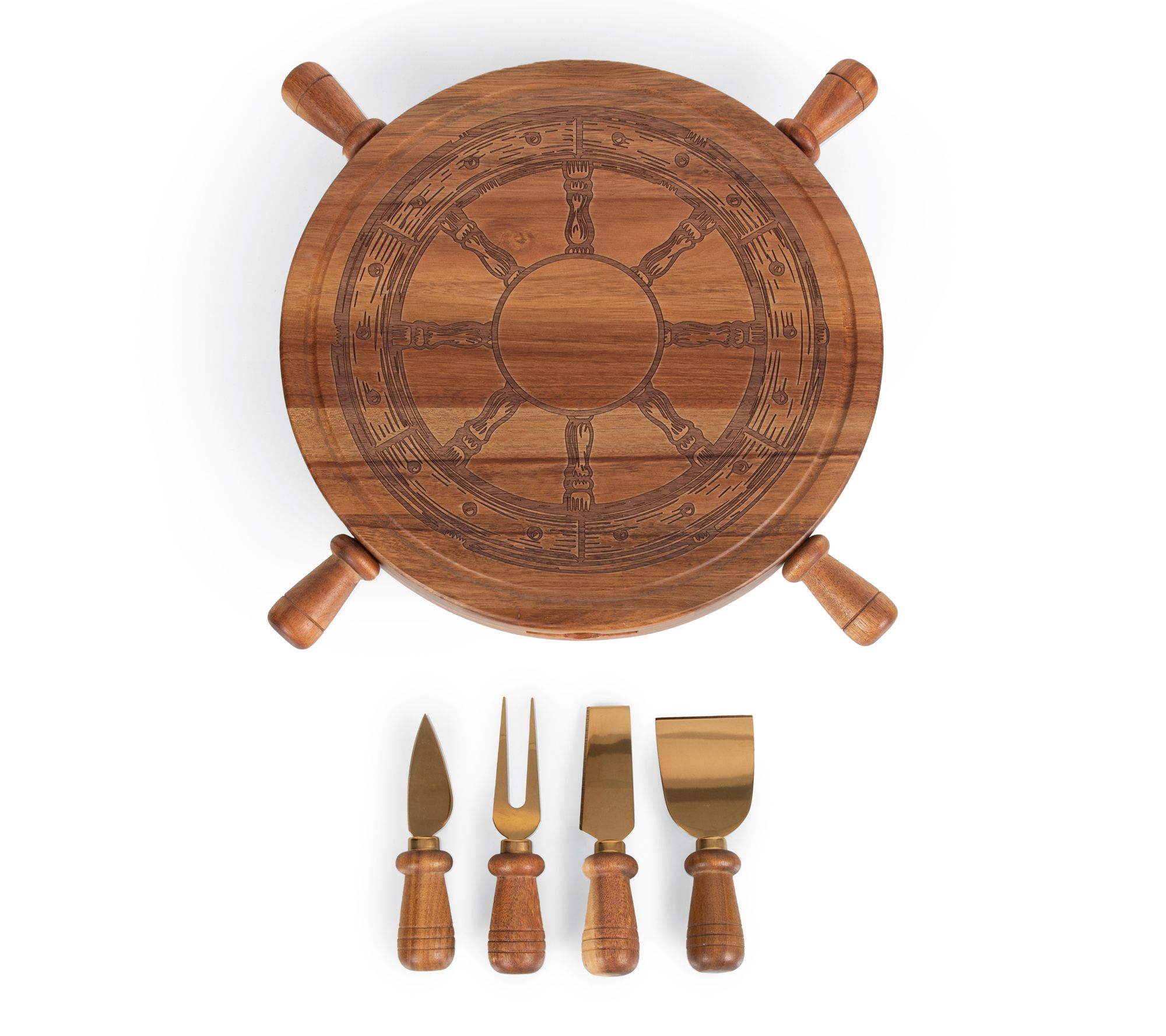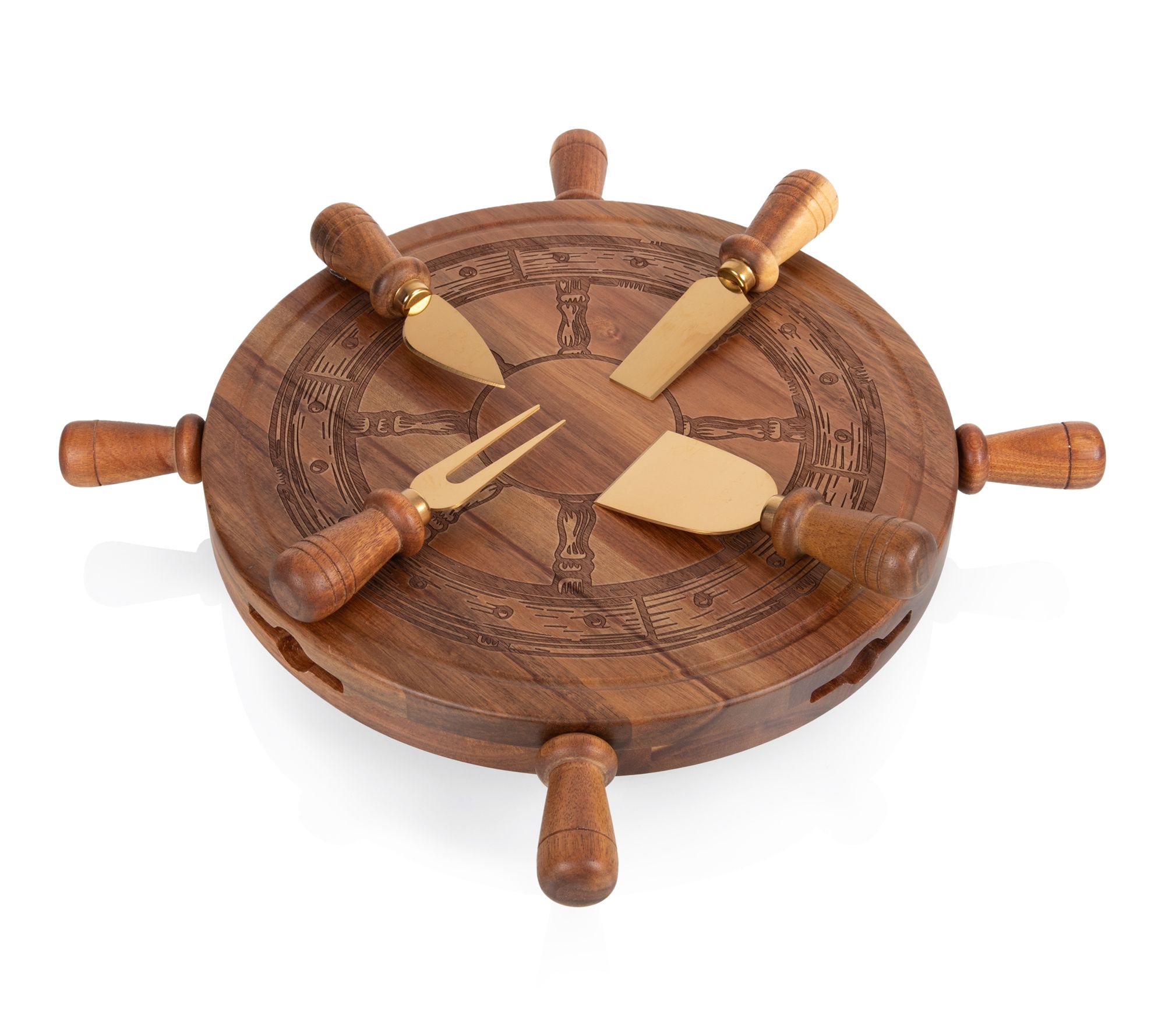 Serve up a spread your guests will remember with this Lazy Susan charcuterie cheese board and tool set. Its rotating design lets everyone reach their favorite treats, while the nautical steering wheel pattern adds a fun touch to gatherings by the ocean or cozy nights in. A recessed groove catches juices for easier cleanup. From Toscana.