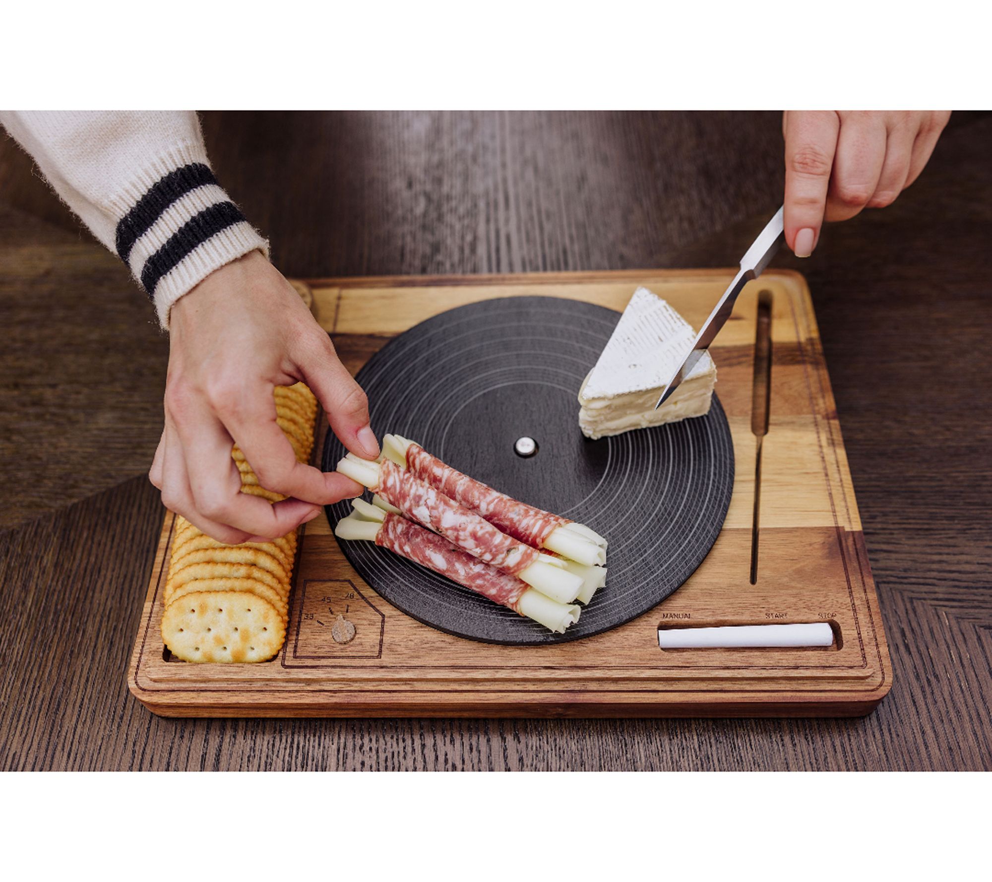 • Includes wood board, lazy susan tray, cheese knife, and chalk