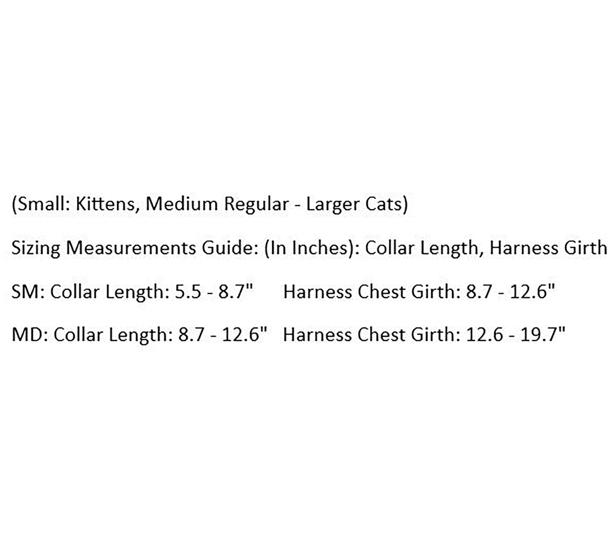 • Measures approximately: Small collar length 5.5" - 8.7"; Small harness chest girth 8.7" - 12.6"; Medium collar length 8.7" - 12.6"; Medium harness chest girth 12.6" - 19.7"