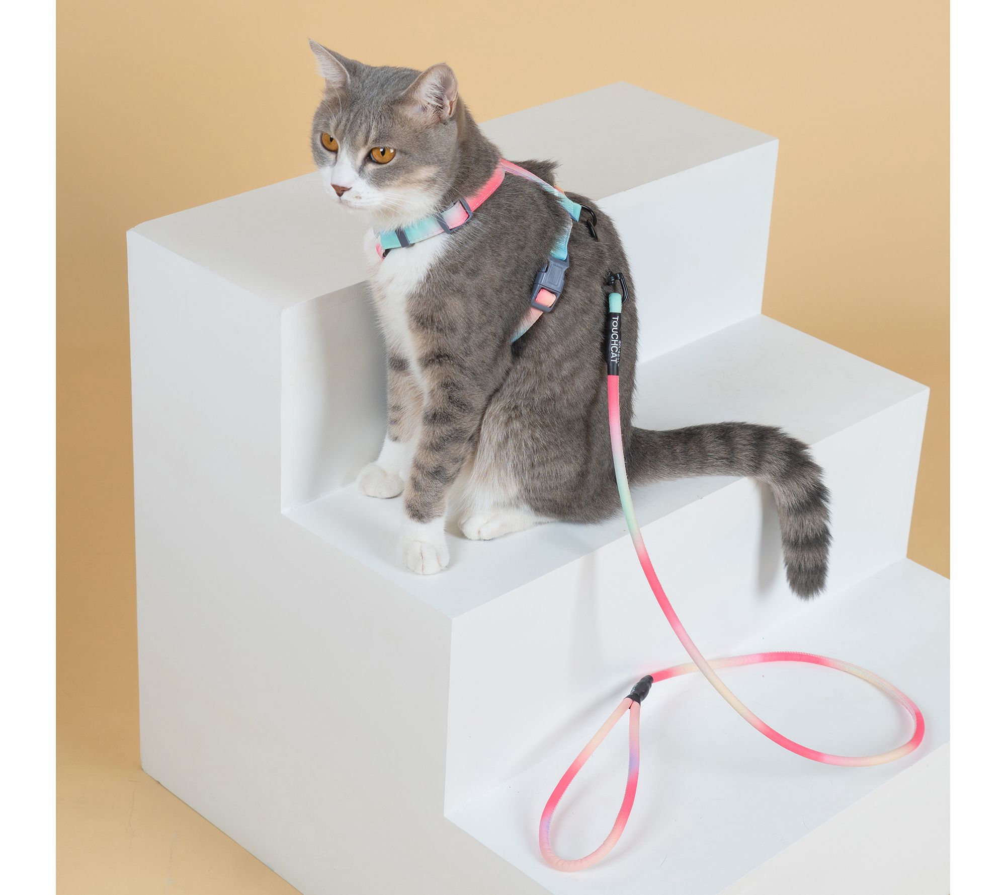 Your cat's daily walks will be a fashion-forward affair with the Touchcat rainbow patterned cat harness and leash. Designed for comfort and durability, it features dual-reinforced stitching and adjustable loops for even-weight distribution. The stainless steel leash connecting ring and swivel hook ensure a multi-directional pull, making strolls enjoyable for both you and your feline friend. From Touchcat.