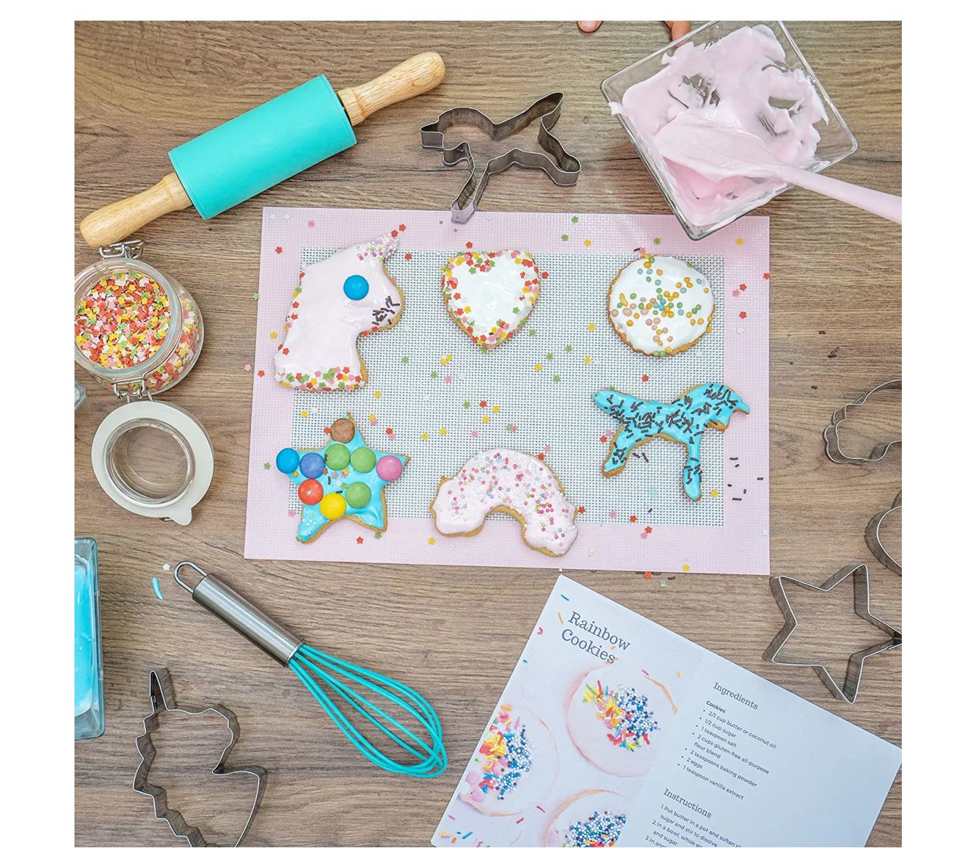 • Includes nylon dinosaur apron, whisk, rolling pin, six cookie cutters, piping bags, icing tips, spatula, small silicone baking mat, cookie recipe, frosting recipe, and storage case