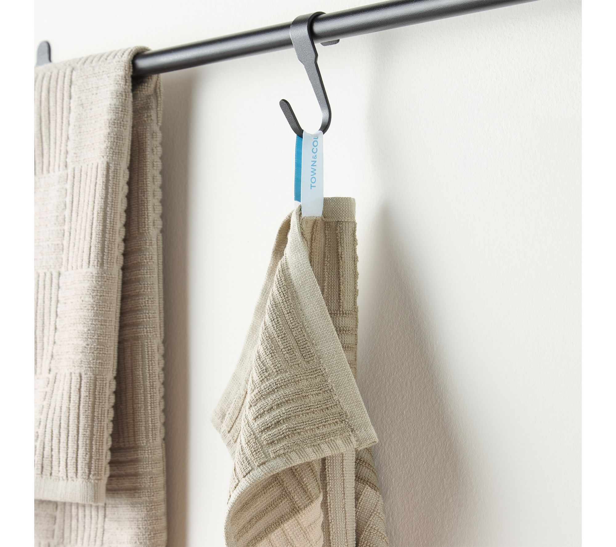 Transform everyday kitchen tasks with this set of basketweave kitchen towels, offering quick-drying absorbency and easy cleaning for everything from spills to drying dishes. The modern color block design adds a stylish touch, while convenient hang loops make them easy to display or keep within reach during busy meal prep. From Town & Country Basics.