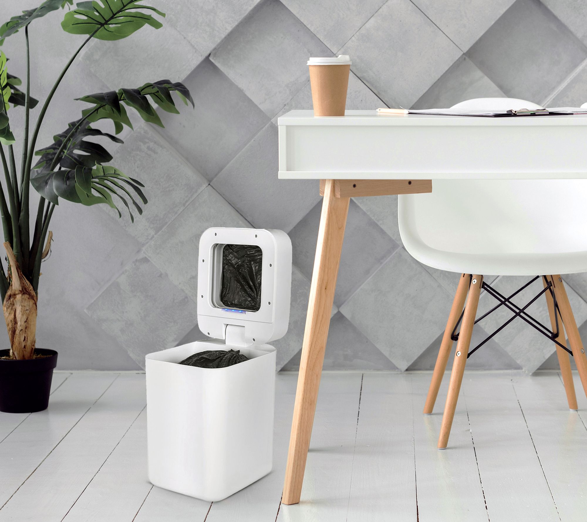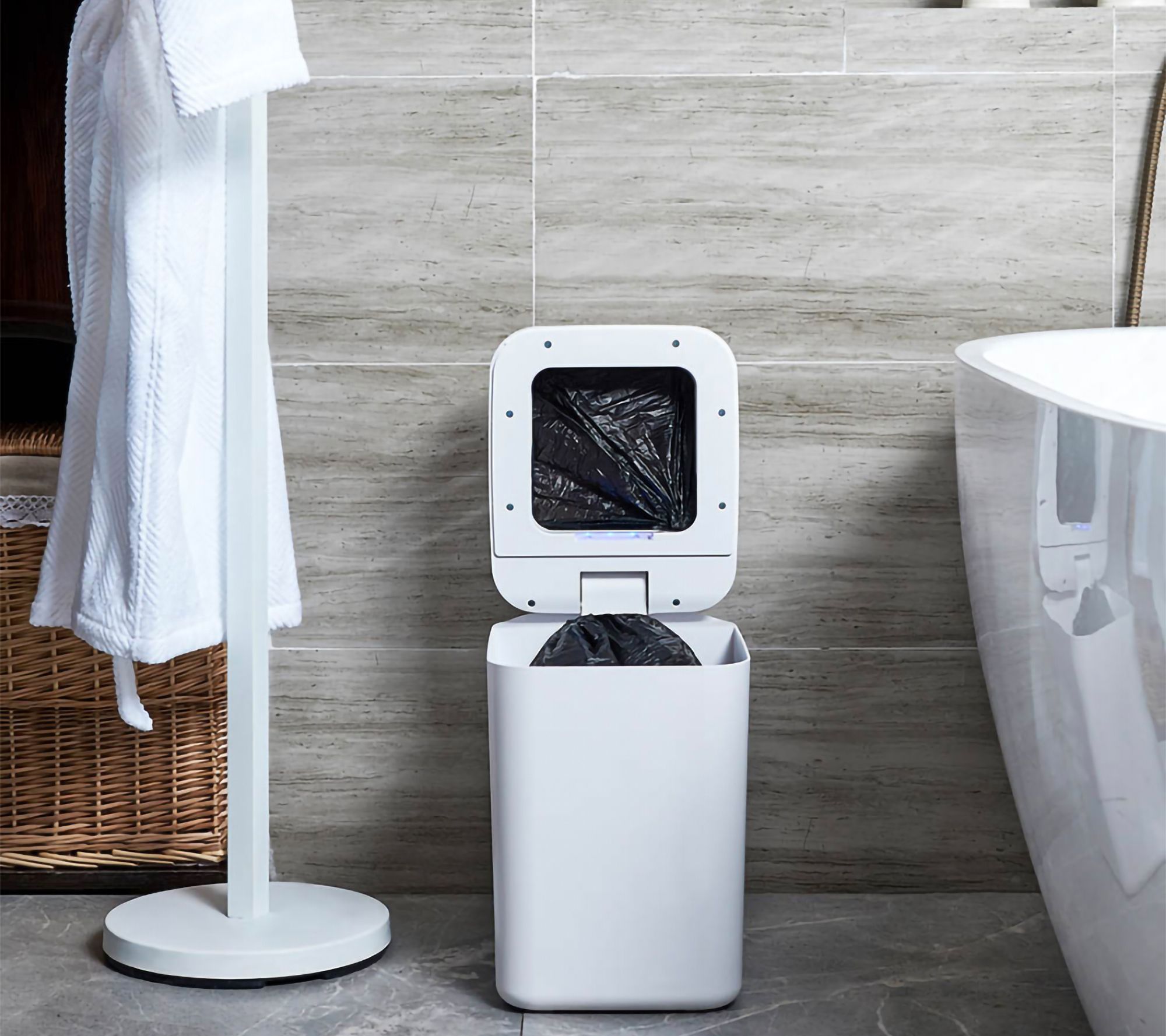 • Includes trash can, two refill rings each with 25 liners, and charging adapter