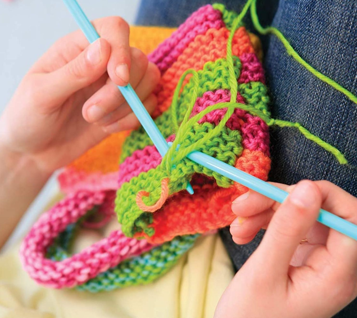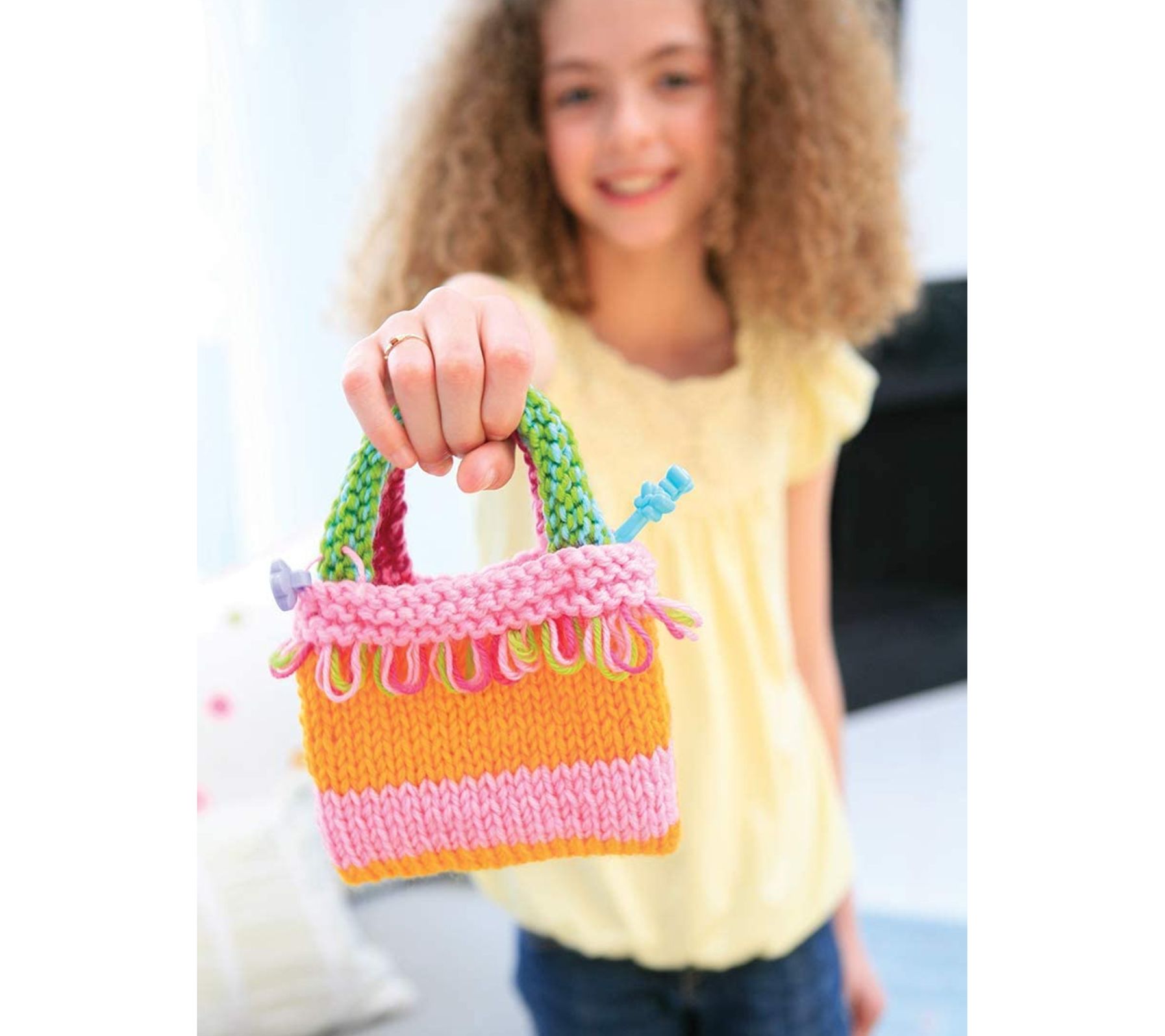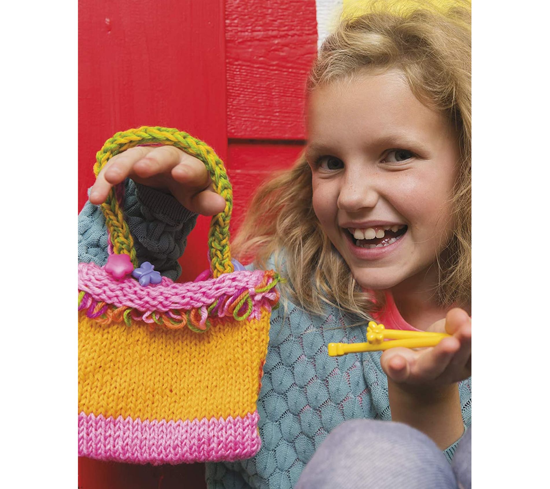 • Includes pair of knitting needles, plastic sewing needle, seven colored yarns, four buttons, and instructions