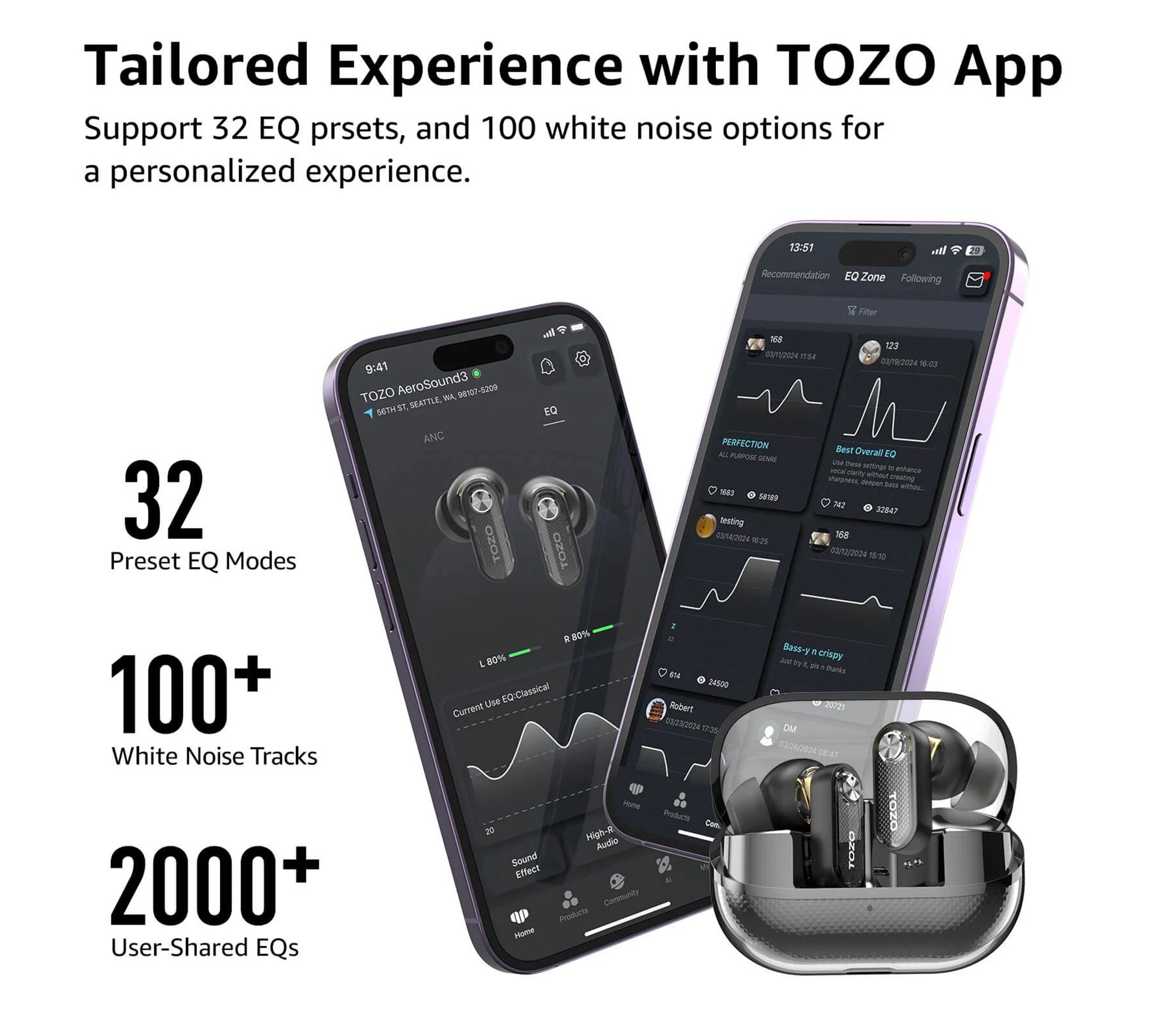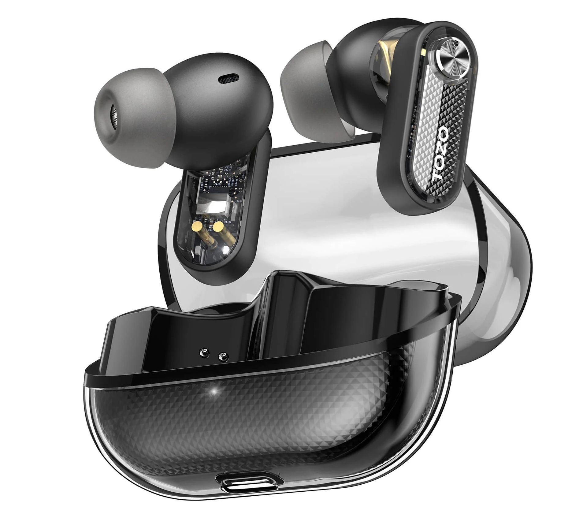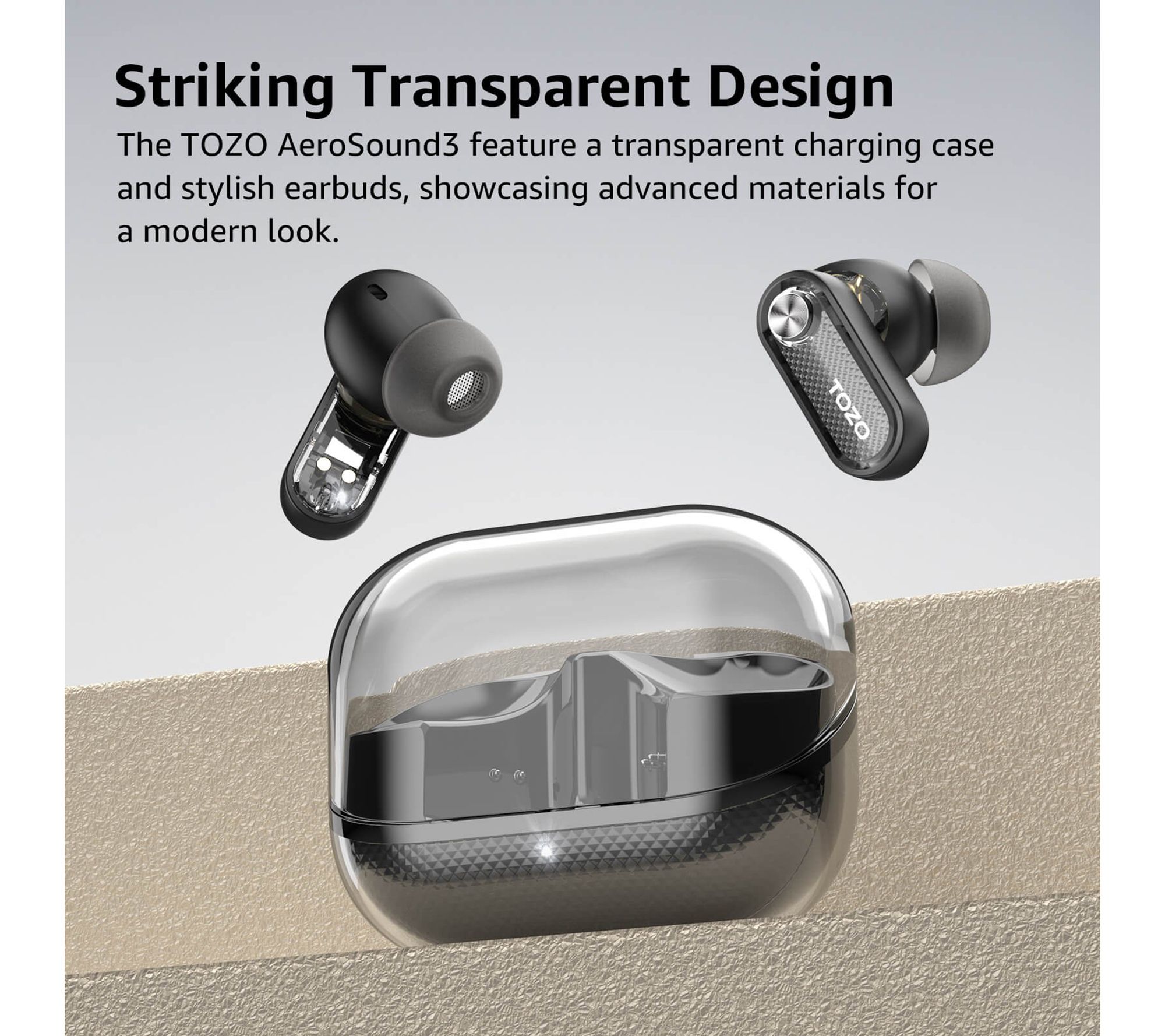 Experience the convenience of wireless listening with TOZO Aerosound 3 Wireless Earbuds. The sleek transparent design blends modern aesthetics with advanced technology, making them a must-have accessory for on-the-go use. Enjoy a personalized listening experience anywhere with hybrid active noise cancelling. From TOZO.