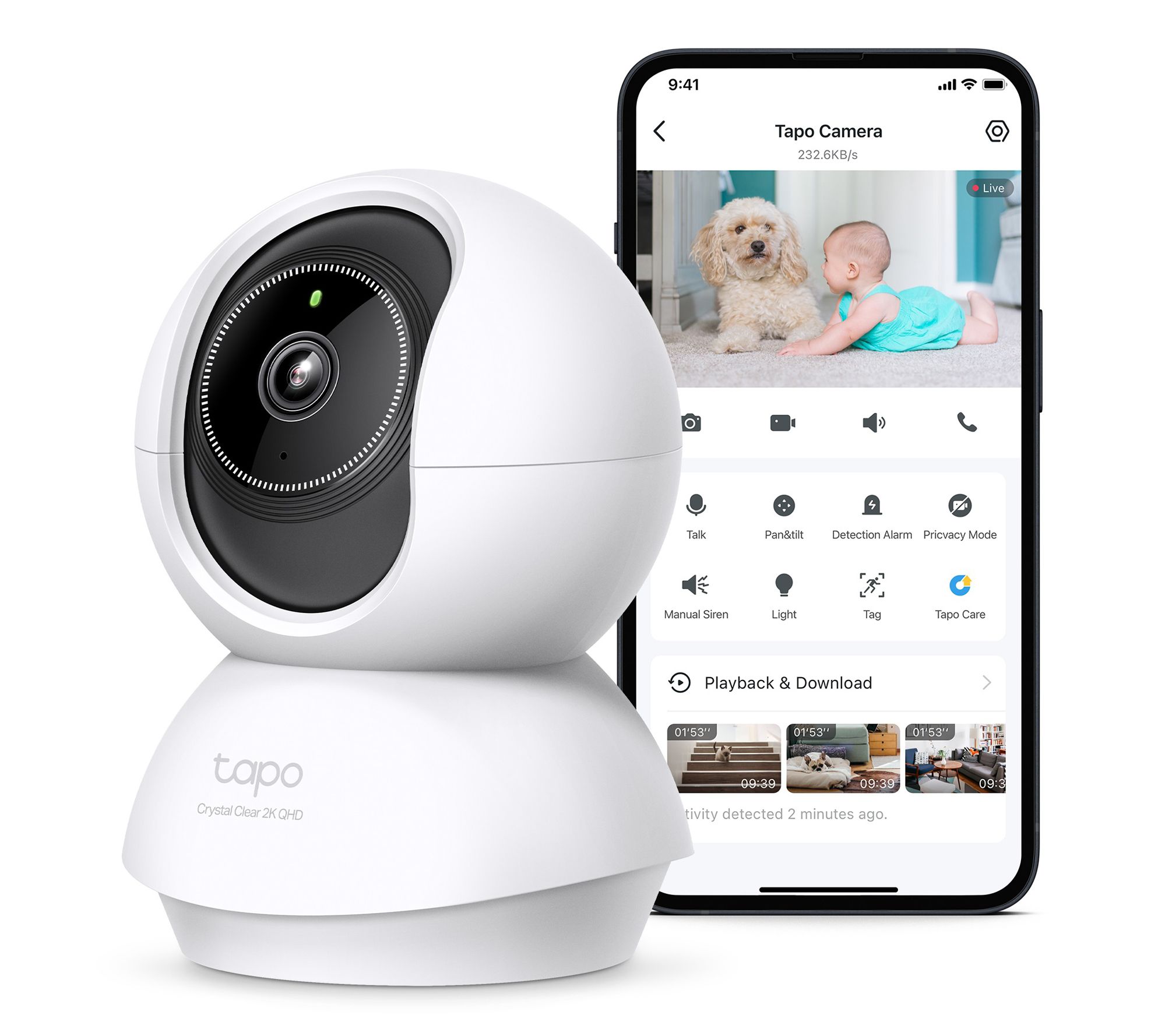 TCB72 camera with base: 2K 4MP HD resolution, pan/tilt, night vision, two-way audio, motion tracking, AI detection