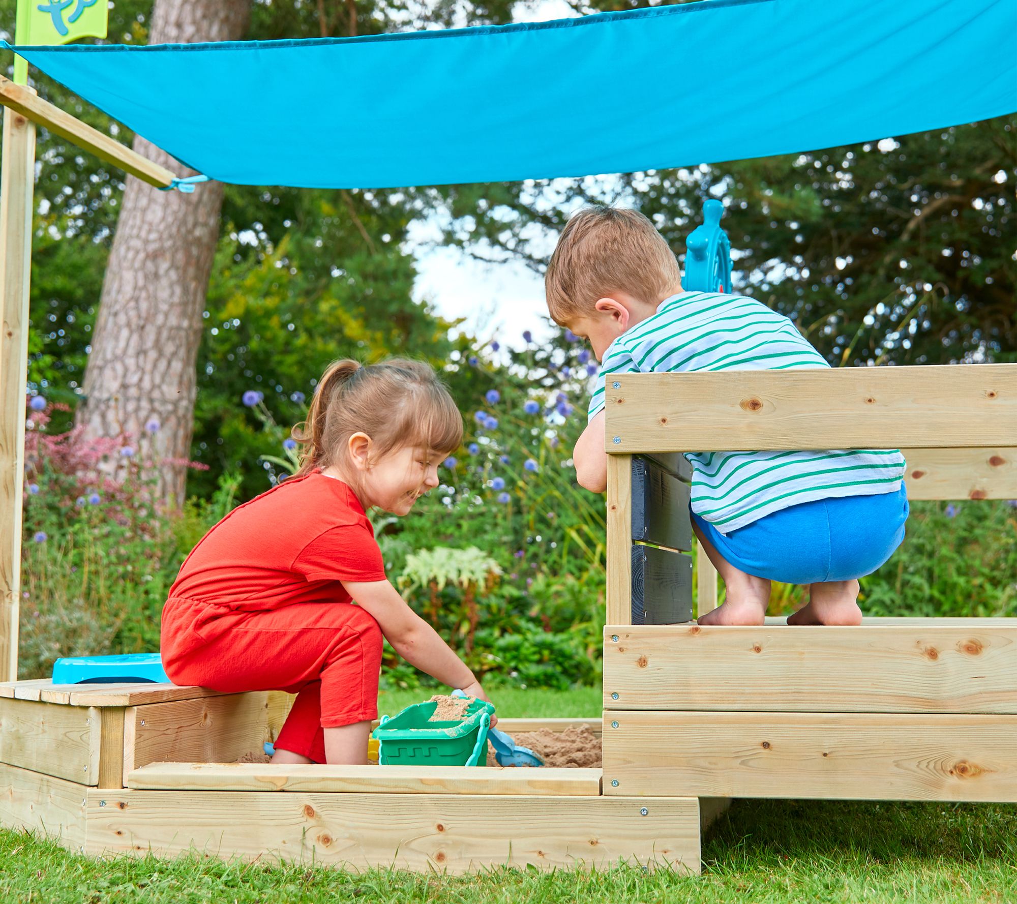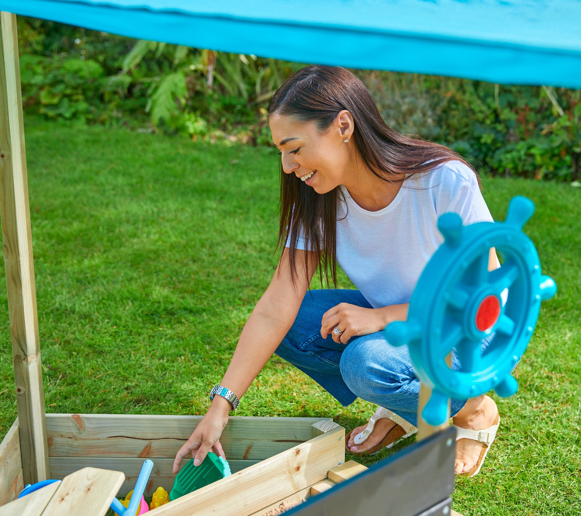 Something's afloat with this wooden play boat. Not only does the design include a captain's wheel and chalkboard, but it extends to reveal a hidden sandpit -- the perfect place to dig for buried treasure! From TP Toys.
