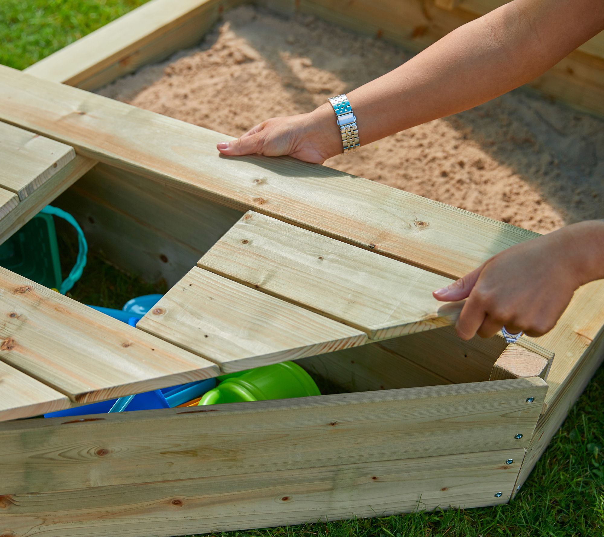 • Measurements: Compact 48"L x 36"W x 46"H; Extended 70"L x 36"W x 46"H; Sand pit 24" x 30"