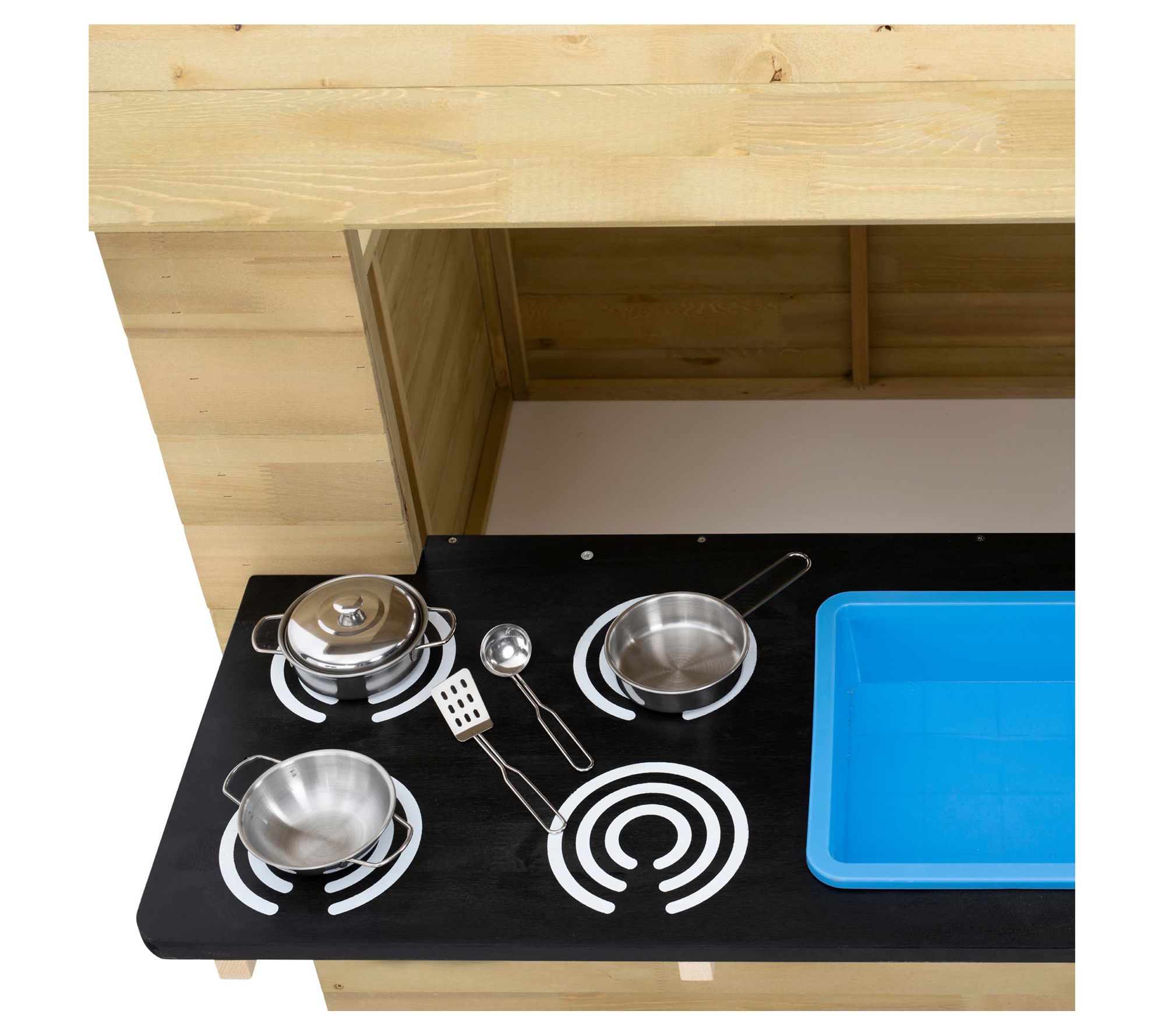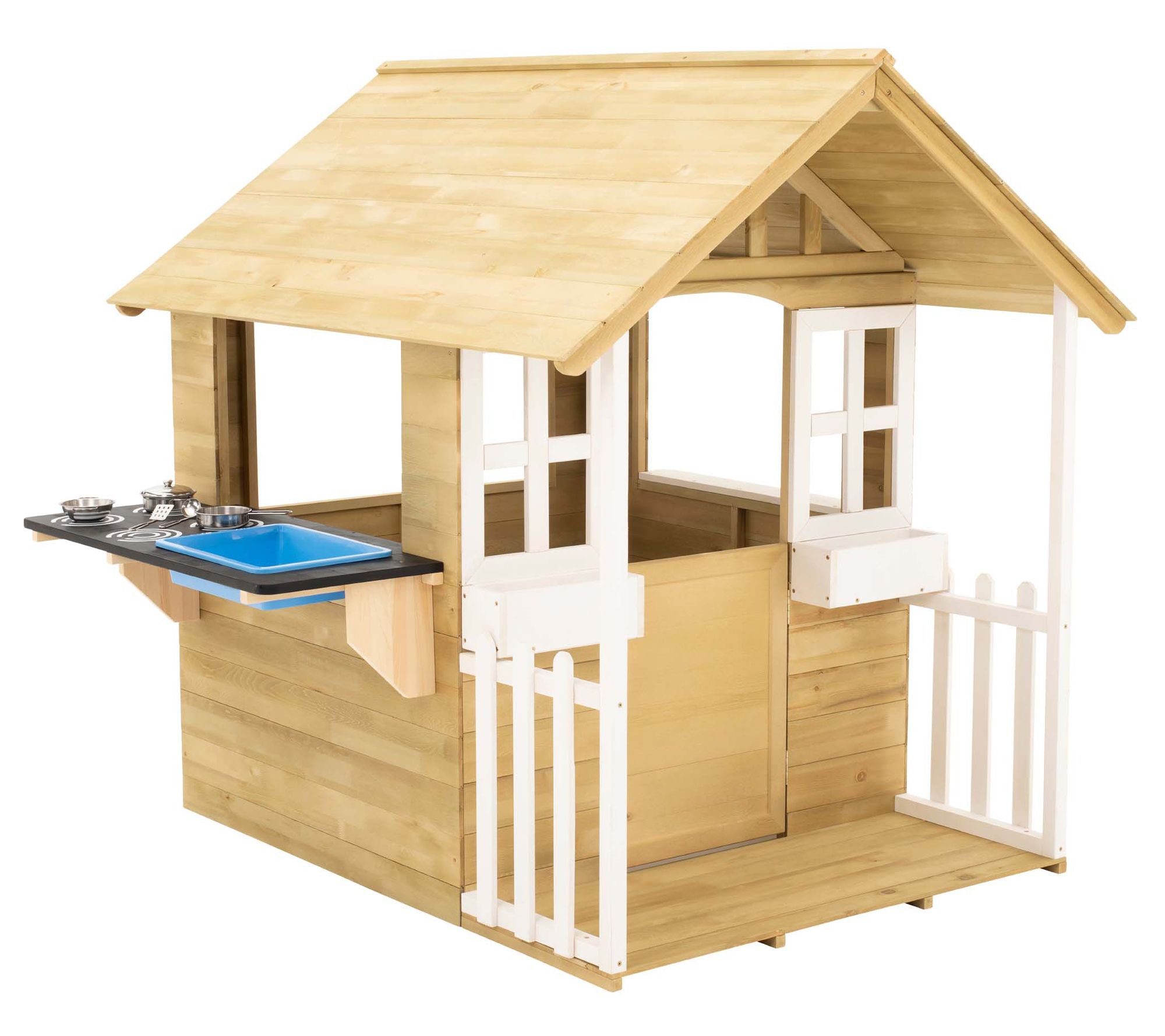 • Includes wooden playhouse with kitchen extension that includes painted stove tops, plastic sink, pots, and utensils