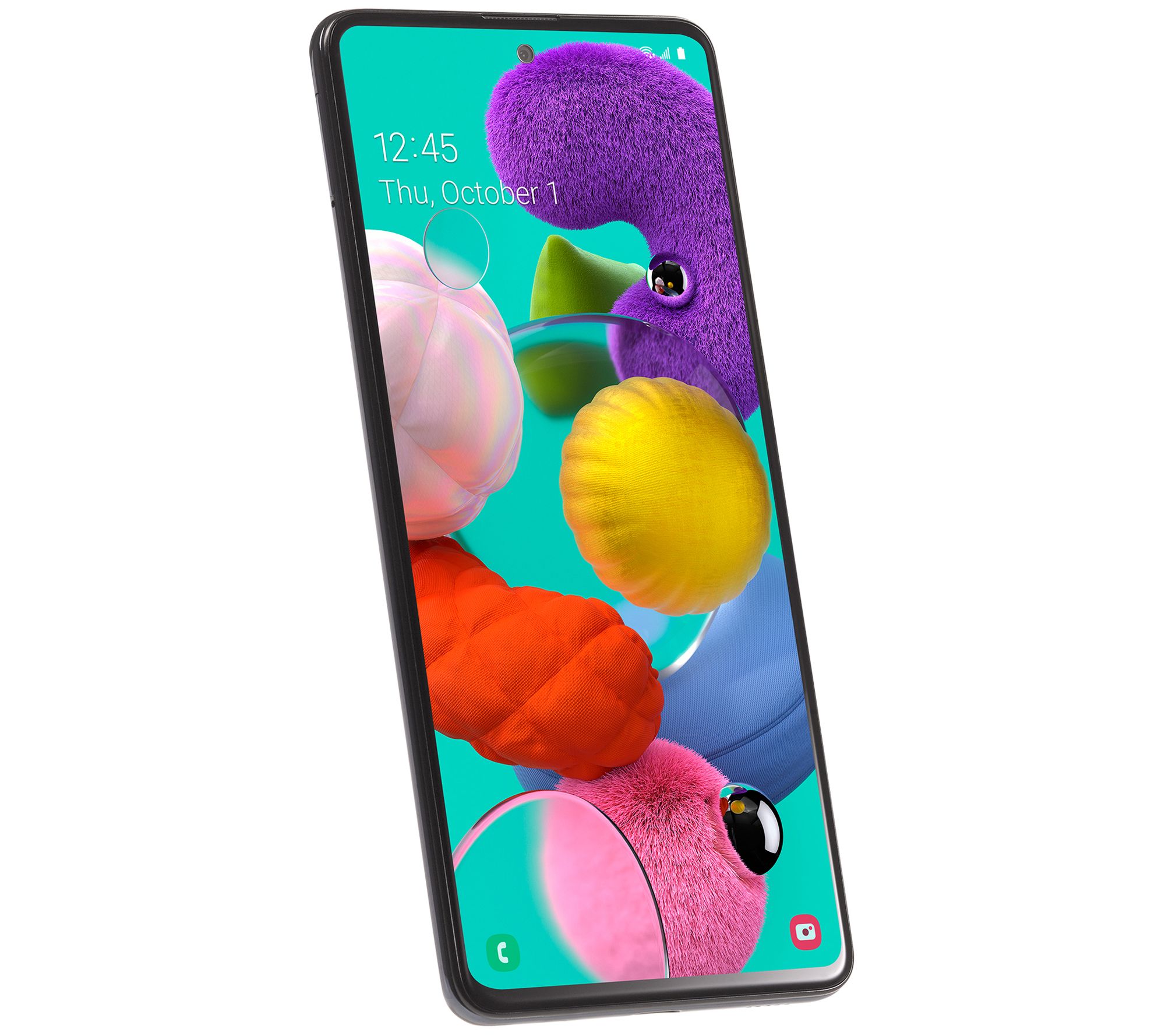 Includes Samsung Galaxy A51 smartphone with one year of service/1,500 minutes/1,500 texts/1.5GB data; car charger, Clickr grip and stand, and voucher