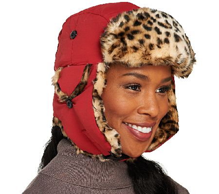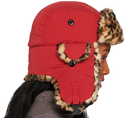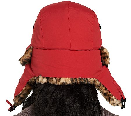 • Features: water-repellant nylon shell, long side flaps in leopard print faux fur, adjustable chin snap closure, two buttons outside ear flaps