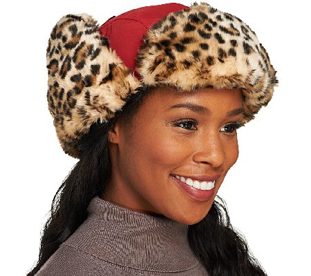 Trap in warmth and style with this water-repellant trapper-style hat. Leopard print faux fur is featured on the front and lining of the long side flaps to help keep your ears toasty warm and your fashion on-trend. Choose to wear the flaps down, or flip them up for a different look.