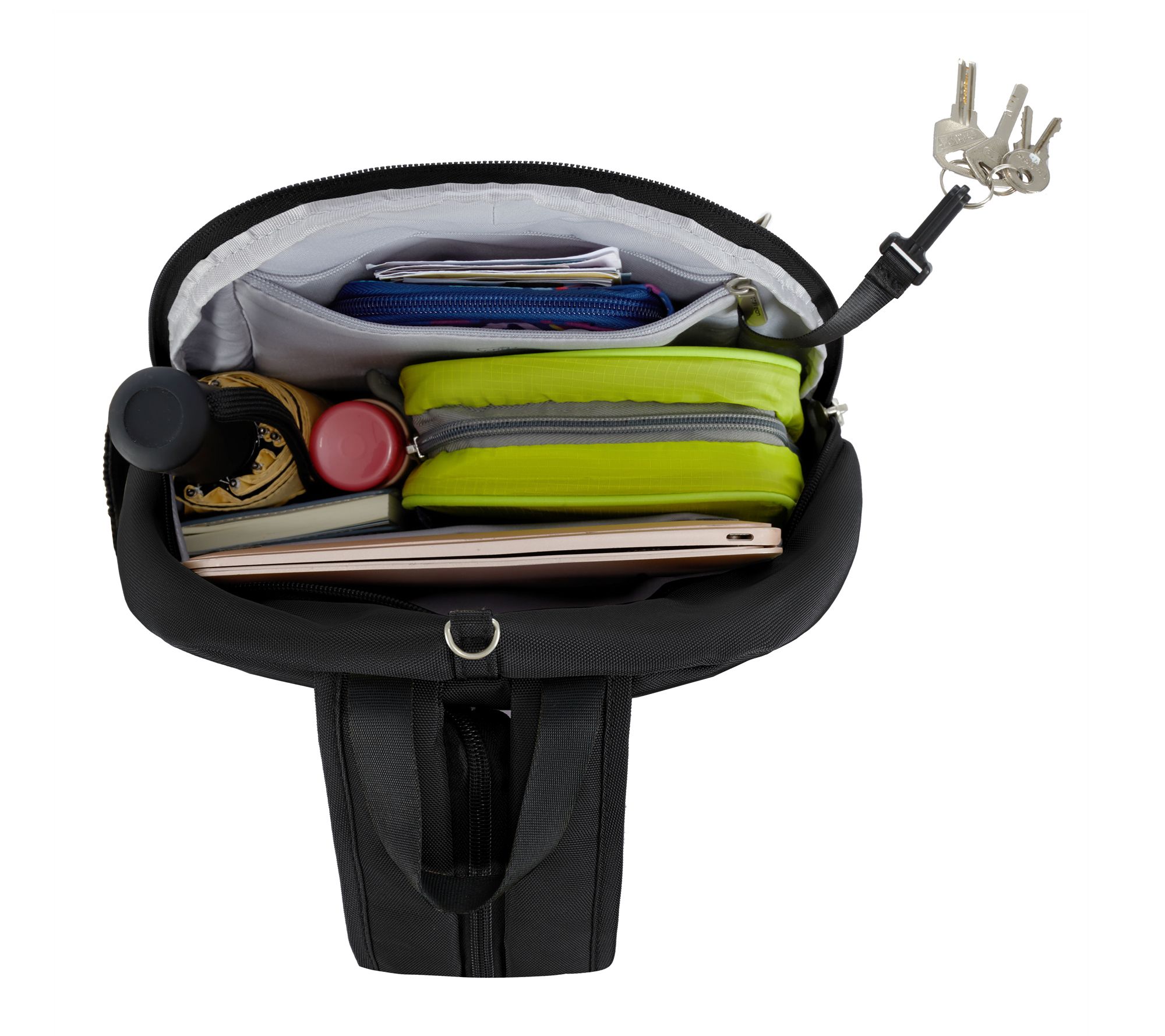 • Roomy main compartment with padded sleeve holds an 11" tablet, zippered pocket, large drop pocket, tethered key clip